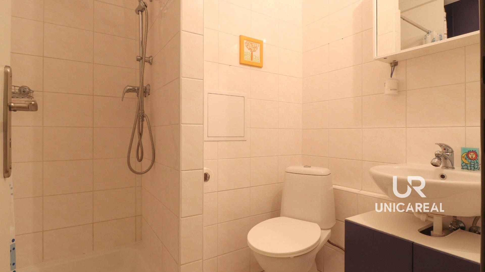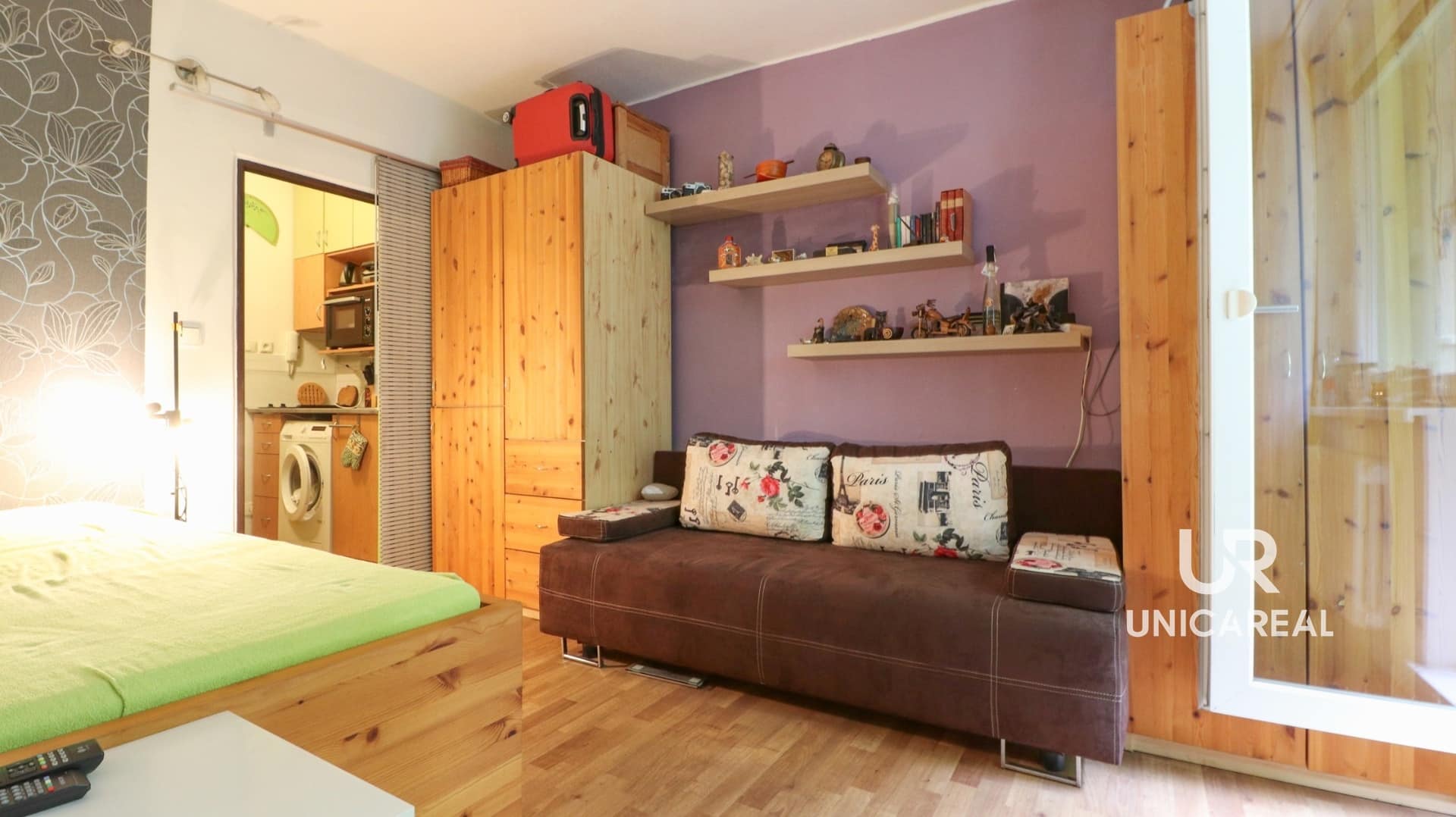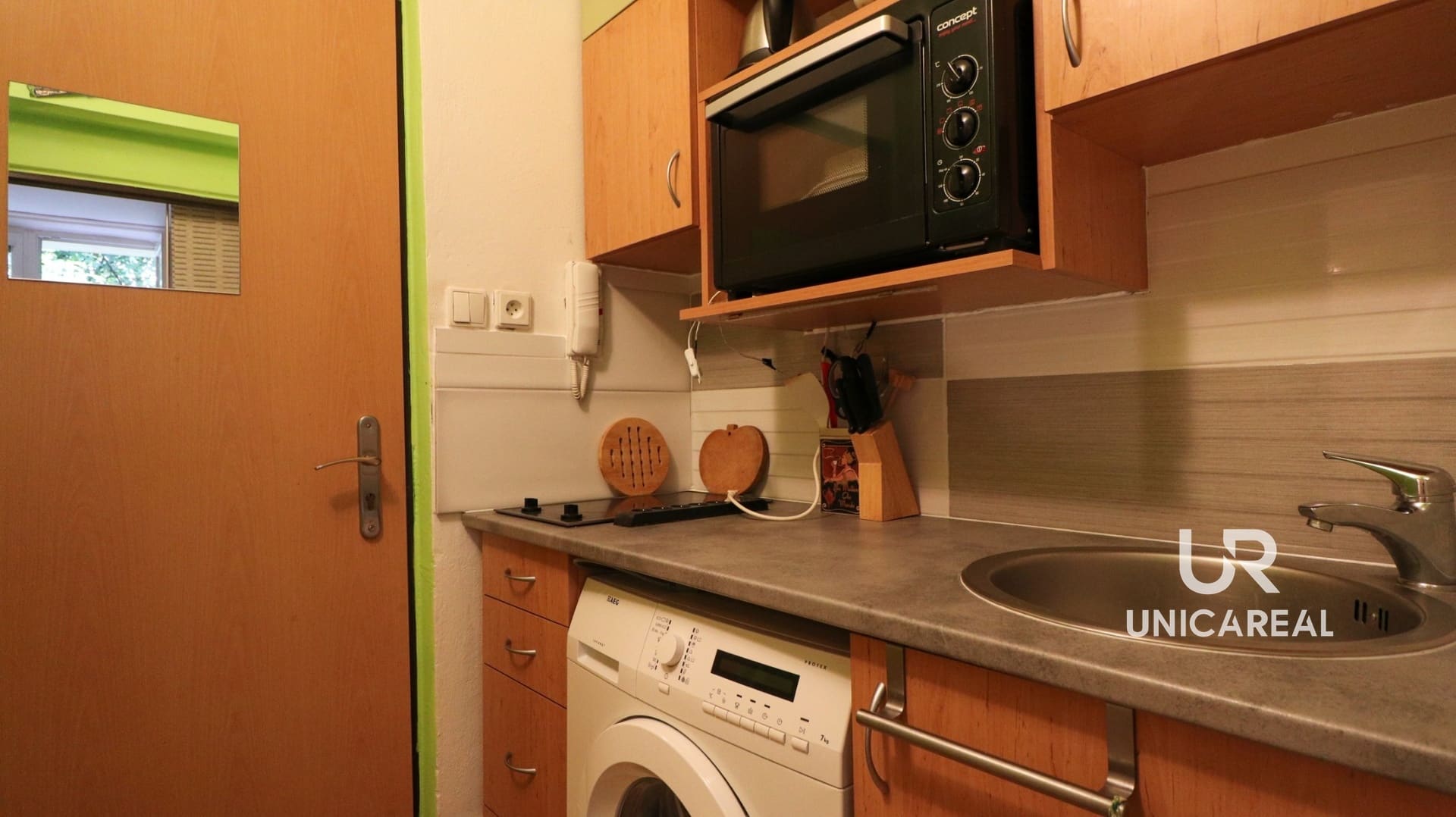 Dispozici bytu tvoří plně vybavený obývací pokoj 13 m2 se světlou vinylovou podlahou, chodba s kuchyňským koutem 3 m2, koupelna se sprchovým koutem, umyvadlem a toaletou 3,5 m2 .