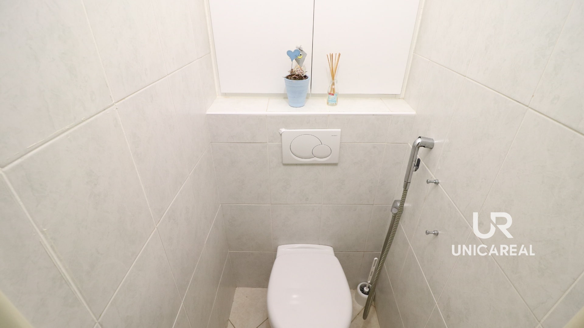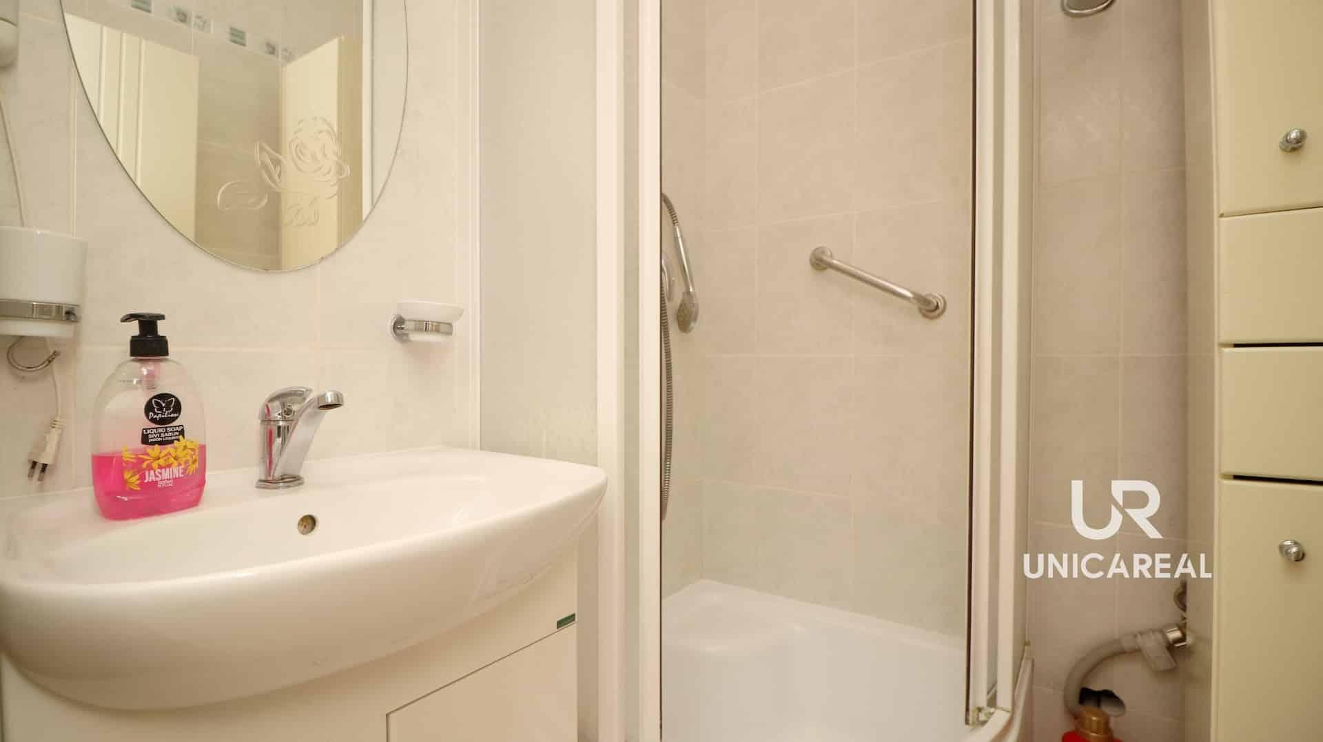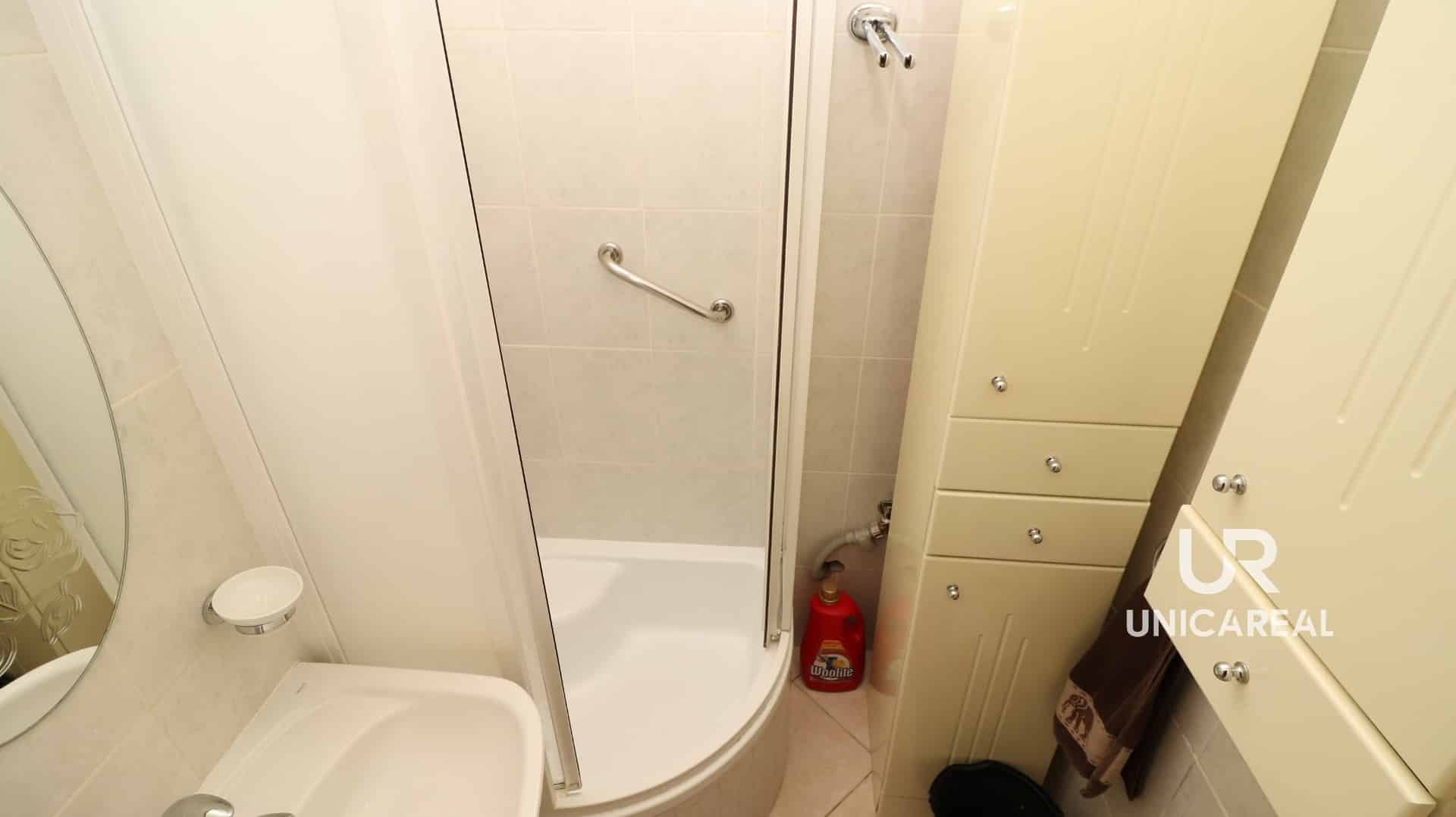 Malá, ale praktická koupelna 2m2 nabízí sprchový kout, umyvadlo a úložné skříňky. Toaleta je potom samostatná.