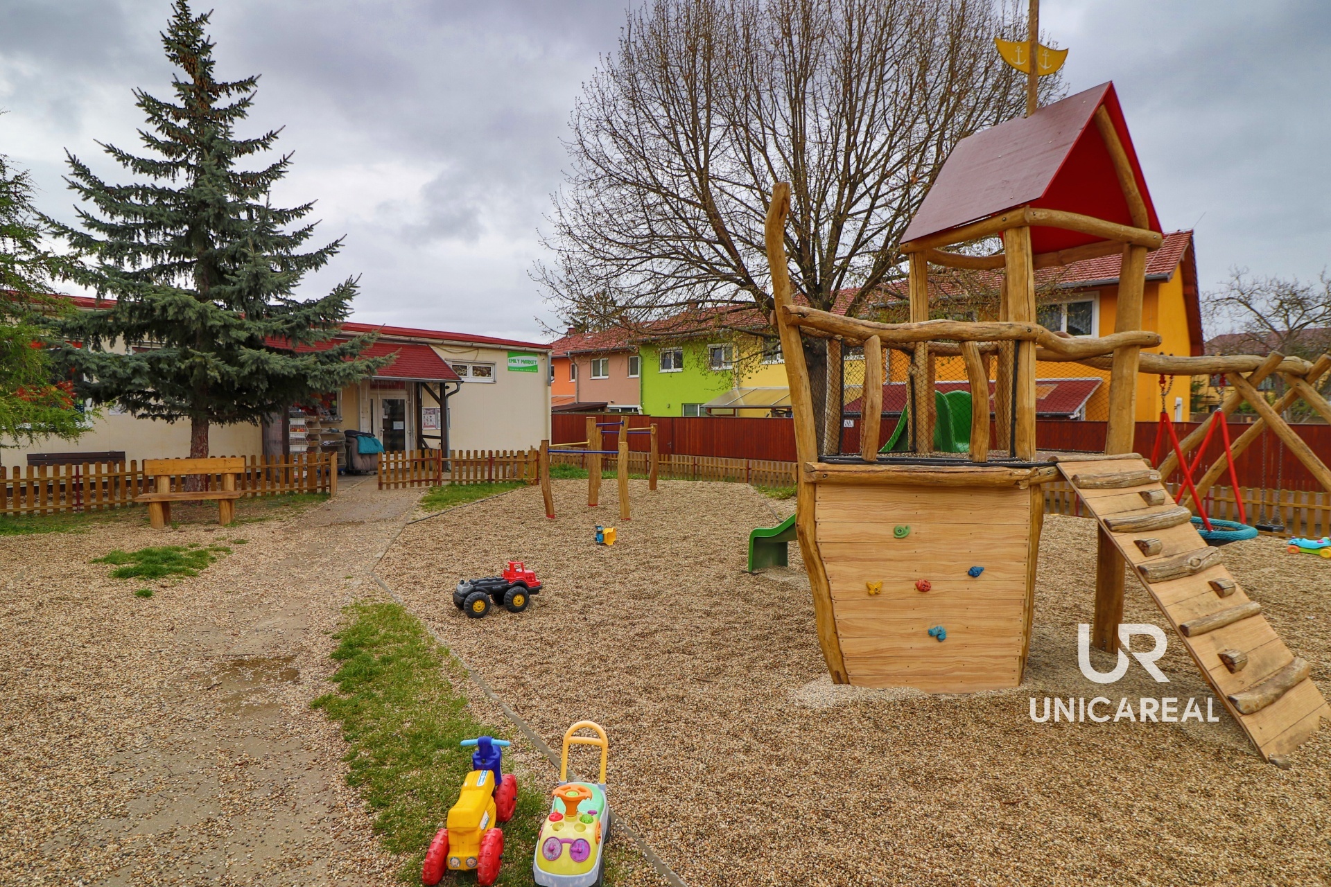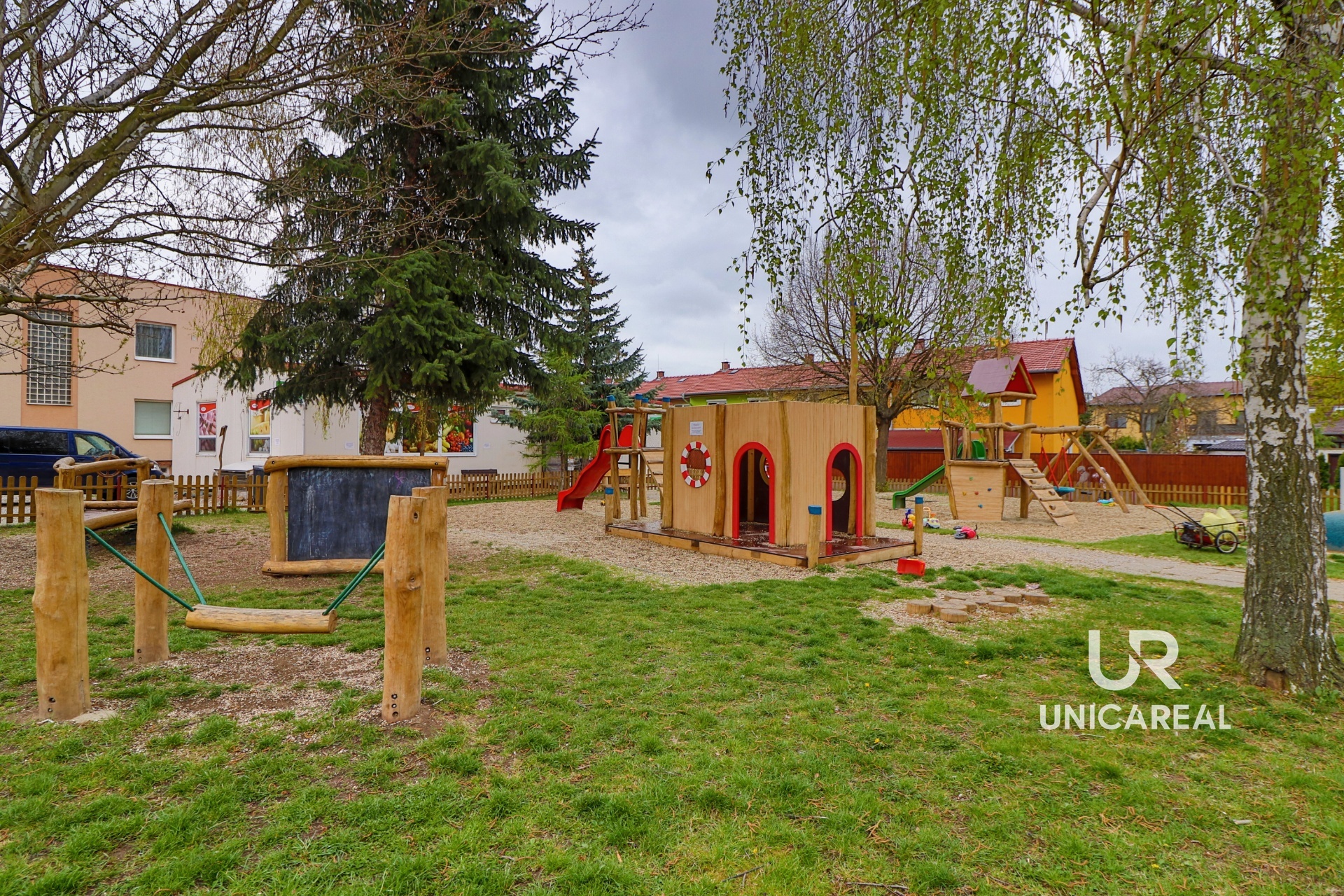 Před vchodem do bytového domu jsou nejen parkovací místa, ale také dětské hřiště a zeleň.