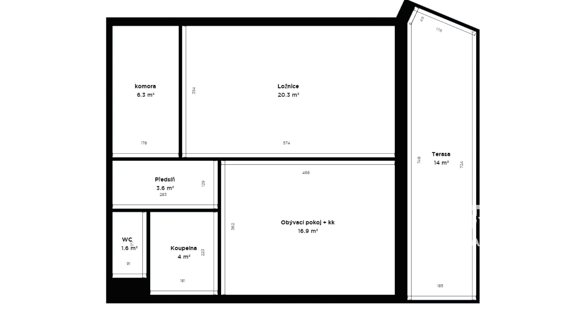 V bytě se nachází dva pokoje 20 m2 a 17 m2, z obou lze vyjít na terasu, dále koupelna 4 m2 s vanou a umyvadlem, samostatná toaleta, chodba i pohodlně velká šatna 6 m2, ideální pro uložení vašich věcí s možností využití jako pracovní kout.