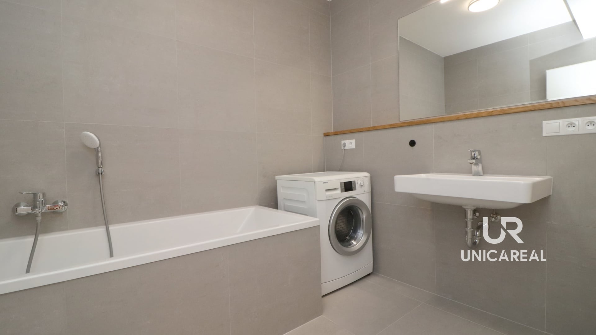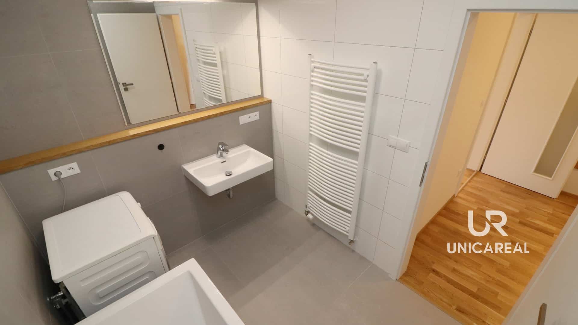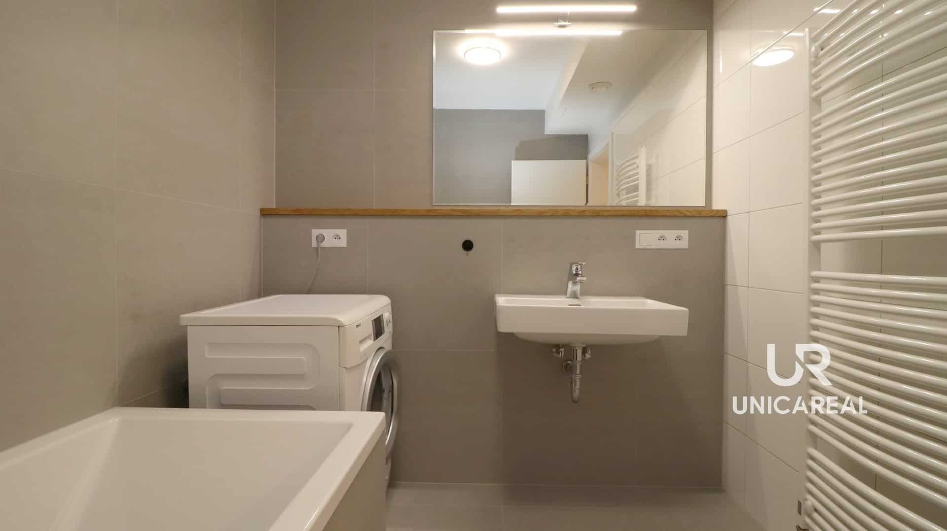 V prostorné, ale především praktické koupelně 5 m2 s vanou nechybí velkoformátová dlažba ani místo pro pračku.