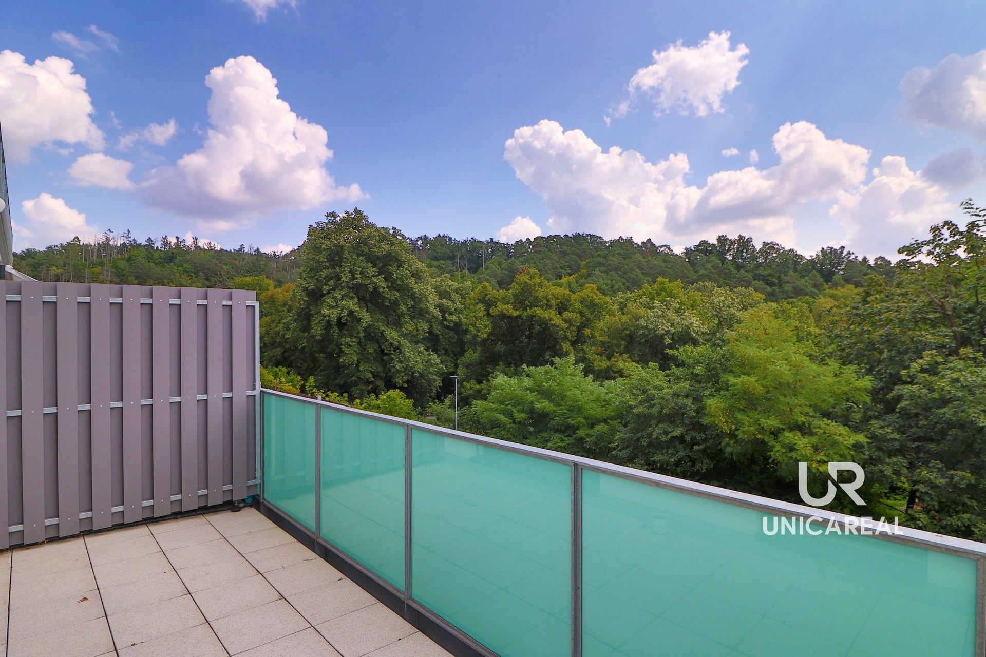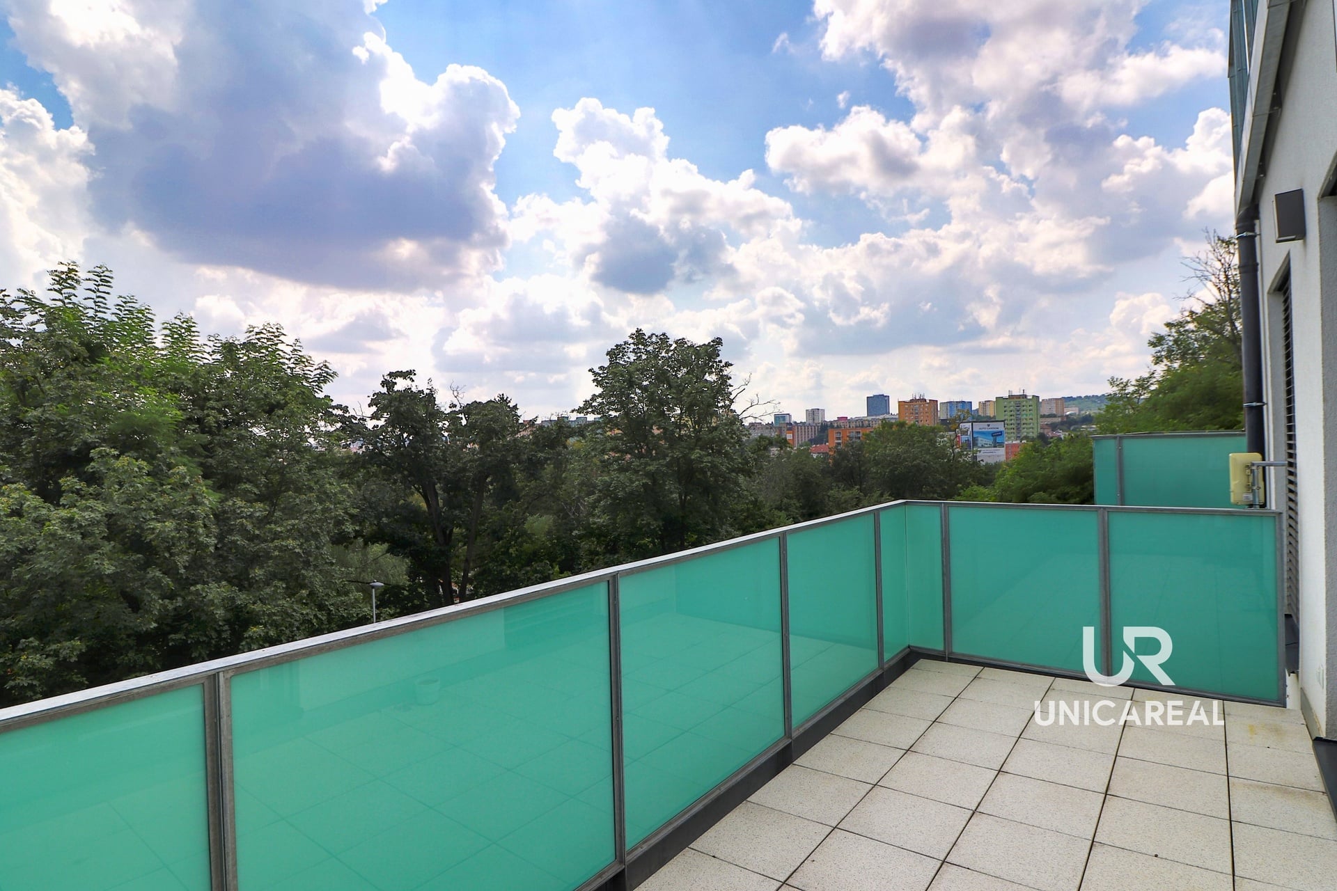 Díky propojení slunné terasy 10 m2 se vstupem z obou pokojů je byt přirozeně prosvětlený a před sluncem ho chrání elektrické předokenní žaluzie. Z terasy si můžete vychutnat atraktivní výhled na přilehlou zeleň i centrum města.