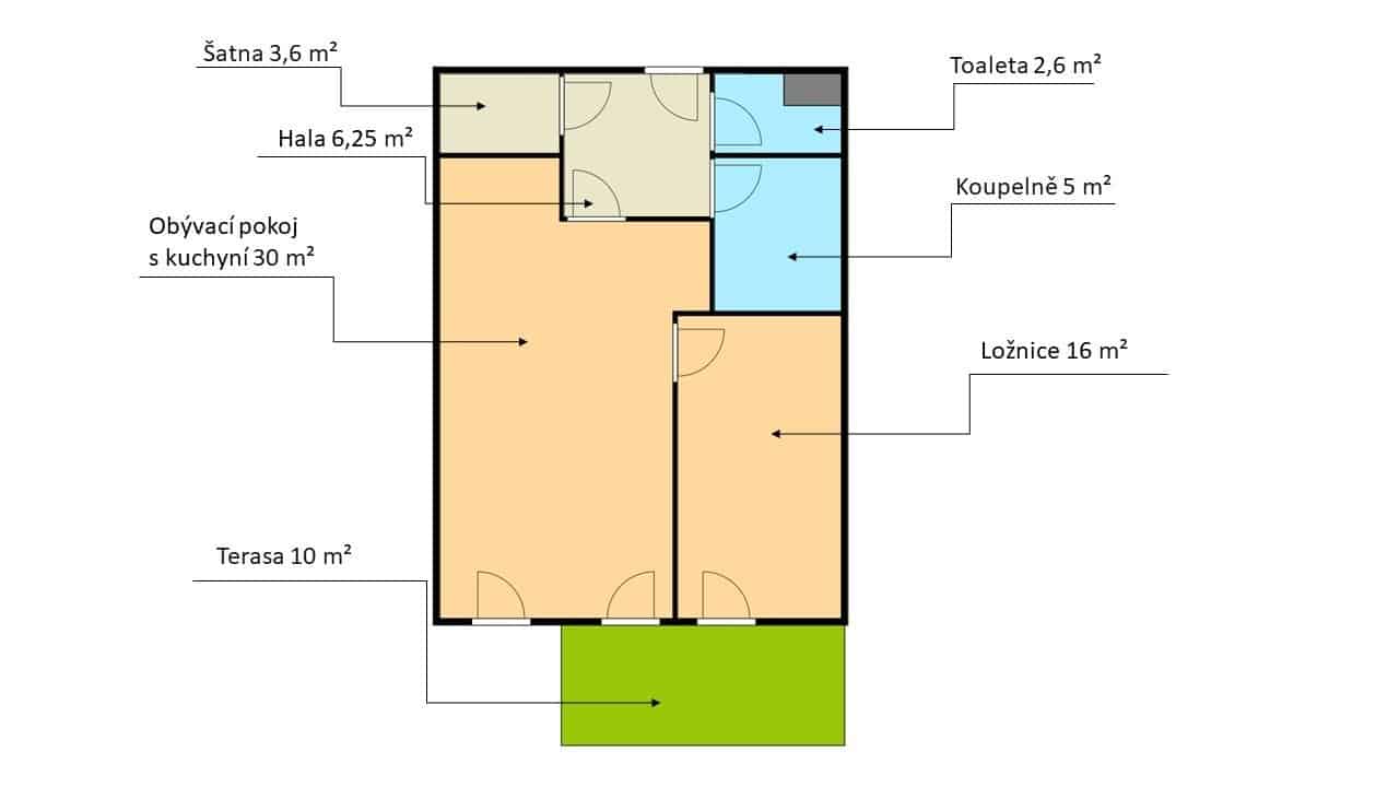Určitě oceníte na uložení potřebného šatnu/ komoru 3,6 m2 uvnitř bytu. Samostatná toaleta 2,6 m2.
