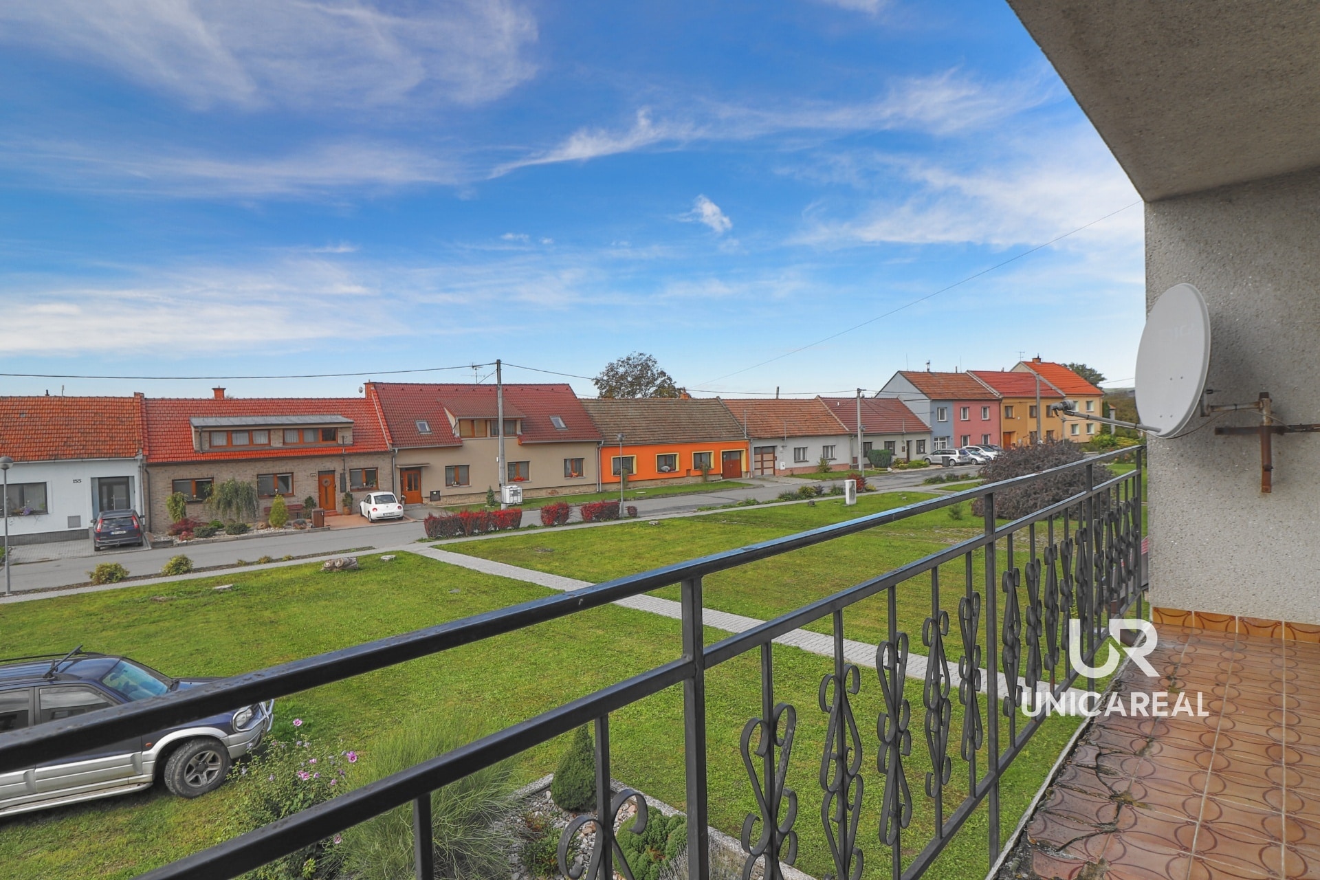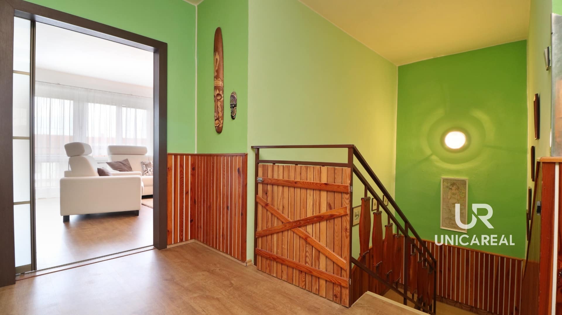 Horní patro disponuje chodbou se samostatnými vstupy do všech místností jako je velkoryse pojatý obývací pokoj 29 m2 s výstupem na balkon, nová moderní kuchyň 20 m2 s nepostradatelnou spíží, ložnice s orientací na východ 14 m2 , dvěma pokoji 12 m2 a 9 m2, koupelnou s vanou 5m2 a samostatným WC.