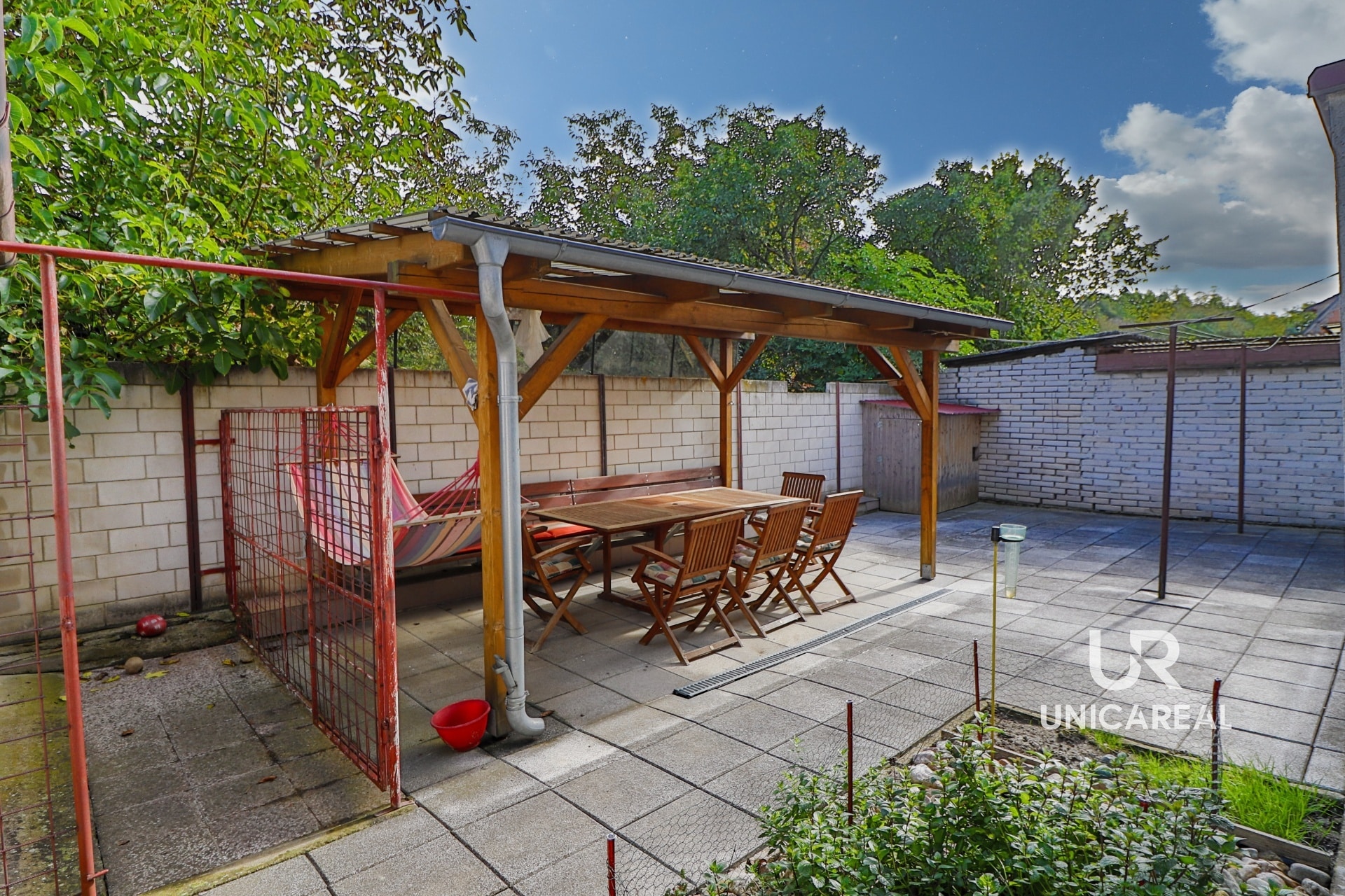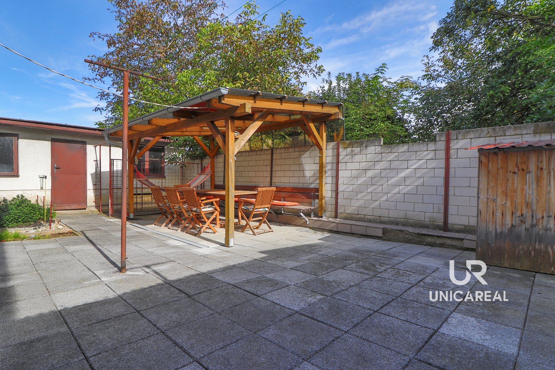 Na vydlážděném dvorku 62 m2 jistě oceníte posezení pod pergolou i podsklepený přístavek 29 m2, který lze později přebudovat například jako letní kuchyni nebo relaxační zońu se saunou.