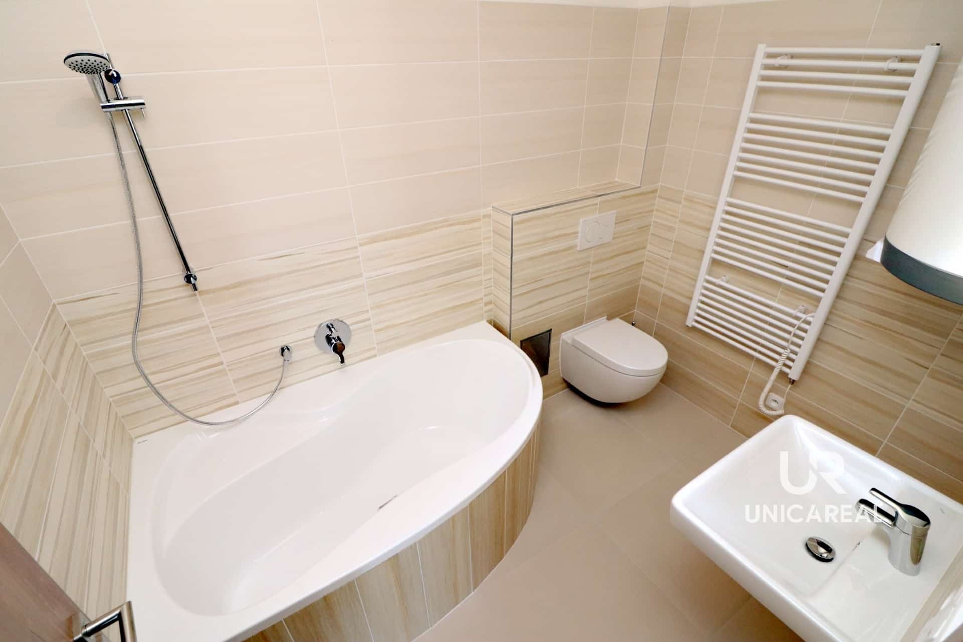 Součástí apartmánu je koupelna s rohovou vanou, kvalitní podlahové materiály a nezávislé elektrické vytápění s dálkovou regulací přes GSM modul – ideální řešení pro majitele, kteří chtějí mít provozní náklady pod kontrolou i na dálku.