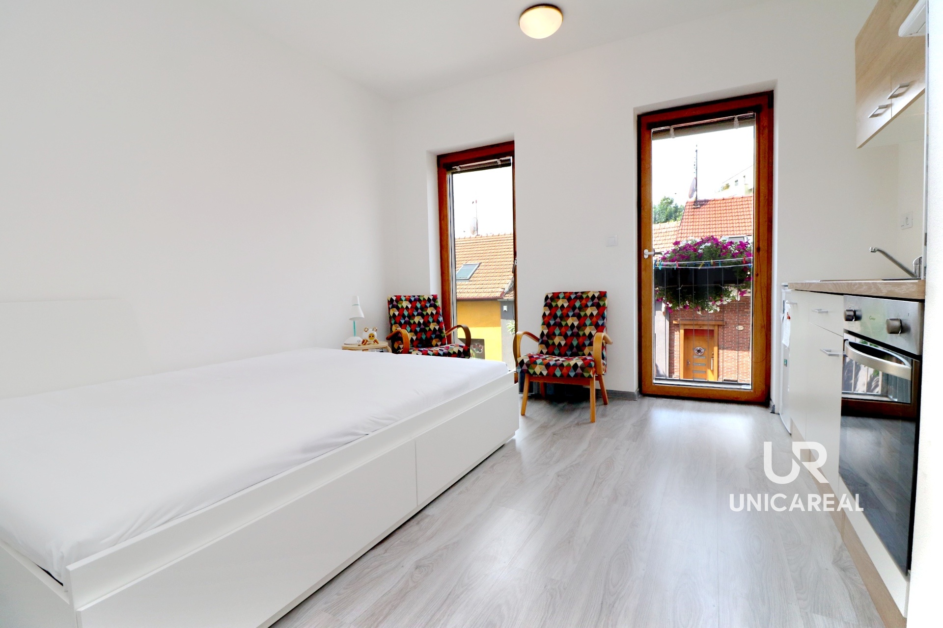 Velká francouzská okna nabízejí maximální prosvětlení prostoru a spolu se světlou vinylovou podlahou s podlahovým topením tvoří příjemnou atmosféru celého bytu.
