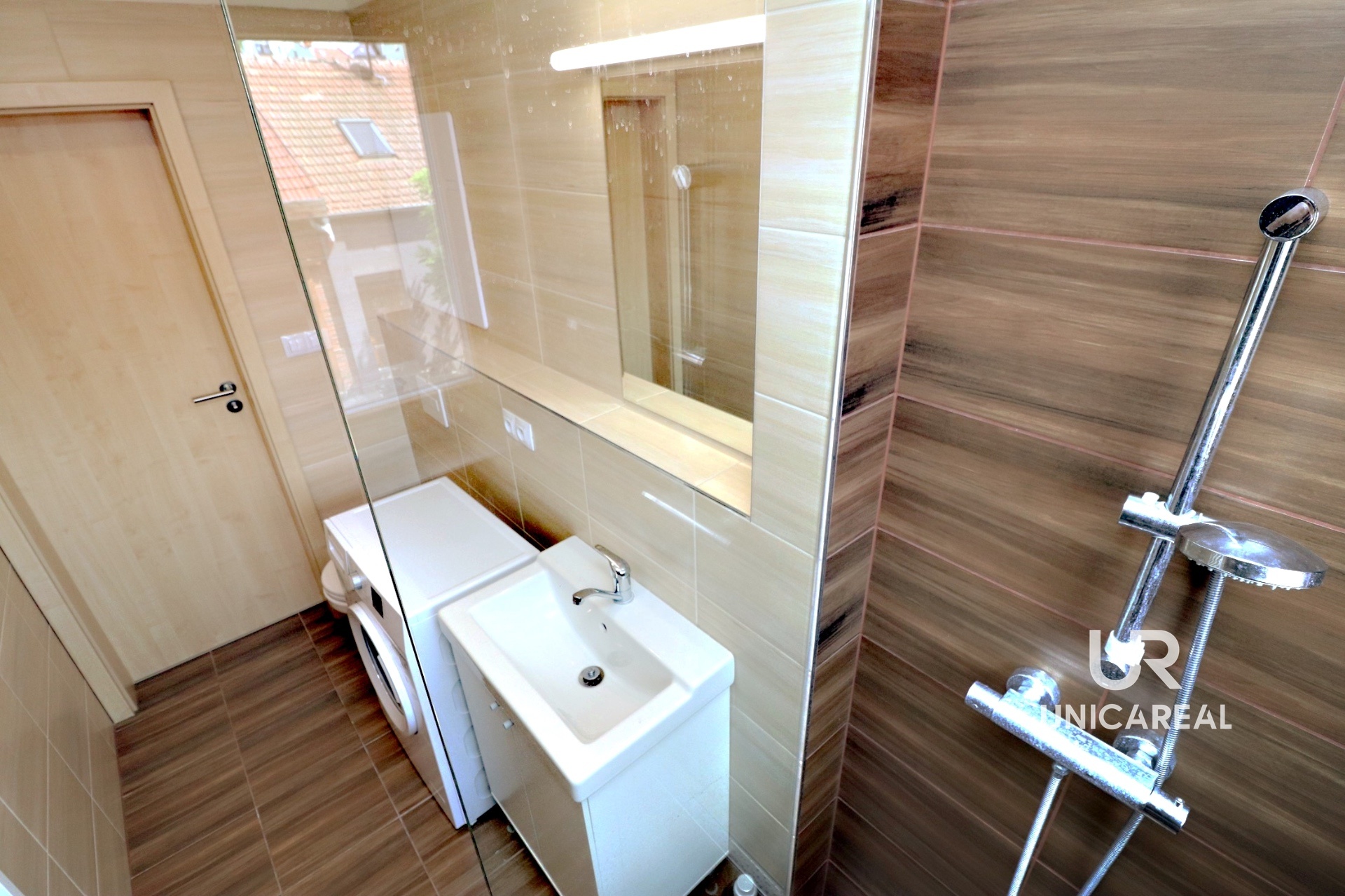 Dispozici bytu tvoří obývací pokoj s kuchyňským koutem 15,1 m2, koupelna se sprchovým koutem, umyvadlem a toaletou 4 m2, chodba 3 m2 a balkon 0,8 m2. K bytu přináleží i sklepní koje v 1. podzemním podlaží. V bytě zůstává nová kuchyňská linka s indukční varnou deskou, troubou i dvě velké šatní skříně.