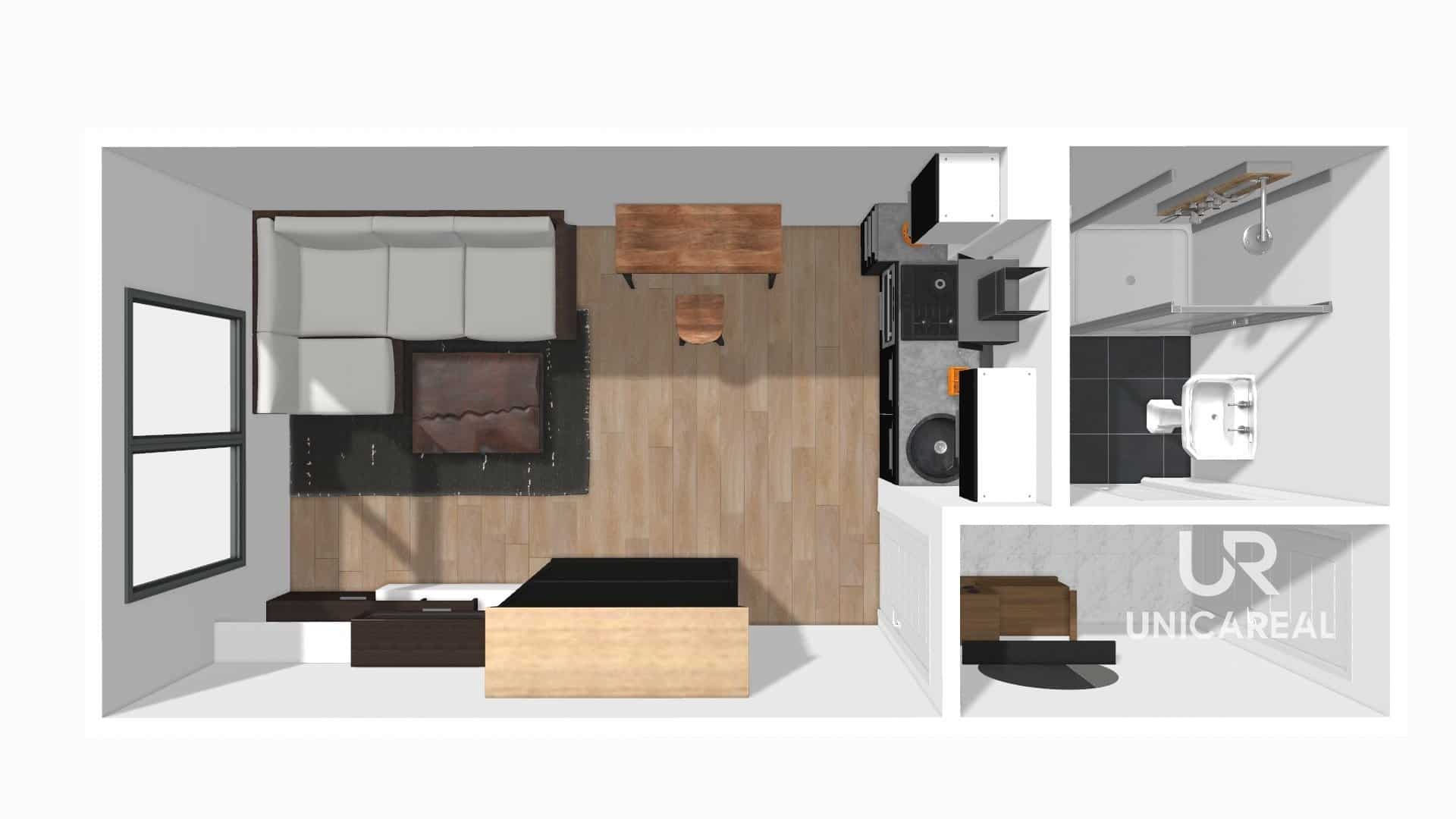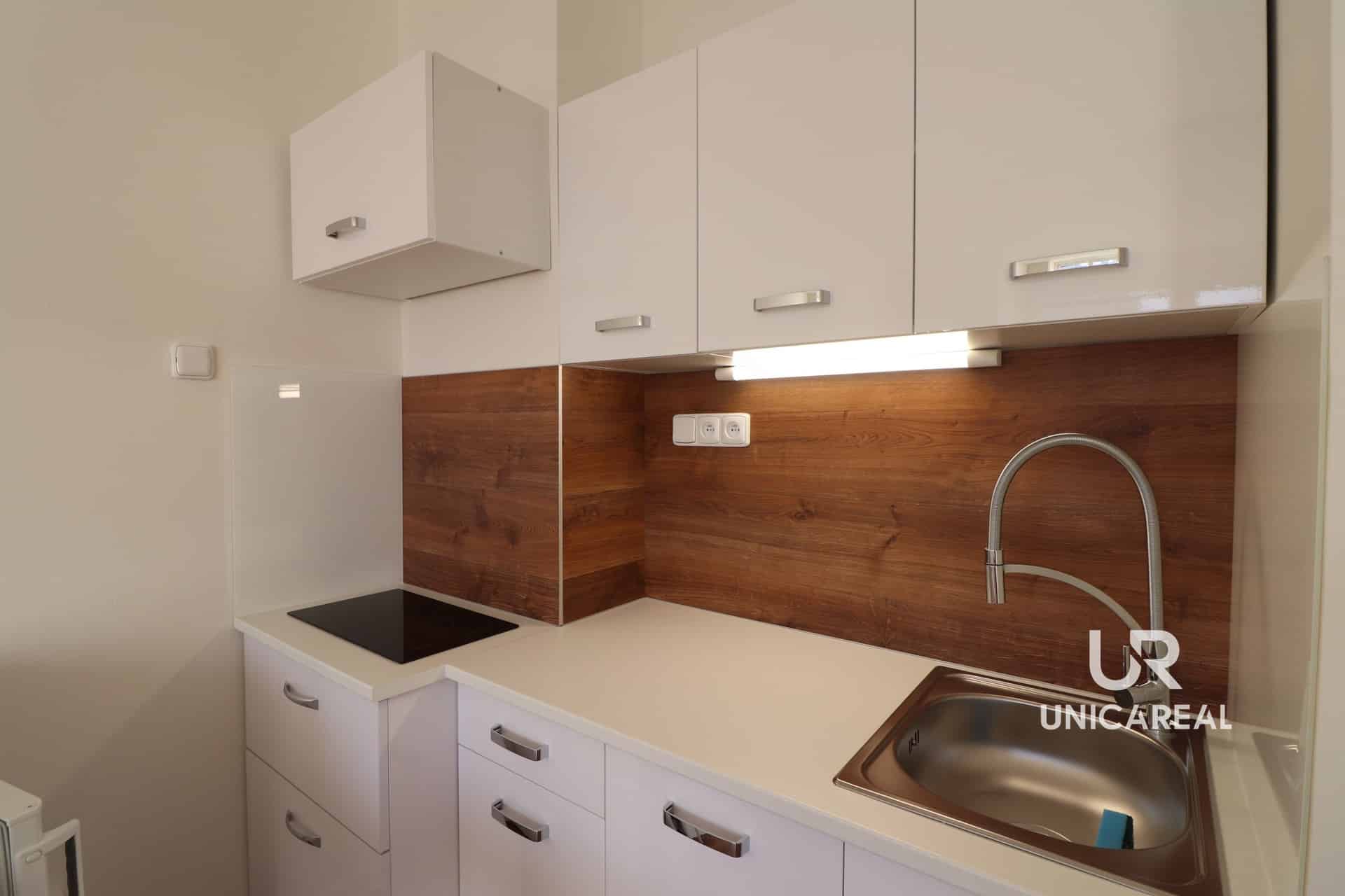 Kuchyňská část je vybavena linkou na míru s úložným prostorem, včetně spotřebičů ( indukční varná deska, dřez, lednice)
