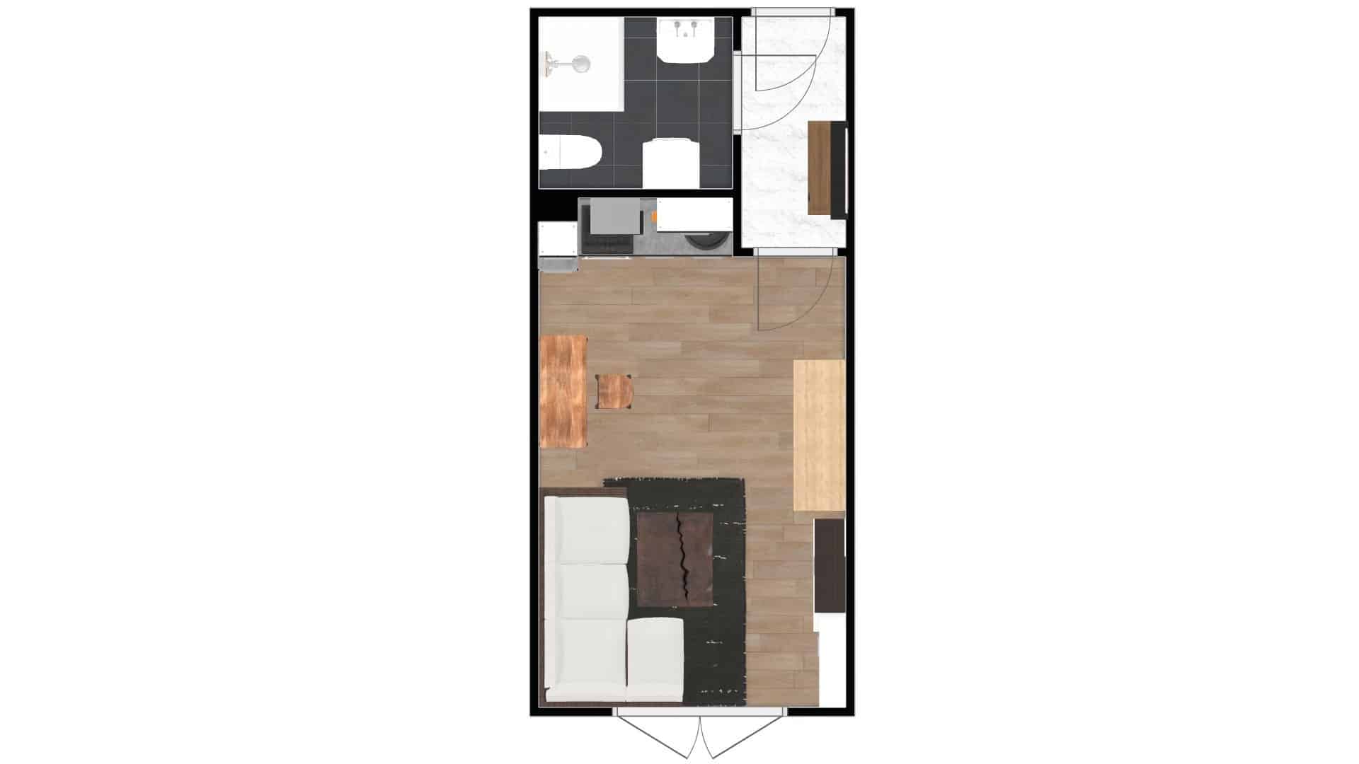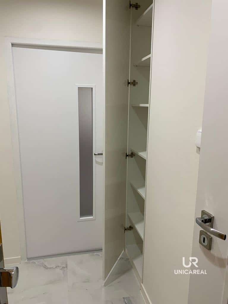 Z chodby s vestavěnou skříní se vchází do koupelny a kuchyně s obývací částí.