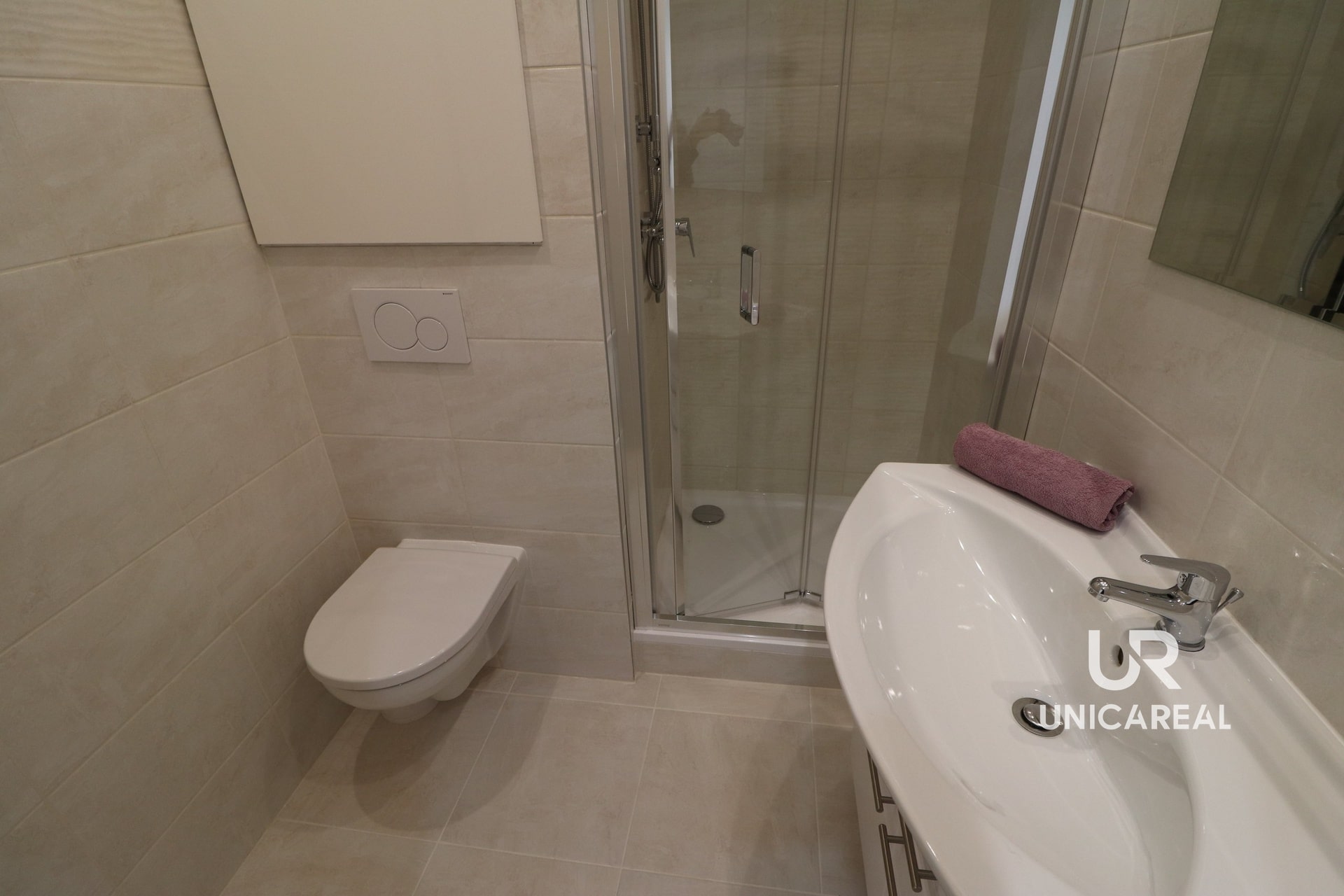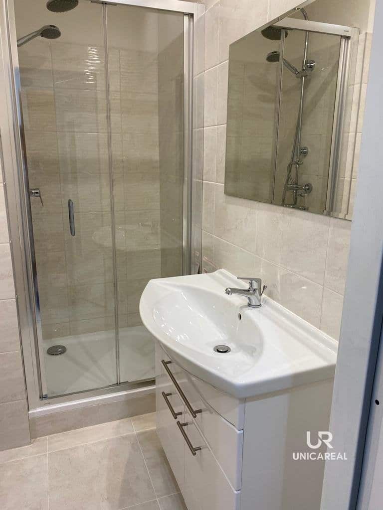 V koupelně je sprchový kout, umyvadlo s vestavěnou skříňkou, toaleta.