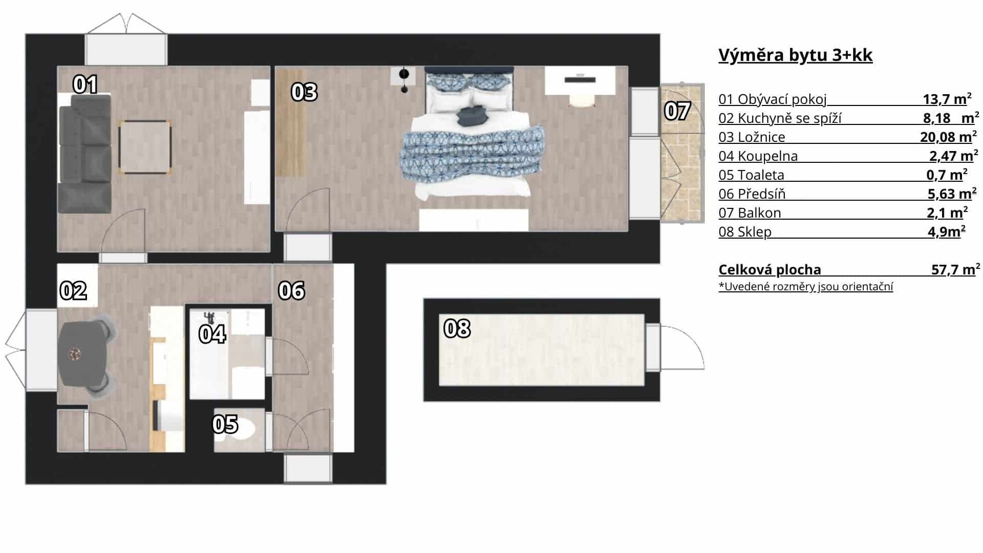 Byt v osobním vlastnictví má celkovou užitnou plochu 57 m² včetně příslušenství (sklep, balkon), součástí je balkon 2,1 m² a zděný sklep o velikosti 4,9 m².