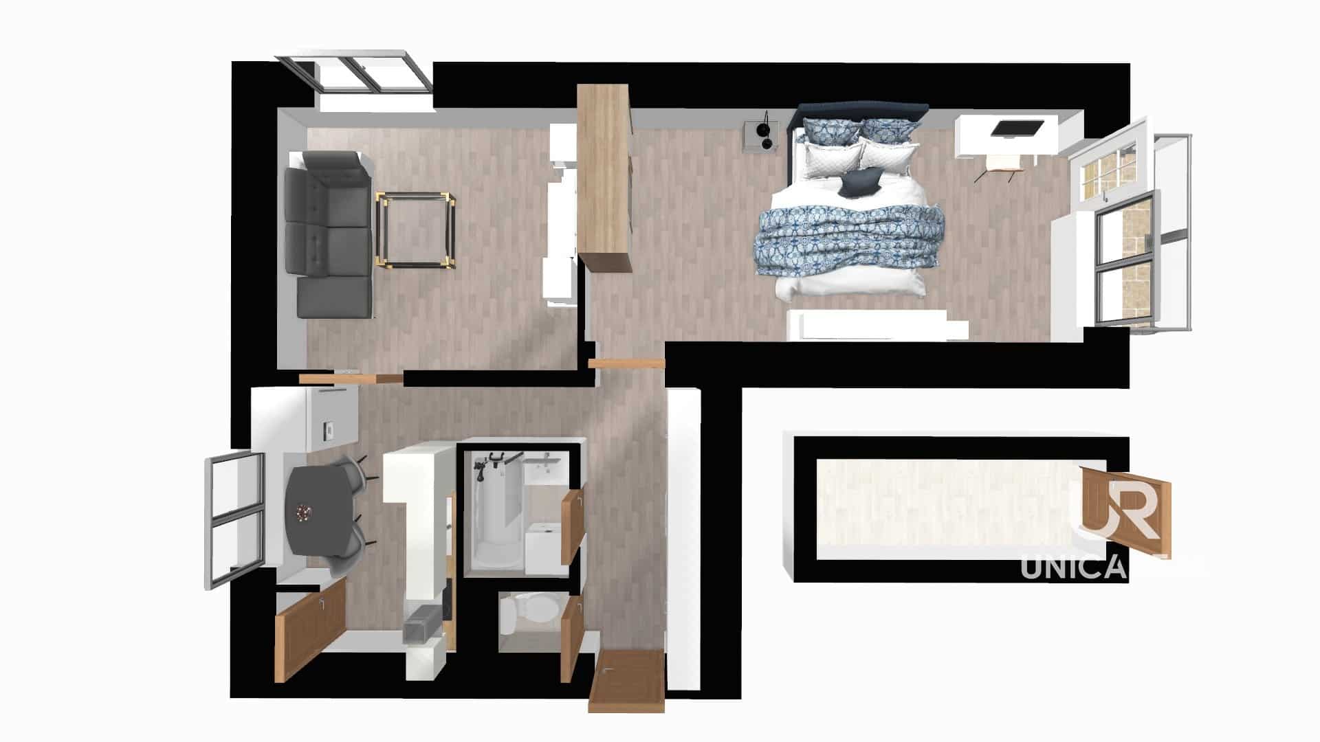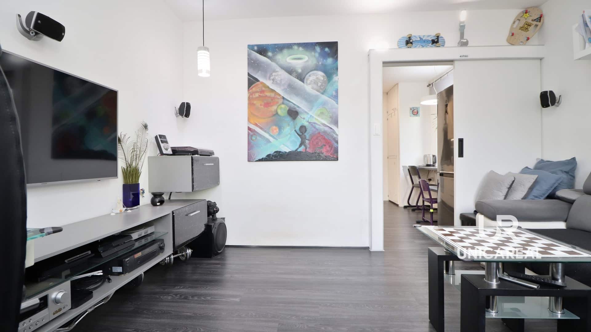 V celém bytě až na ložnici jsou nově vylité podlahy. V kuchyni, obývací části je položena tmavá vinylová podlaha, ložnice má šedohnědou plovoucí podlahu na původních dubových prknech, v předsíni, koupelně a WC je dlažba. Kuchyňská linka prošla rekonstrukcí v roce 2016. V pokojích je instalované osvětlení Philips Hue, které umožňuje plynule měnit intenzitu světla i teplotu barev (od studené po teplou).