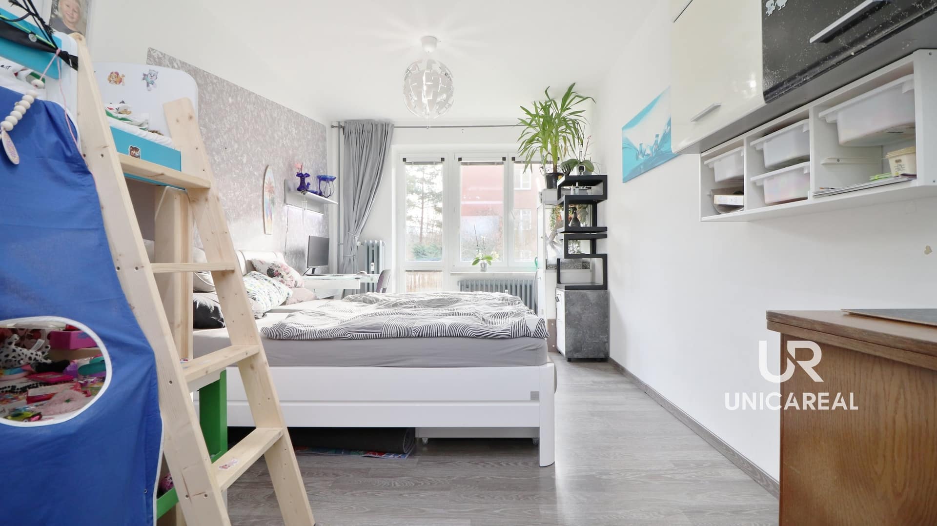 Hned u domu je park se stromy, dětskými hřišti i kavárnou.