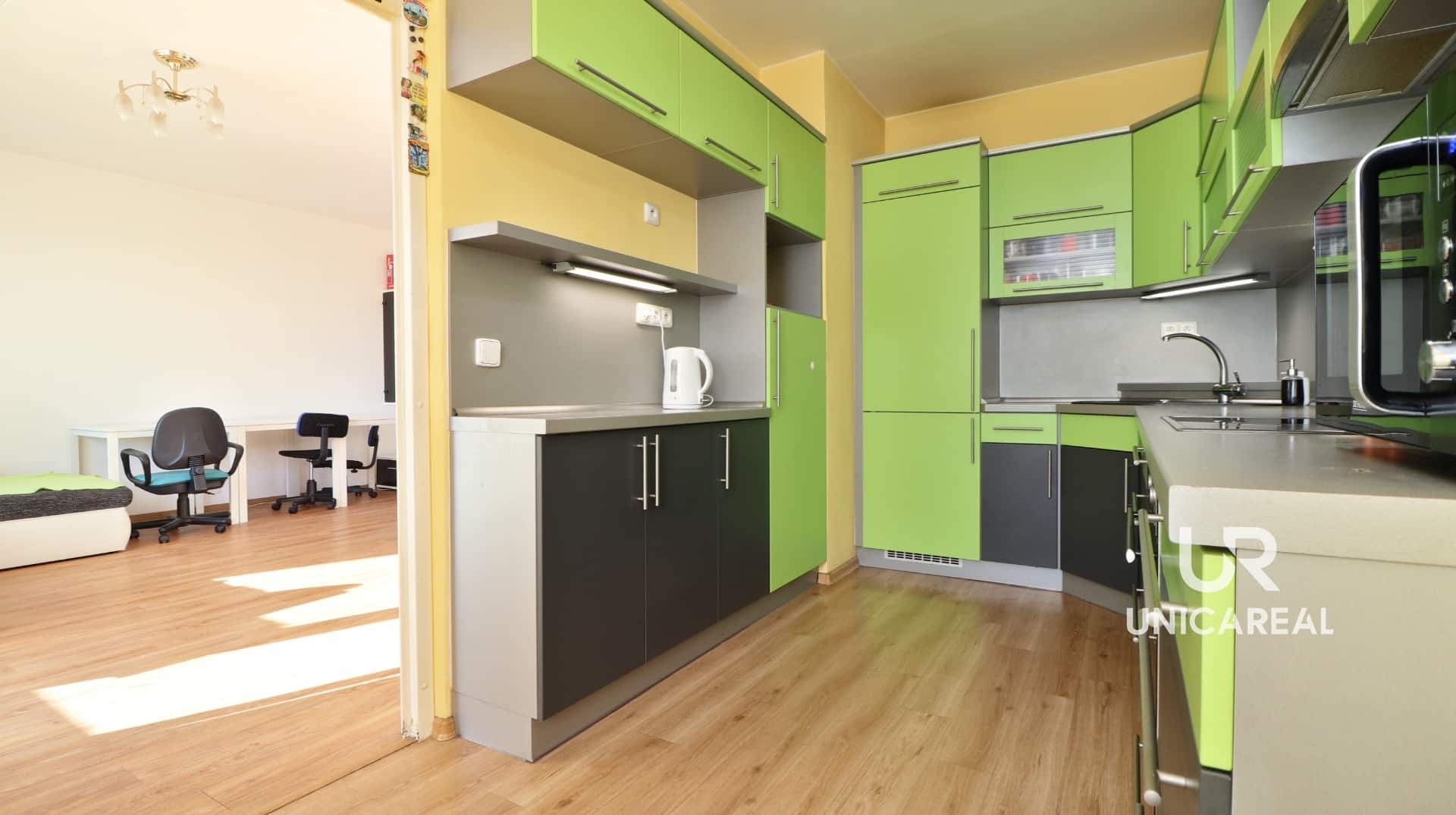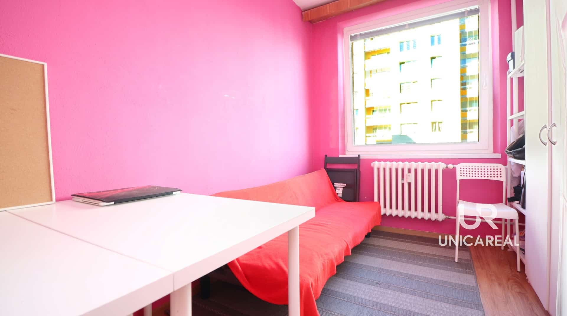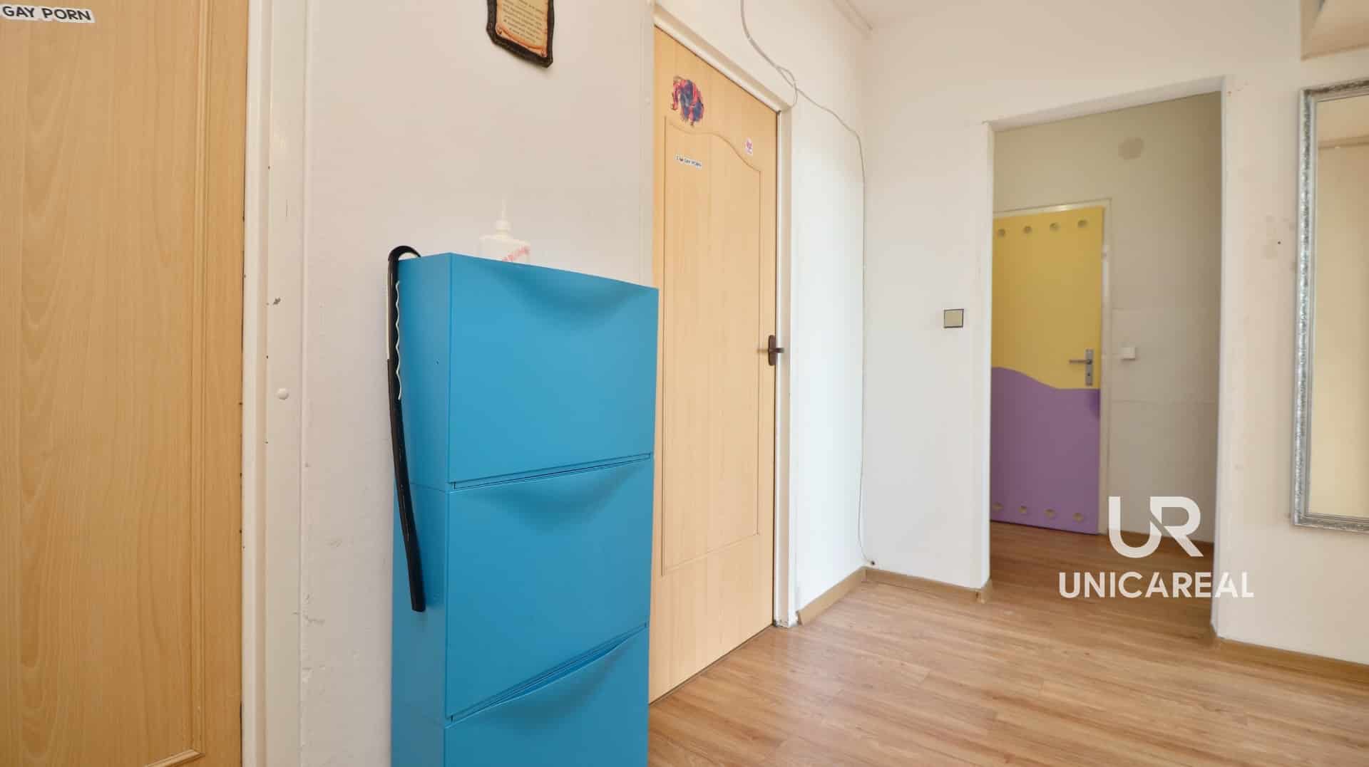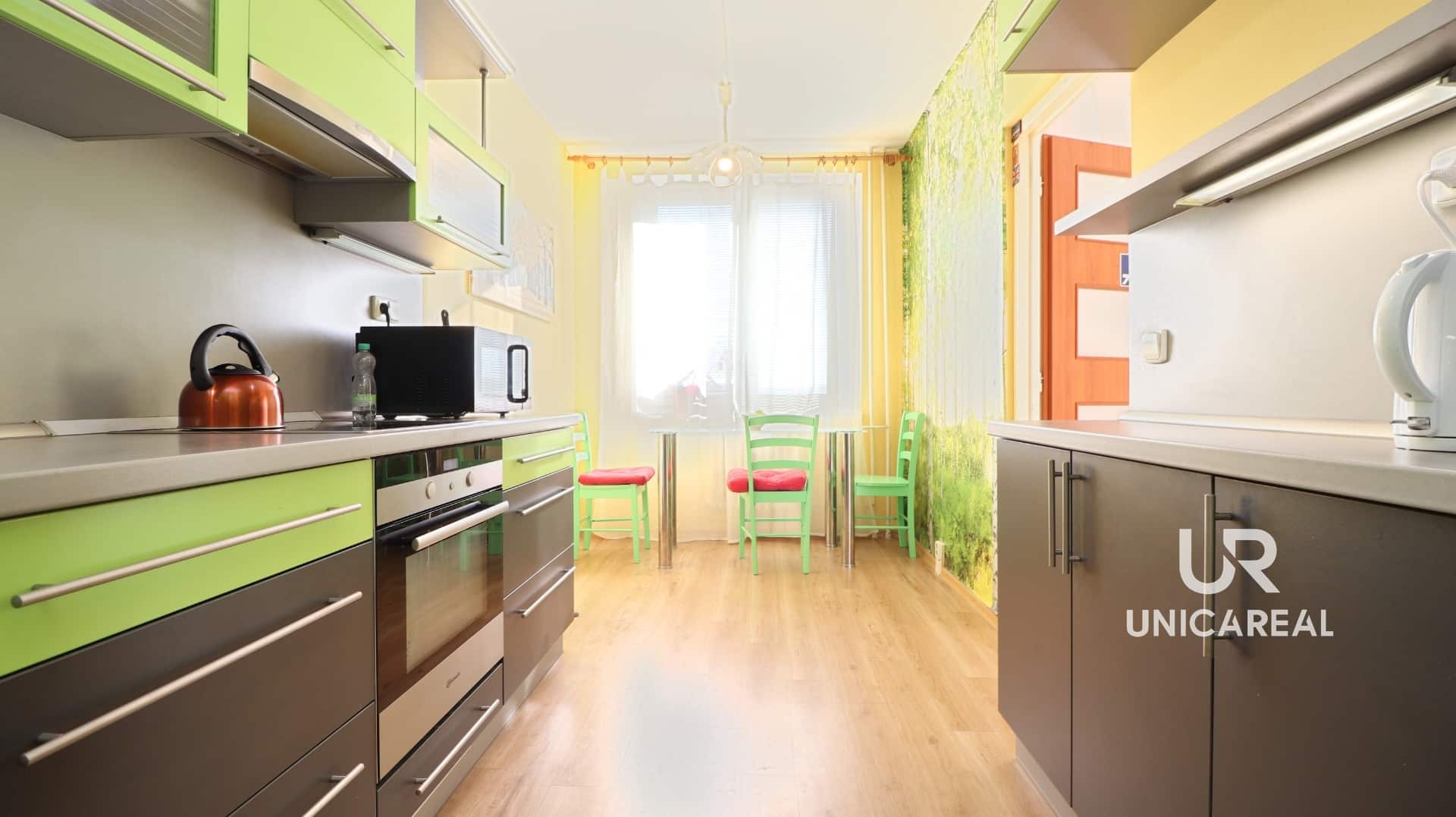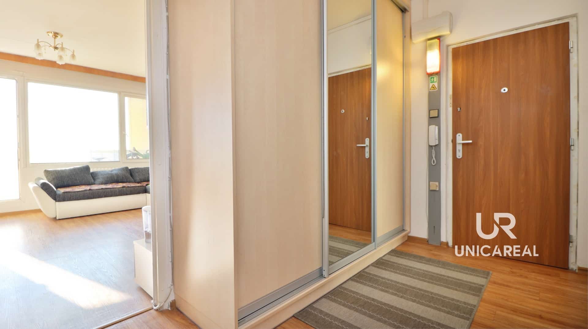 Dispozice bytu: vstupní chodba s vestavnými skříněmi 12,8 m2, samostatné neprůchozí pokoje ( 8m2 , 8m2 , 12 m2 ) samostatná koupelna s vanou , samostatné wc, dominantou bytu je prostorný obývací pokoj 20, 3m2 se vstupem na prostornou lodžii 4,8 m2 , kuchyně 12 m2 s kuchyňskou linkou a vestavnými spotřebiči . K bytu náleží sklepní kóje umístěná v přízemí bytového domu, možnost využití společné kočárkárny.