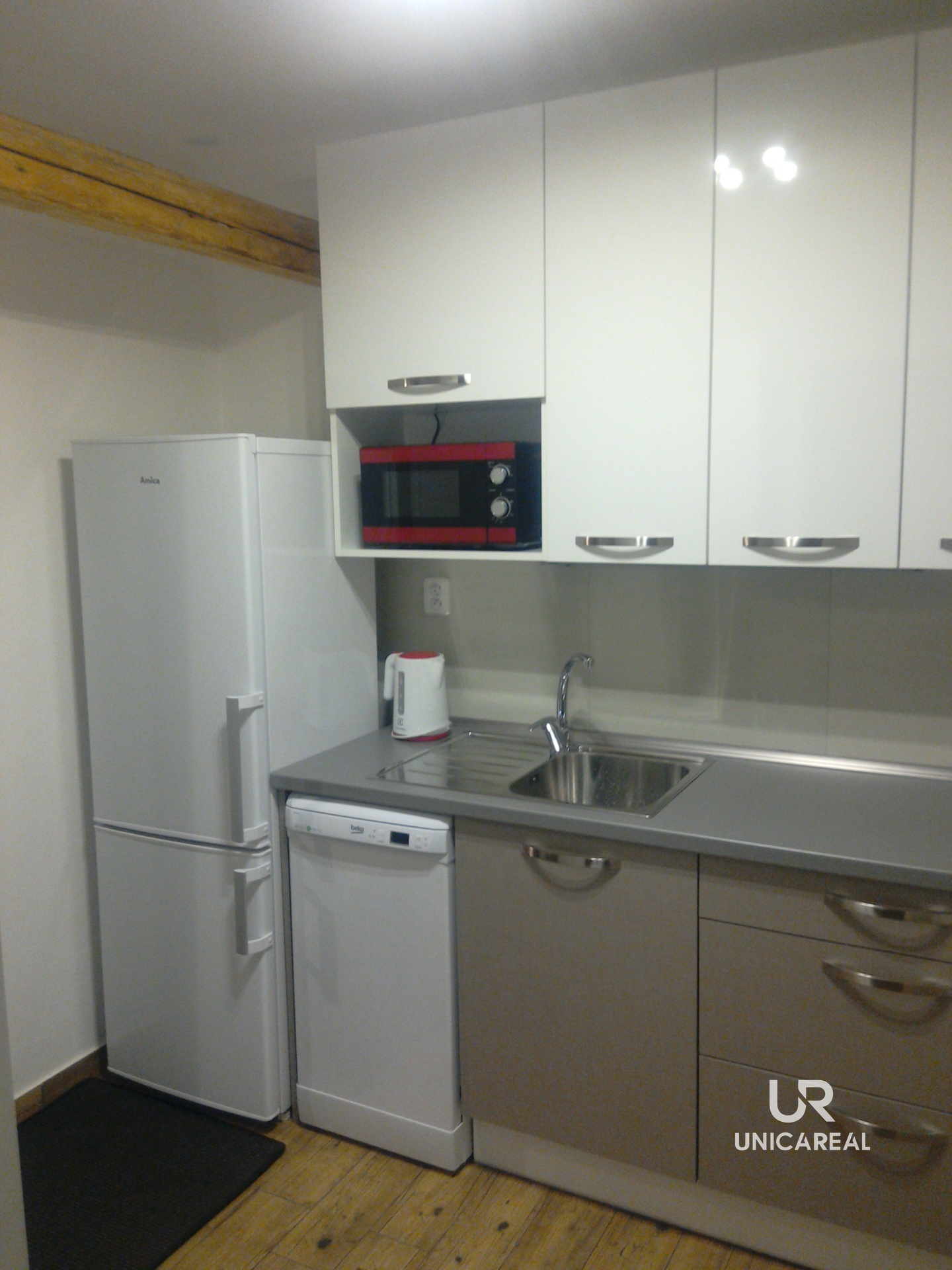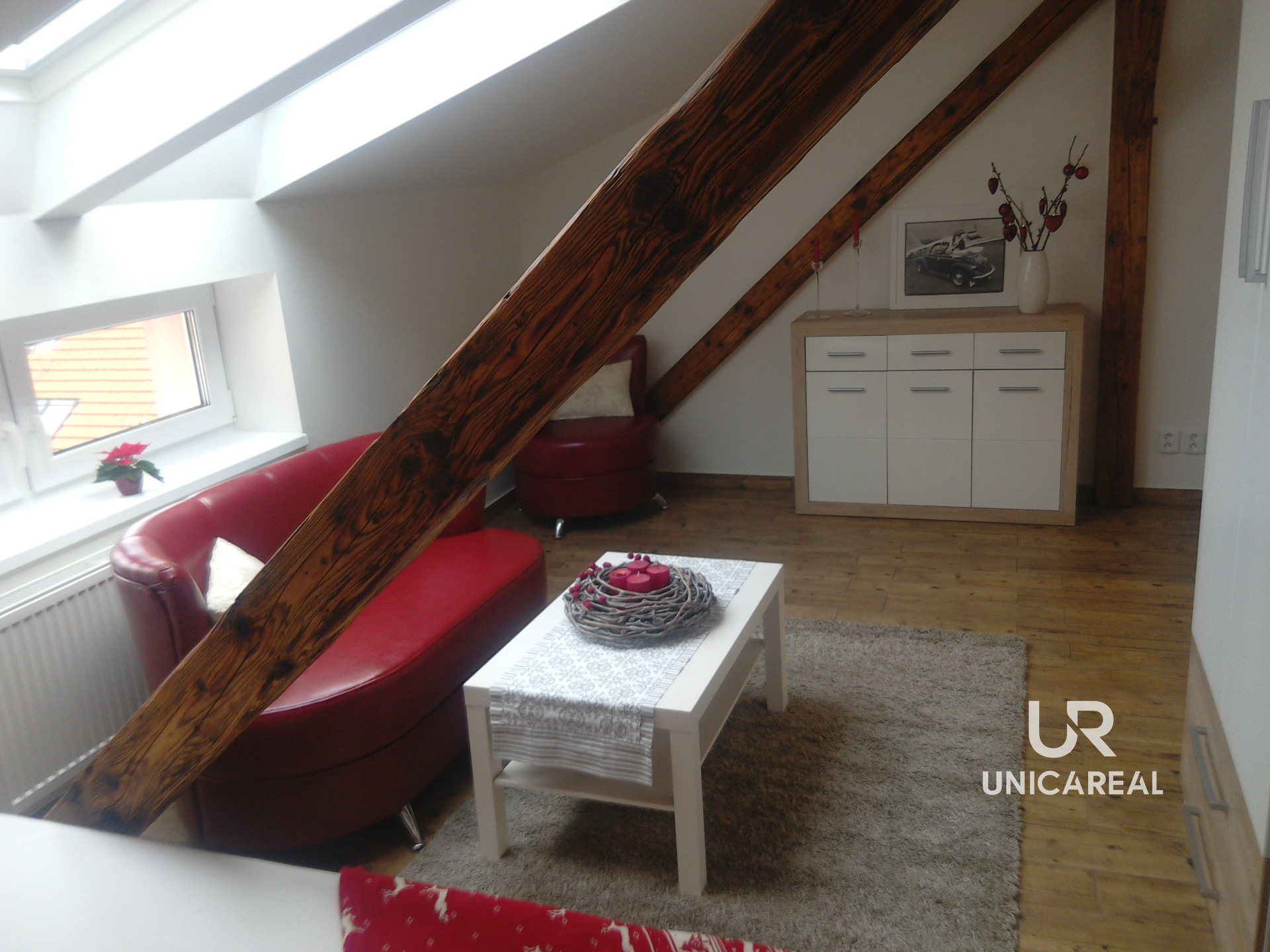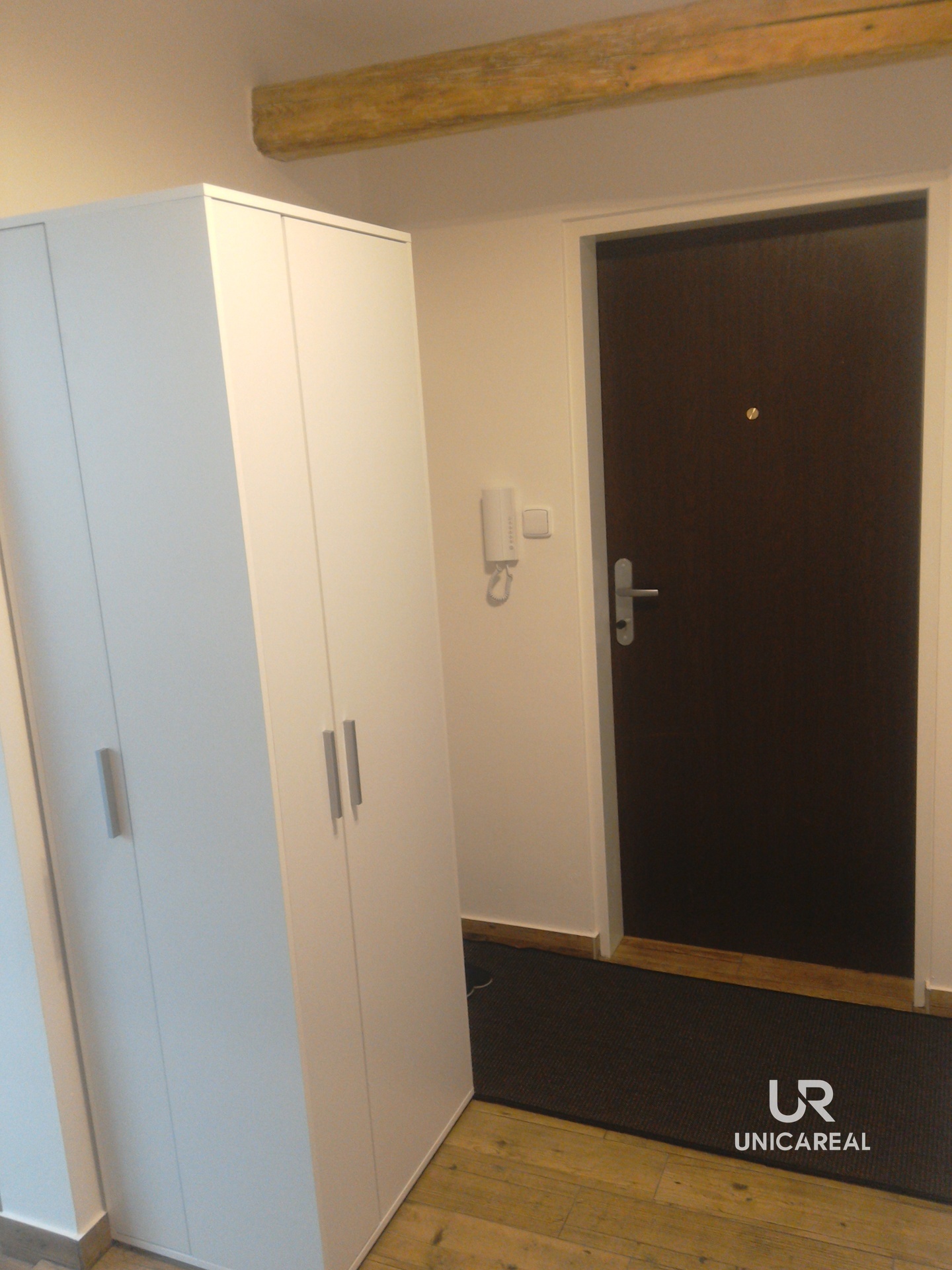 Byt se nachází ve 4. NP (bez výtahu) a disponuje zádveřím, kuchyní s kuchyňskou linkou vyrobenou na zakázku, koupelnou se sprchovým koutem a toaletou, obytnou místností.