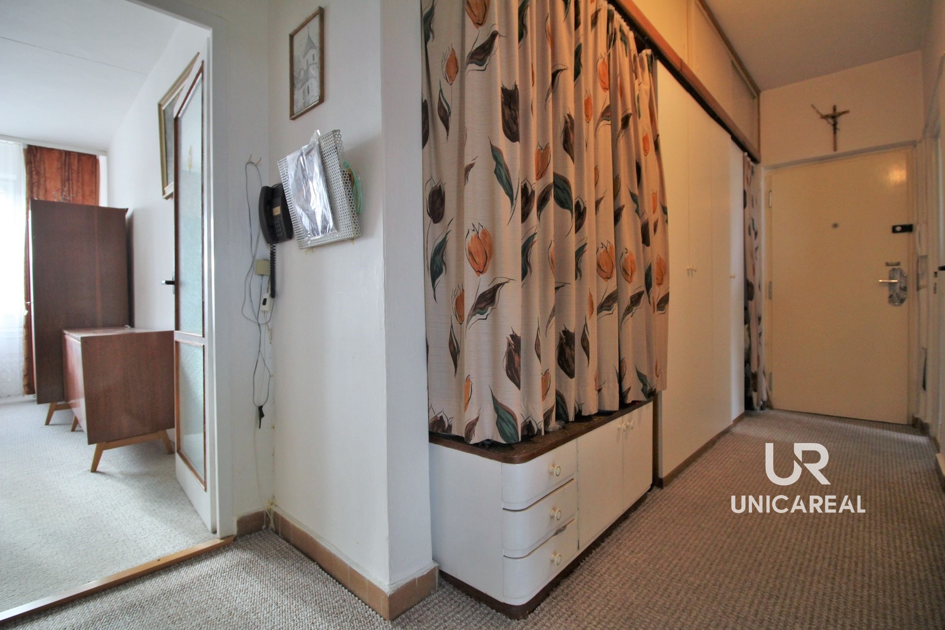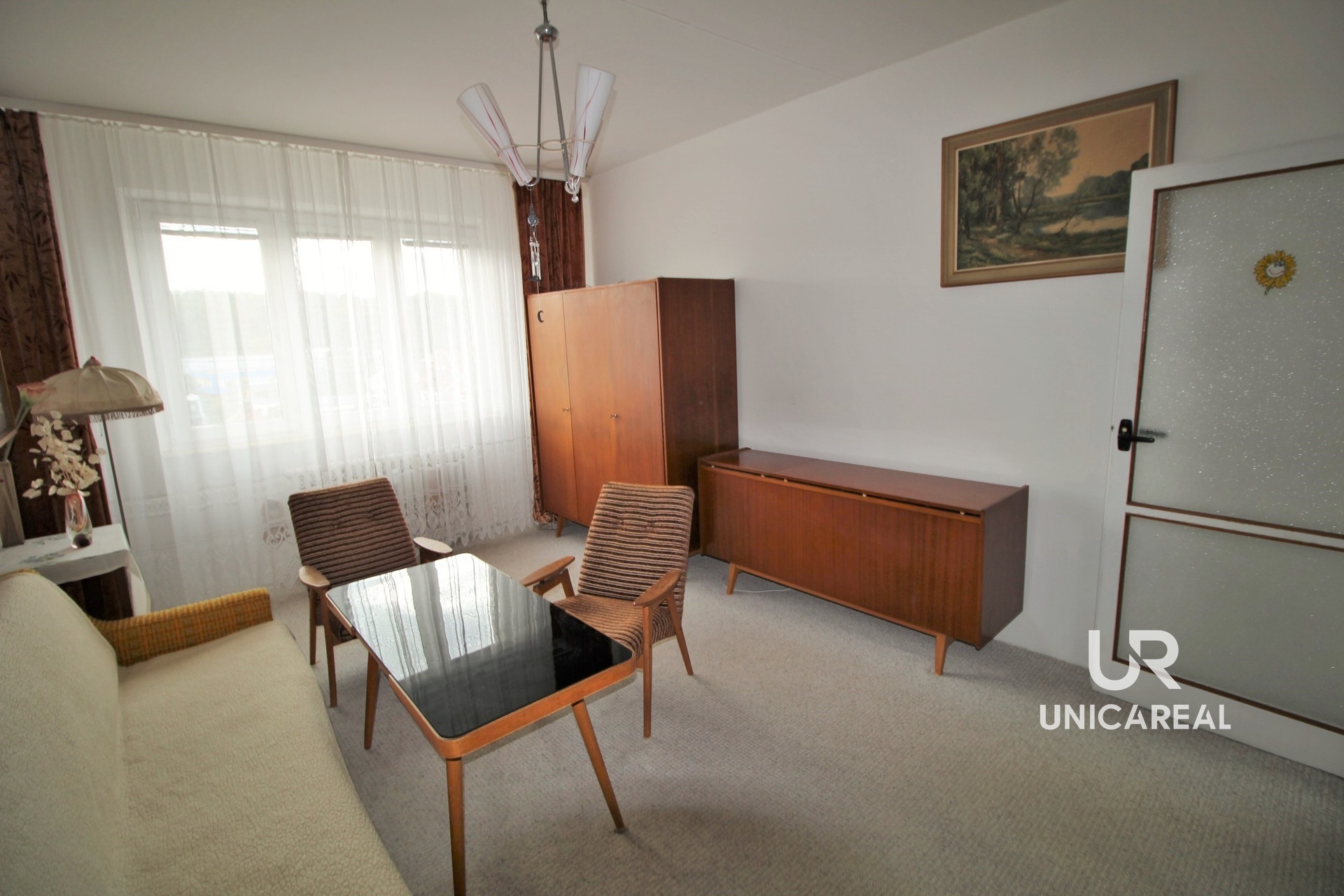 Dispozice bytu: z prostorné předsíně 7,8 m2 vlevo je vstup do kuchyně ve tvaru L 8,75 m2. Dále vlevo původní koupelna s vanou 2,10 m2 a samostatné WC 1 m2. Chodbou vpravo se nachází pokoj s nikou 21,40 m2, vlevo druhý pokoj 12,60 m2 s balkonem a výhledem na Brno (na Petrov). K bytu náleží sklep.
