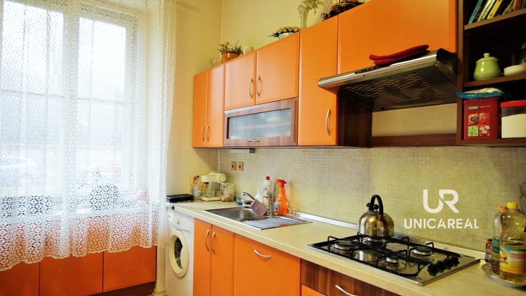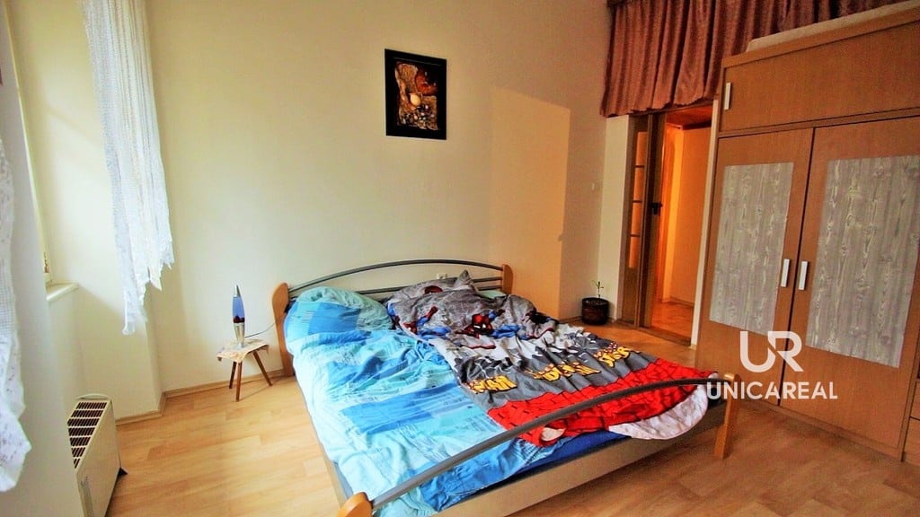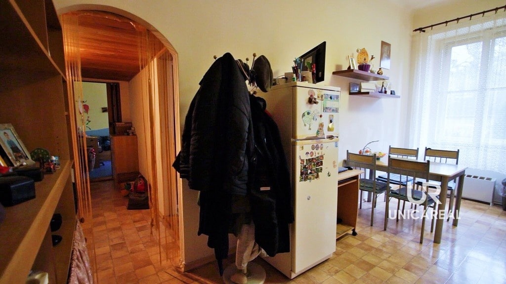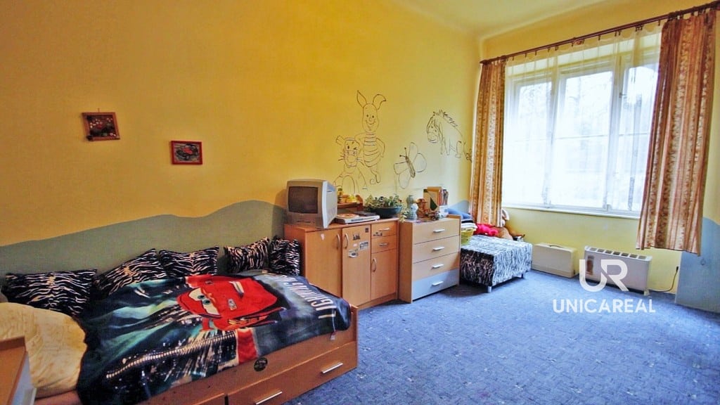 Dispozice bytu: z chodby vstup do prostorné kuchyně 21 m2, společná toaleta s koupelnou 3 m2, dva prostorné samostatné pokoje 20,40 m2 a 18,50 m2, chodba s úložným prostorem. K bytu náleží sklepní koje 9,87 m2. Možnost změny dispozičního řešení, vysoké stropy pro možnost dalšího zvětšení prostoru.