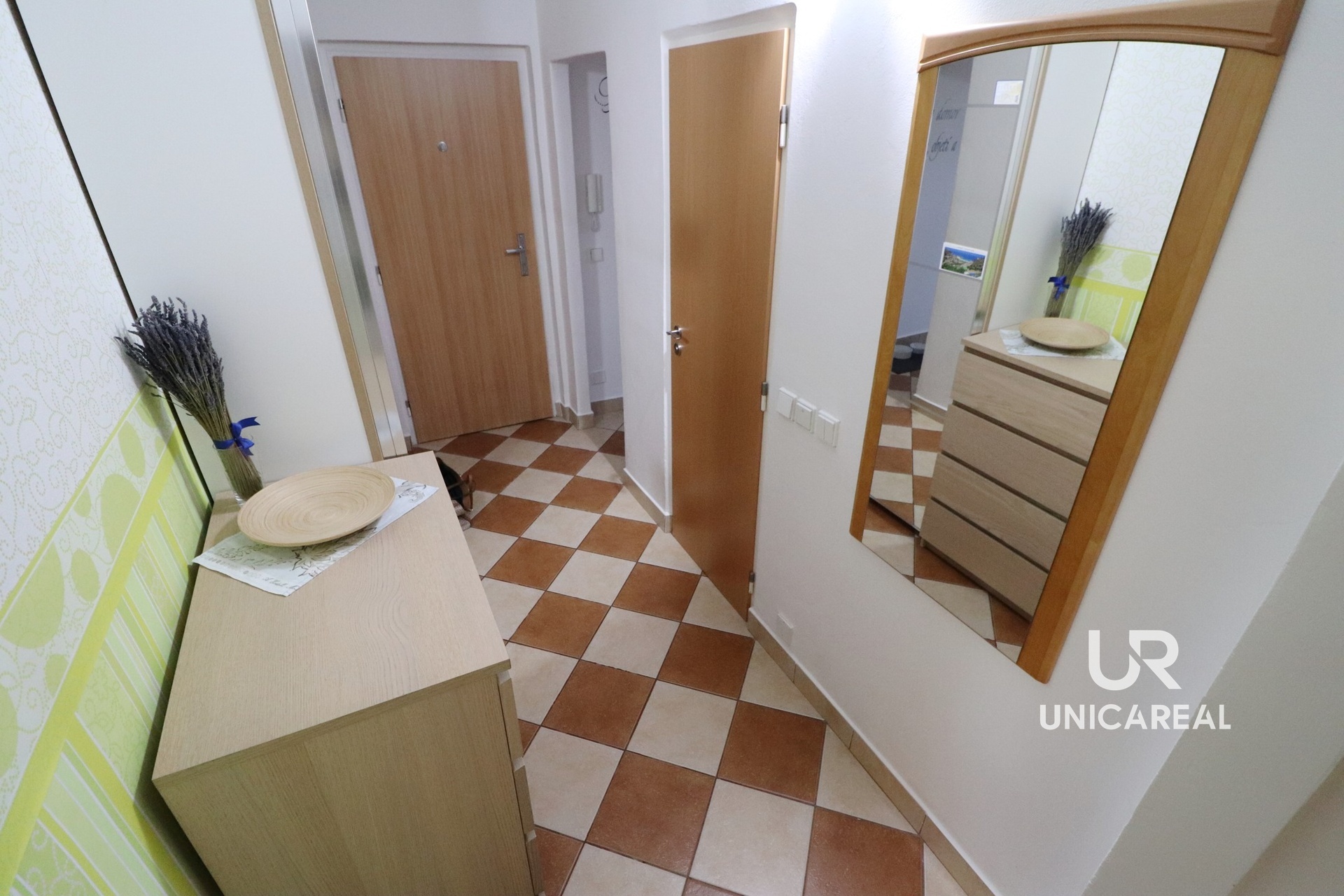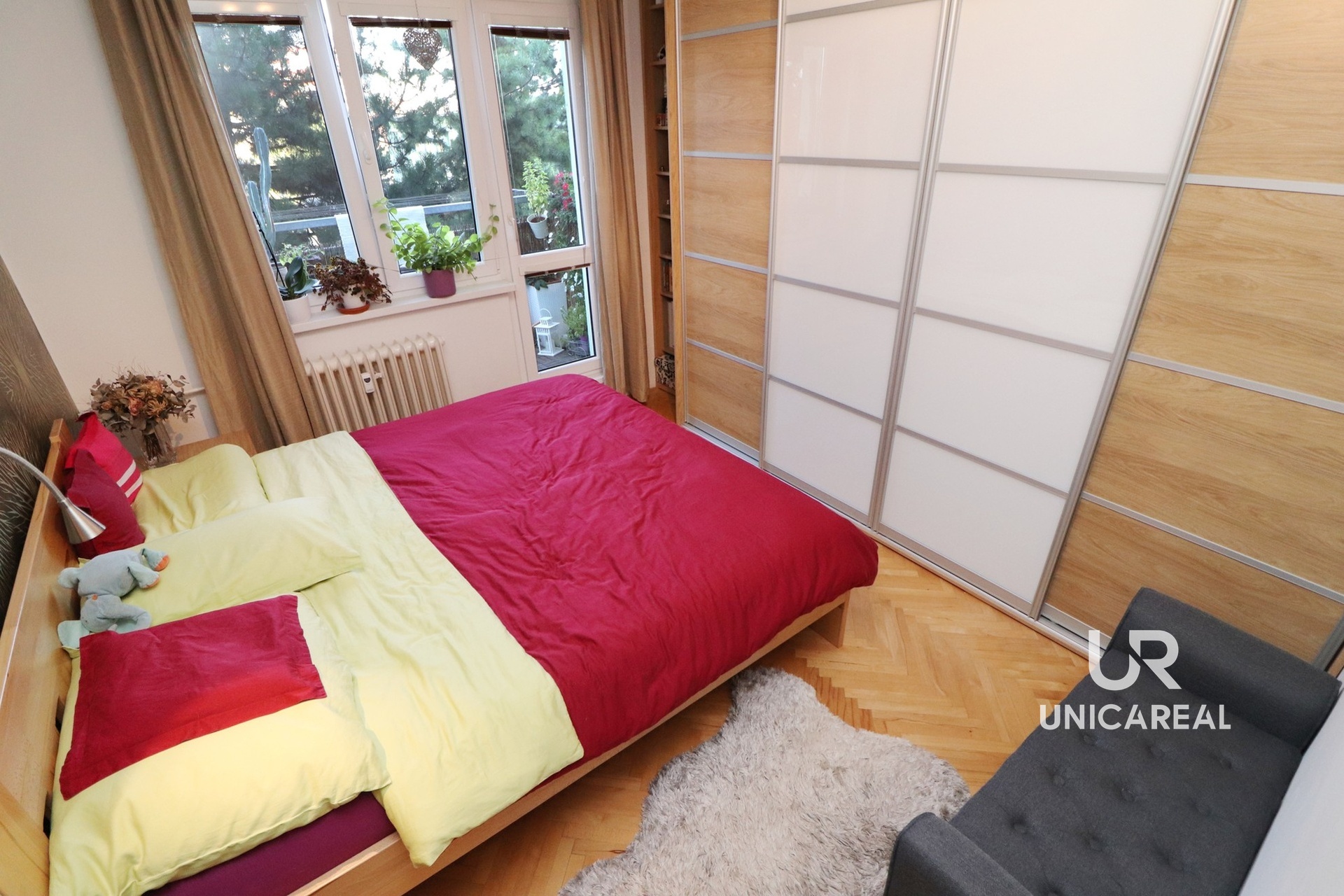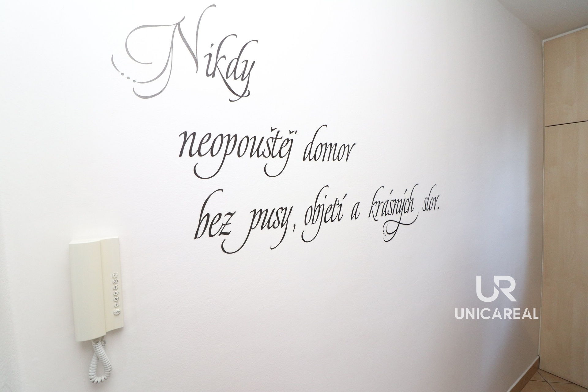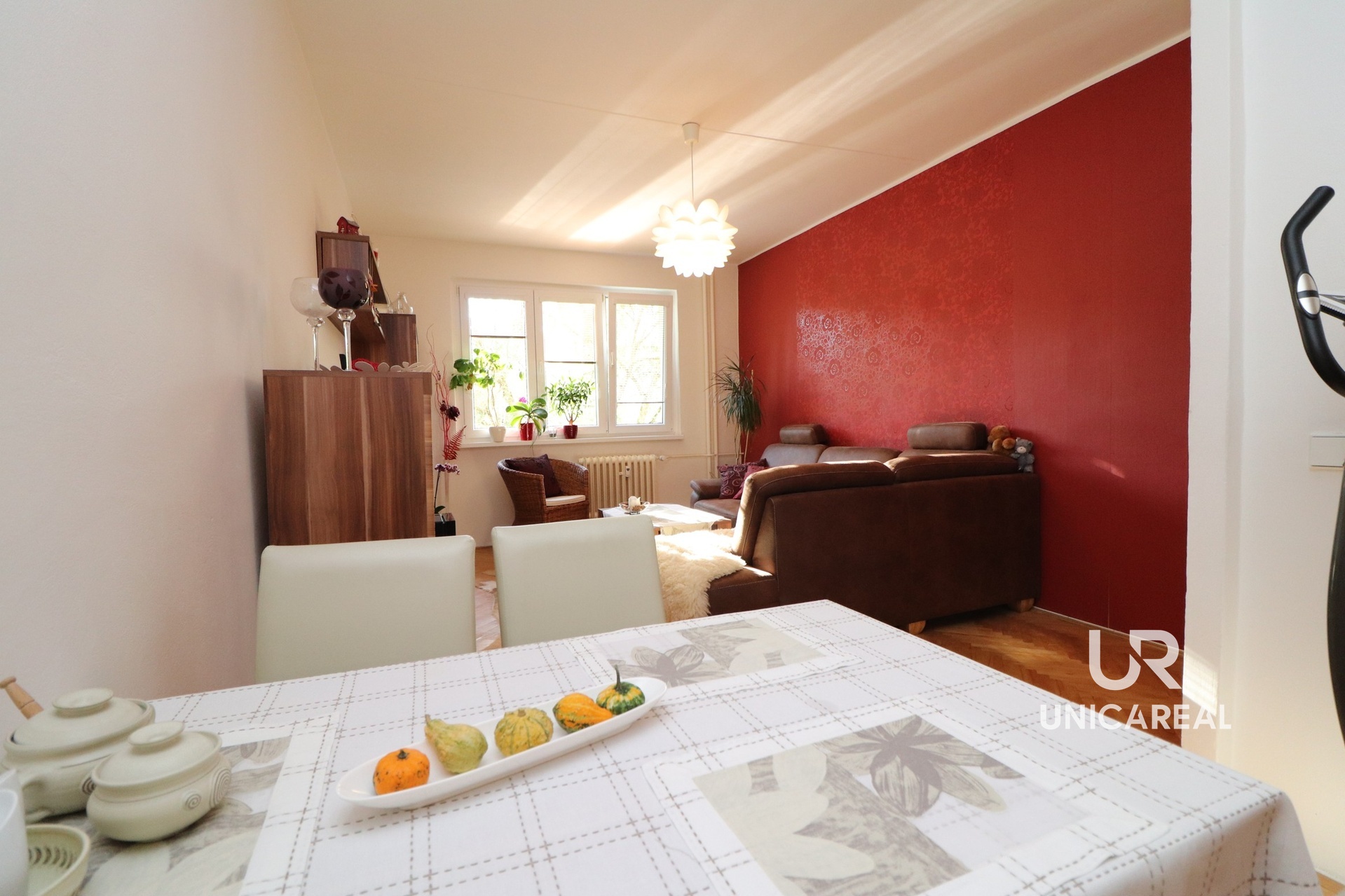 Dispozice bytu: předsíň 7.80 m2 s vestavěnou šatní skříní, koupelna s vanou a toaletou 3,5 m2, kuchyně 8,75 m2, dva neprůchozí pokoje – obývací pokoj s nikou 21,40 m2, ložnice 12,60 m2 se vstupem na balkon 2,12 m2. V ložnici byla v letošním roce zbudována nová vestavěná šatní skřín. K bytu náleží sklepní koje, možnost využívání kočárkárny-kolárny.