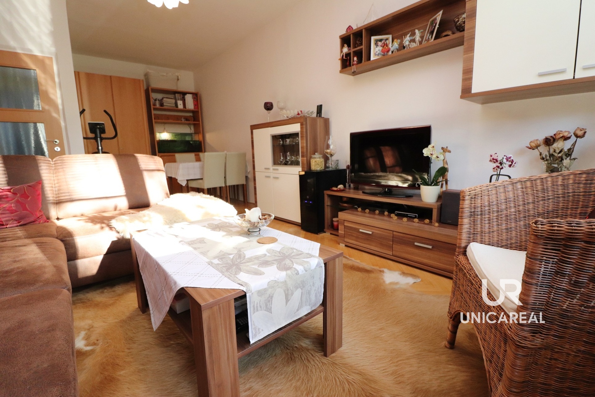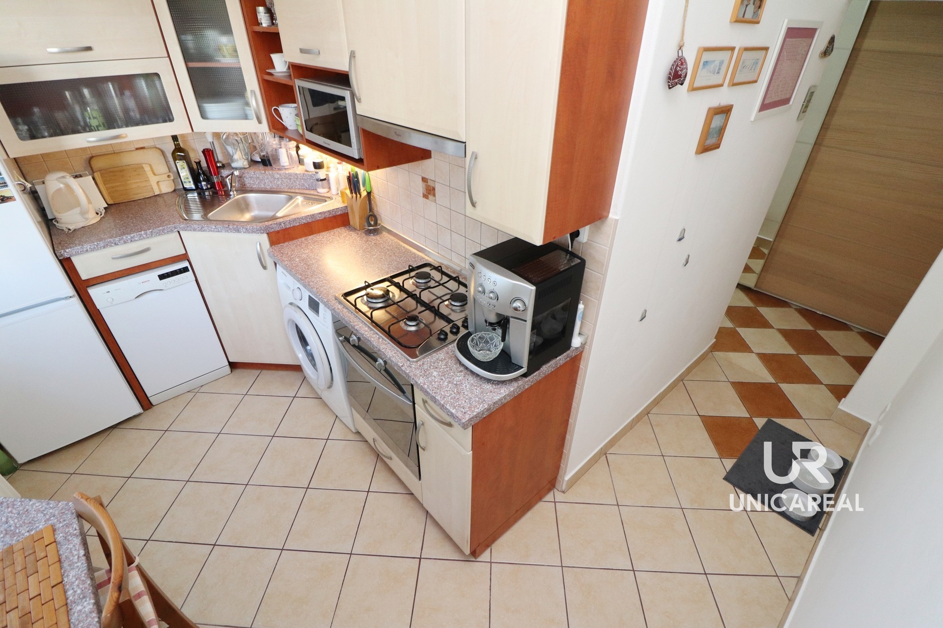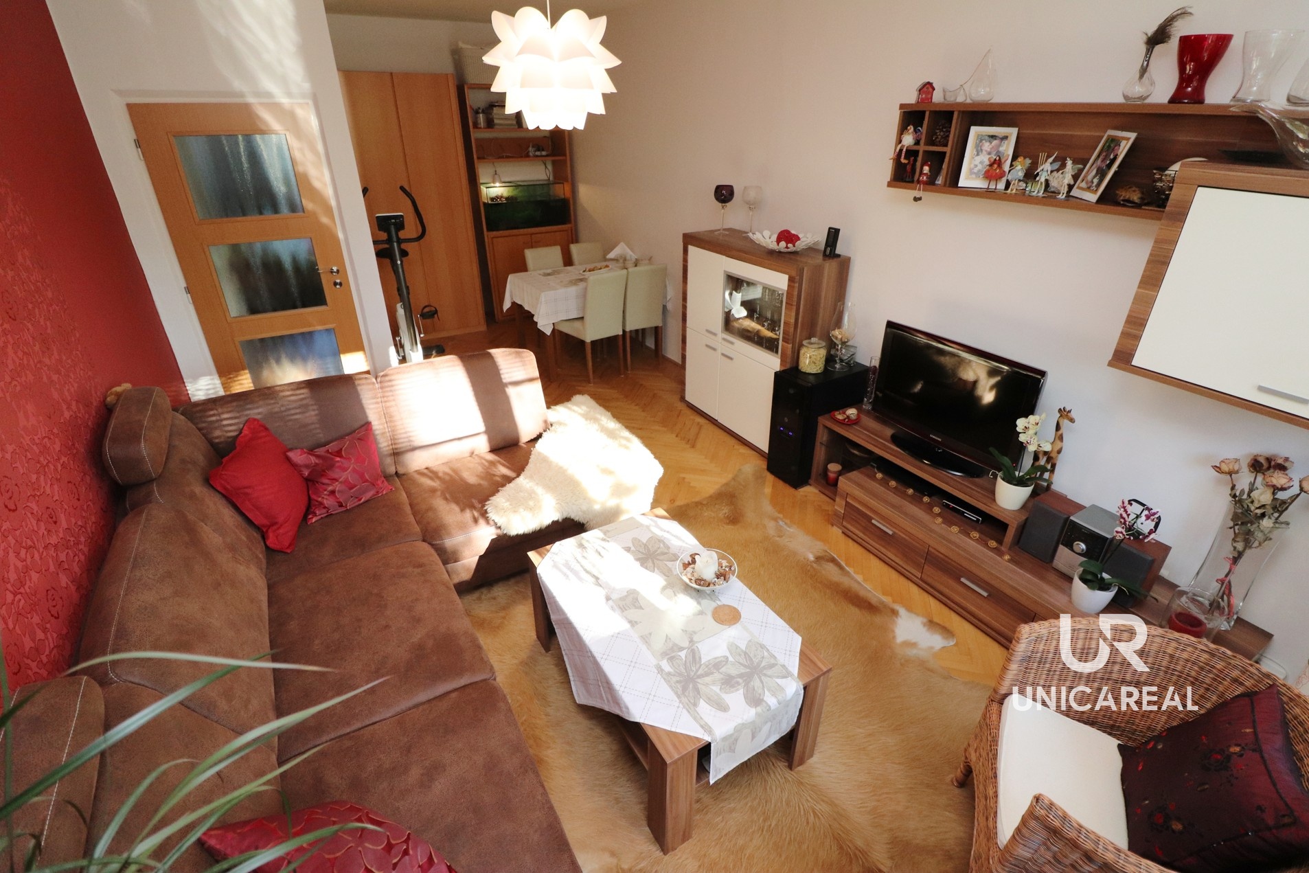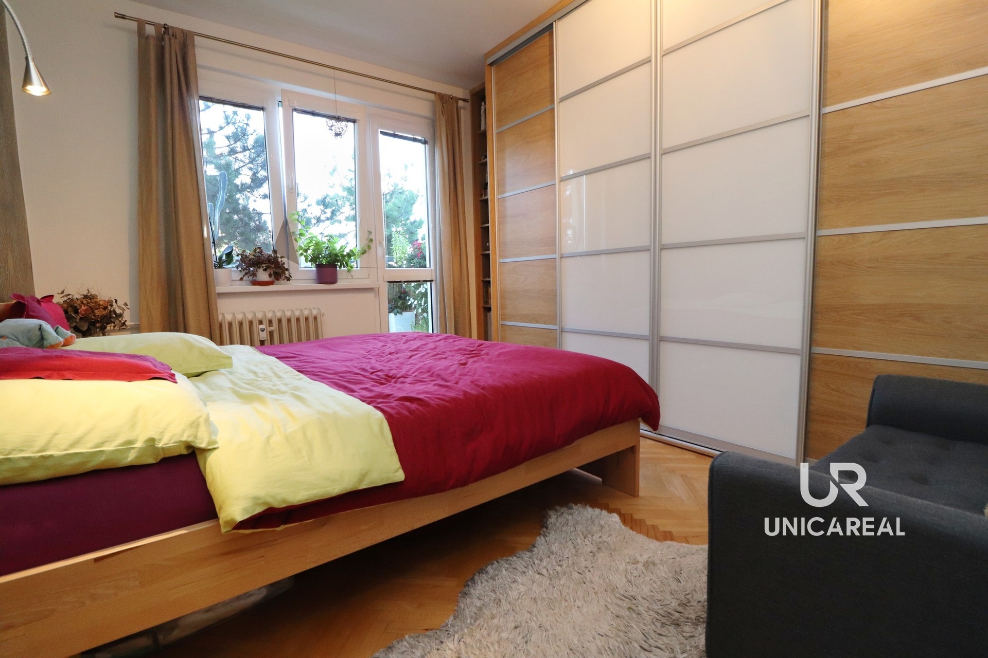 Dispozice bytu: předsíň 7.80 m2 s vestavěnou šatní skříní, koupelna s vanou a toaletou 3,5 m2, kuchyně 8,75 m2, dva neprůchozí pokoje – obývací pokoj s nikou 21,40 m2, ložnice 12,60 m2 se vstupem na balkon 2,12 m2. V ložnici byla v letošním roce zbudována nová vestavěná šatní skřín. K bytu náleží sklepní koje, možnost využívání kočárkárny-kolárny.