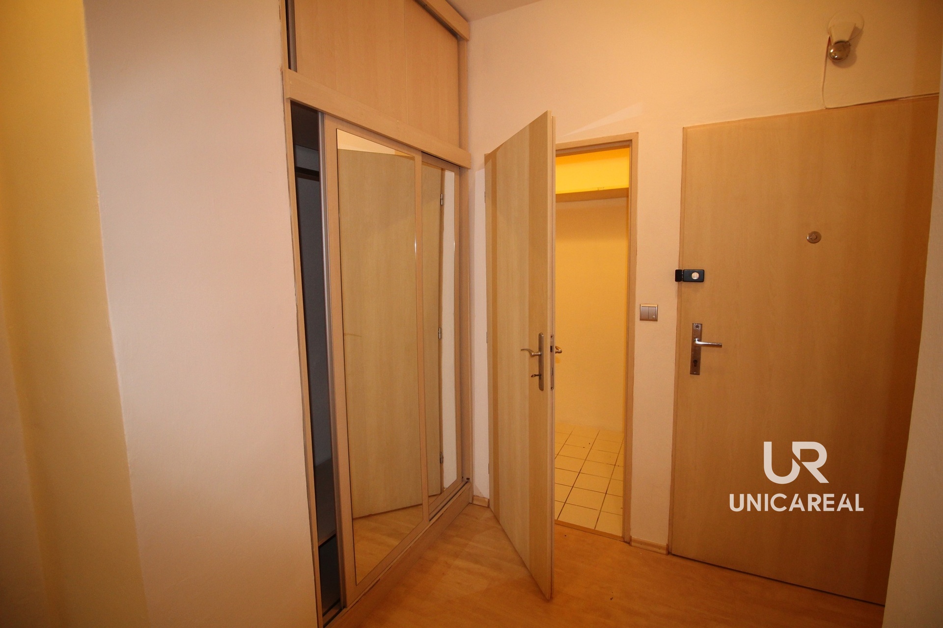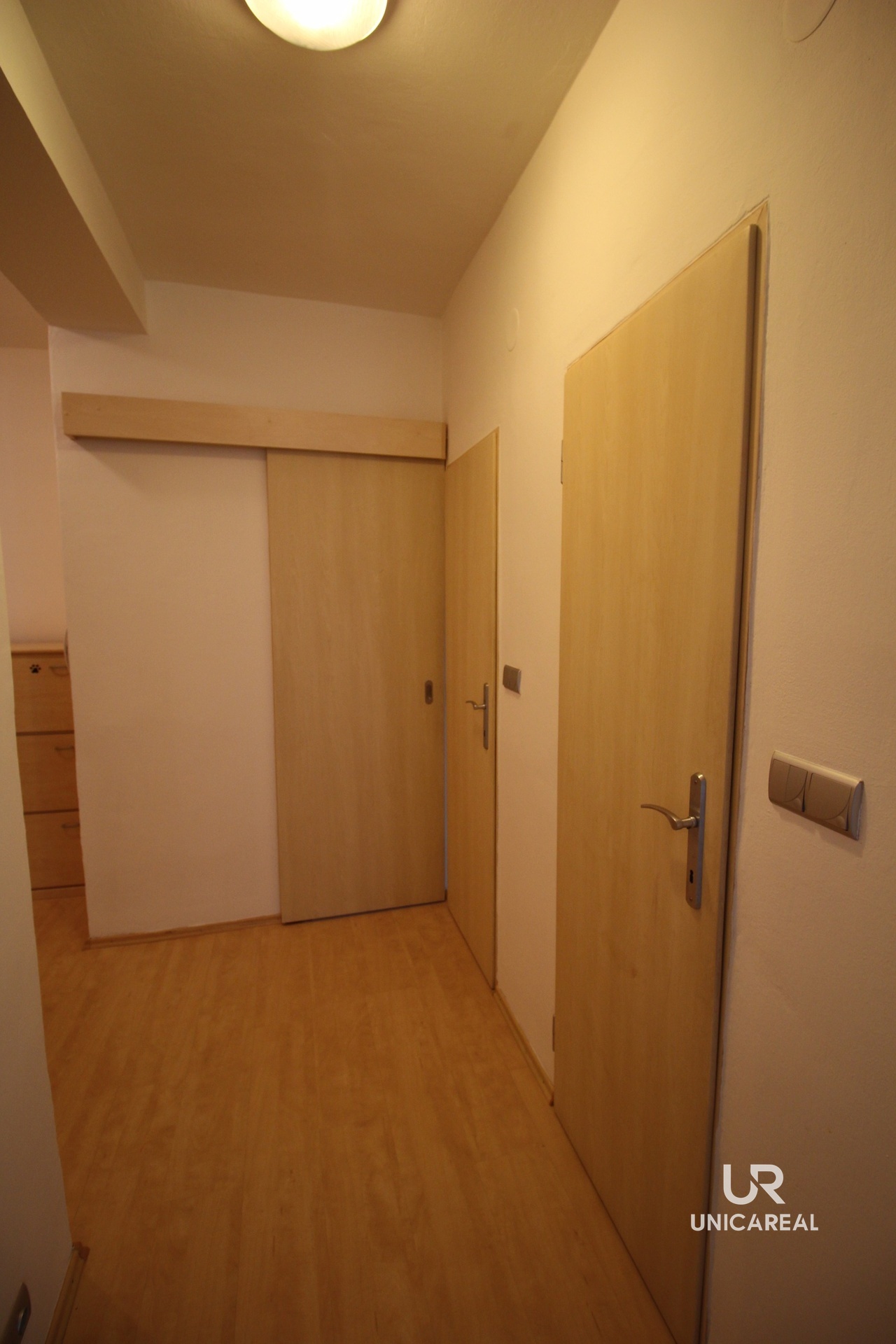 Dispozice bytu: prostorná předsíň s vestavěnou skříní, komora, koupelna se sprchovým koutem, samostatná toaleta, ložnice s vestavěnou skříní, obývací pokoj s kuchyňským koutem včetně kompletně vybavené kuchyňské linky vyrobené na míru. Z obývacího pokoje je vstup na prostornou lodžii.