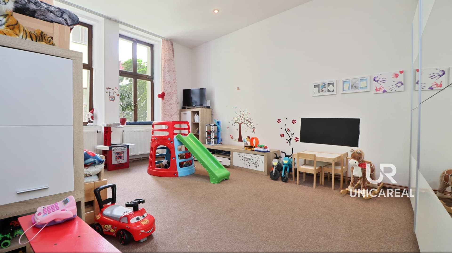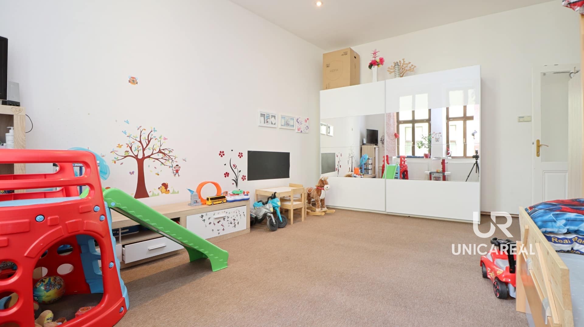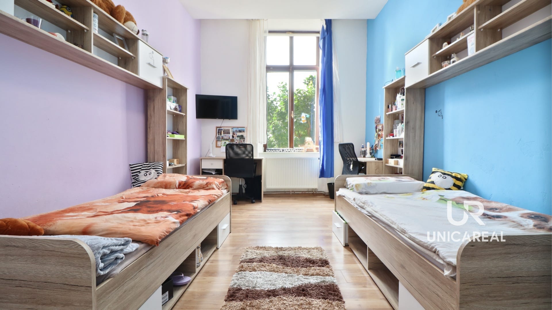 – centrální vstupní hala o výměře 13,2m2, komora 4,5 m2 , tři slunné pokoje o výměrách 28,1m2 se vstupem na balkon orientovaný do ulice, 24,7m2, 19,5 m2 s orientací do ulice a vnitrobloku.