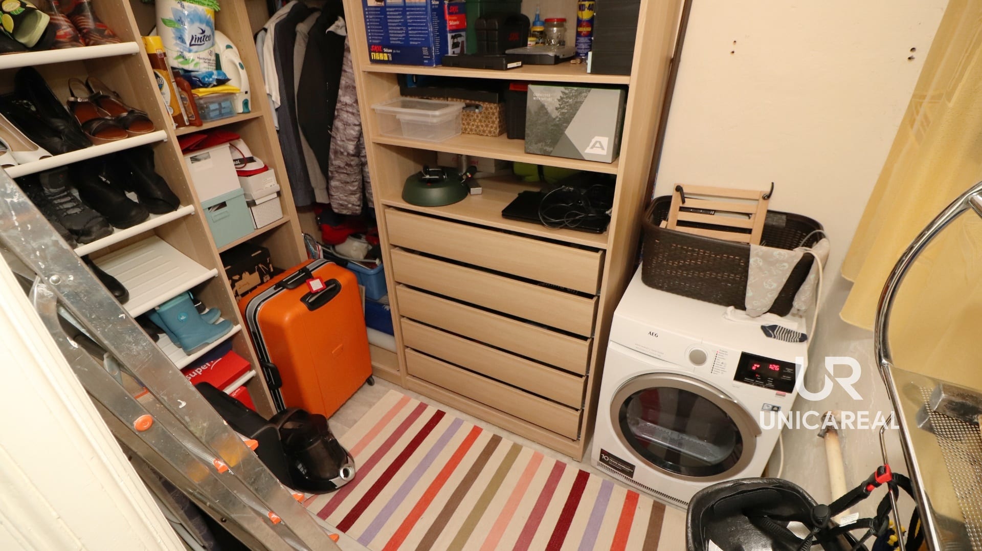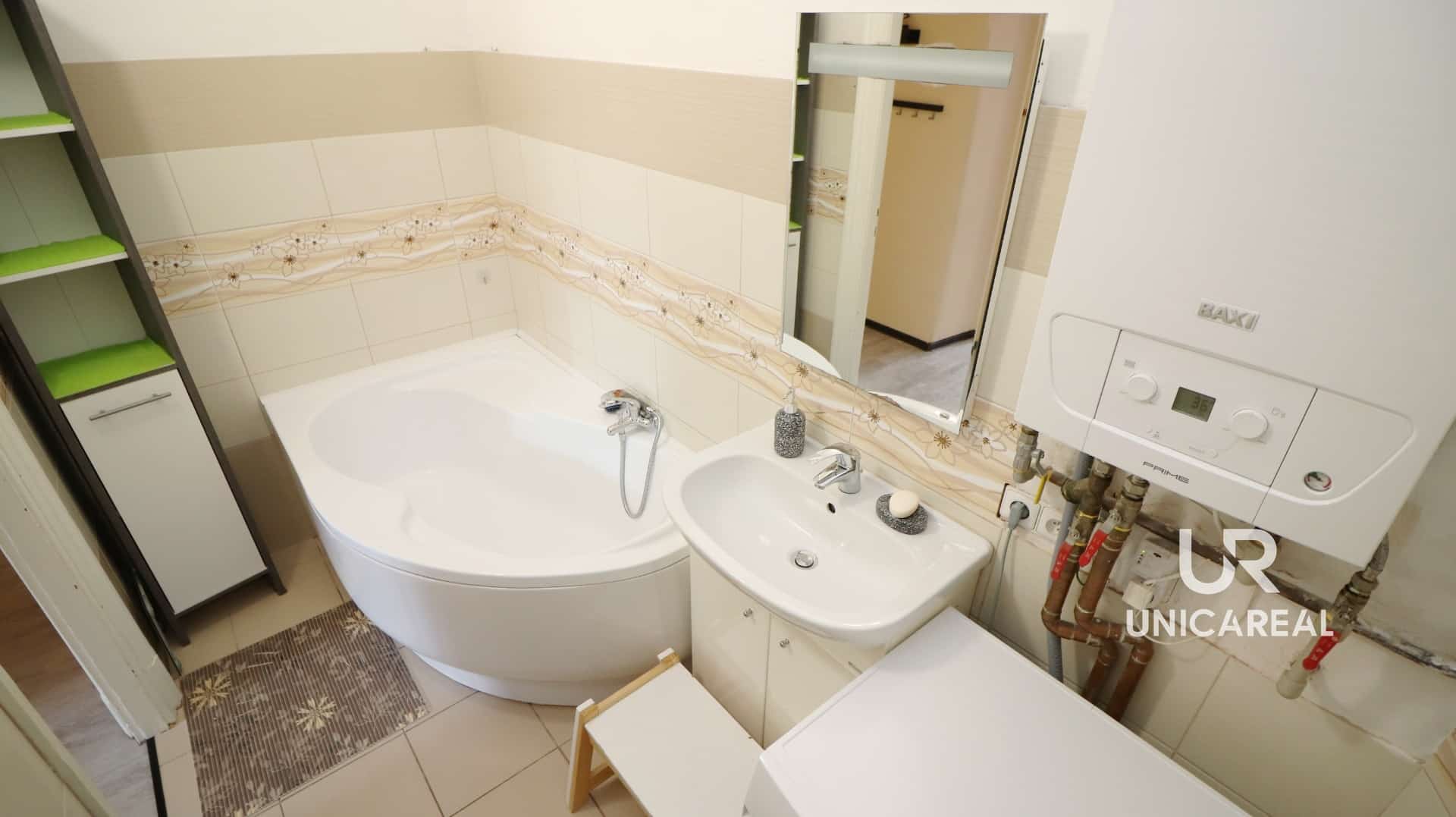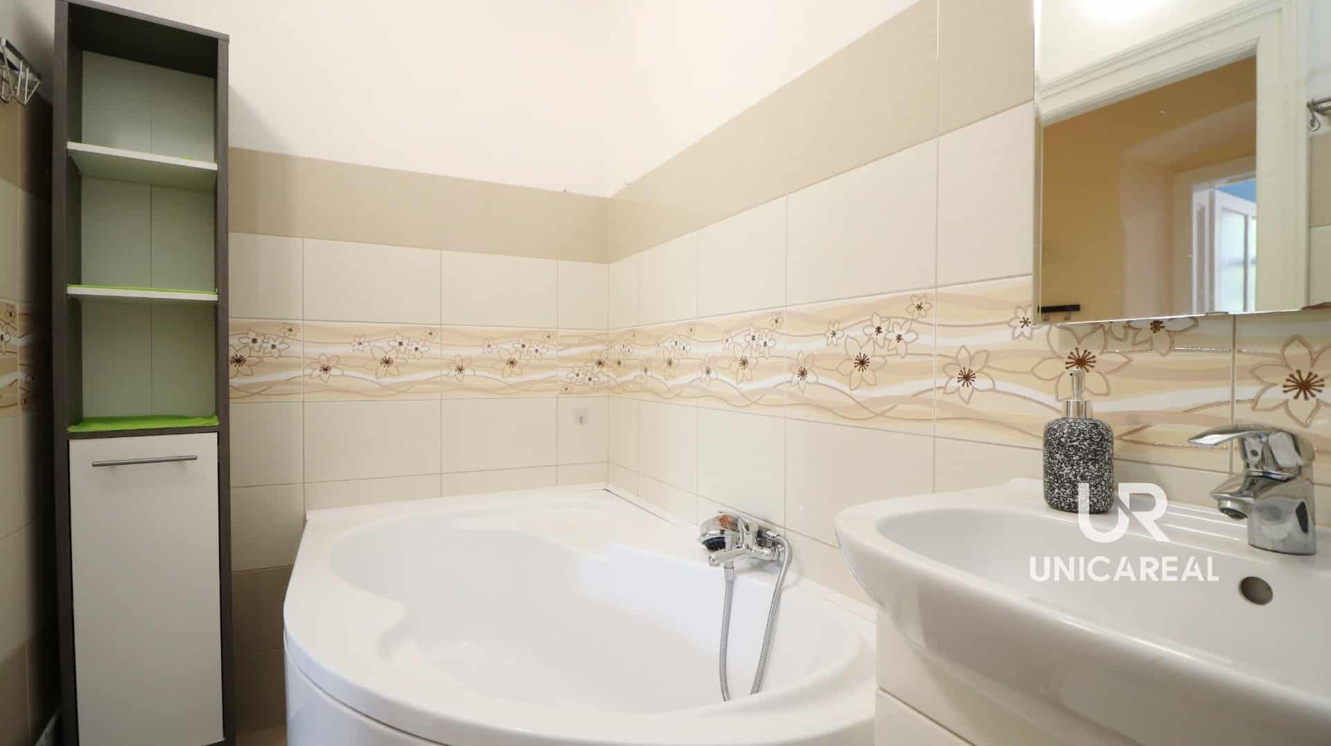 Koupelna 4,8 m2 s rohovou vanou, úložnými policemi, samostatná toaleta 1,4 m2. V koupelně je umístěn rok starý kotel zn. Baxi, který zajištuje ohřev vody a teplo v celém bytě. Neopomenutelným bonusem je pro majitele bytu komora a prostorný sklep.