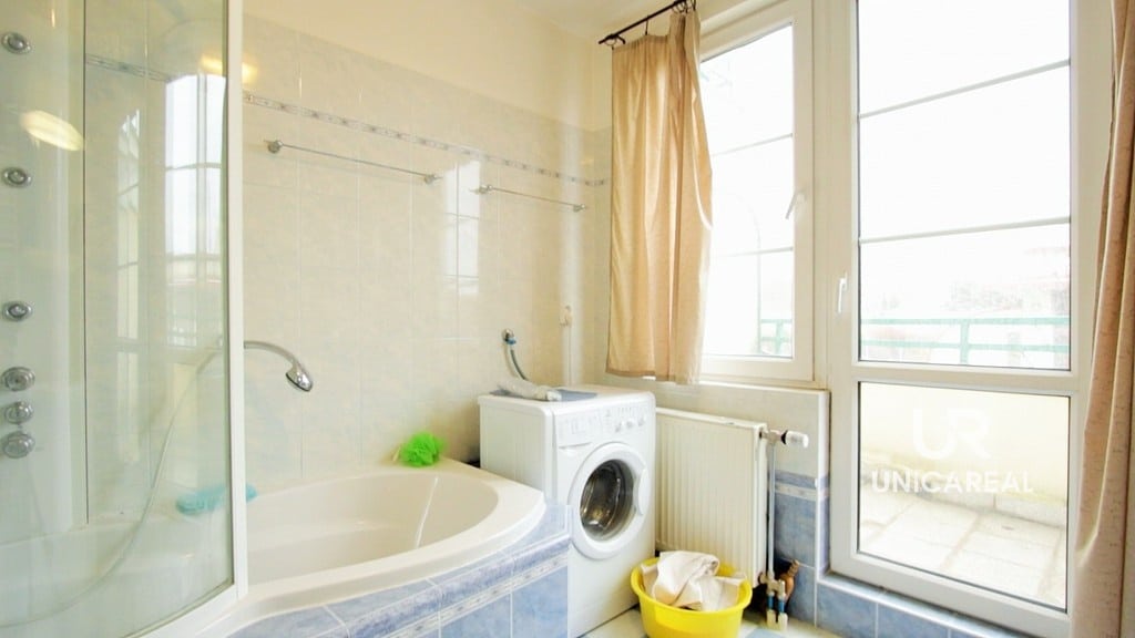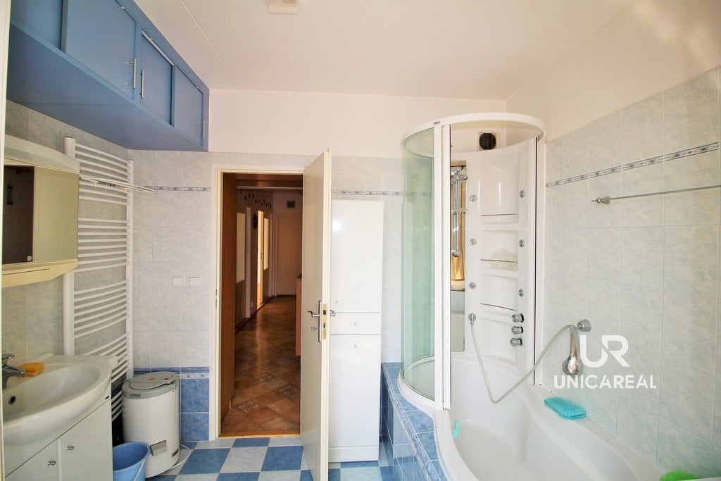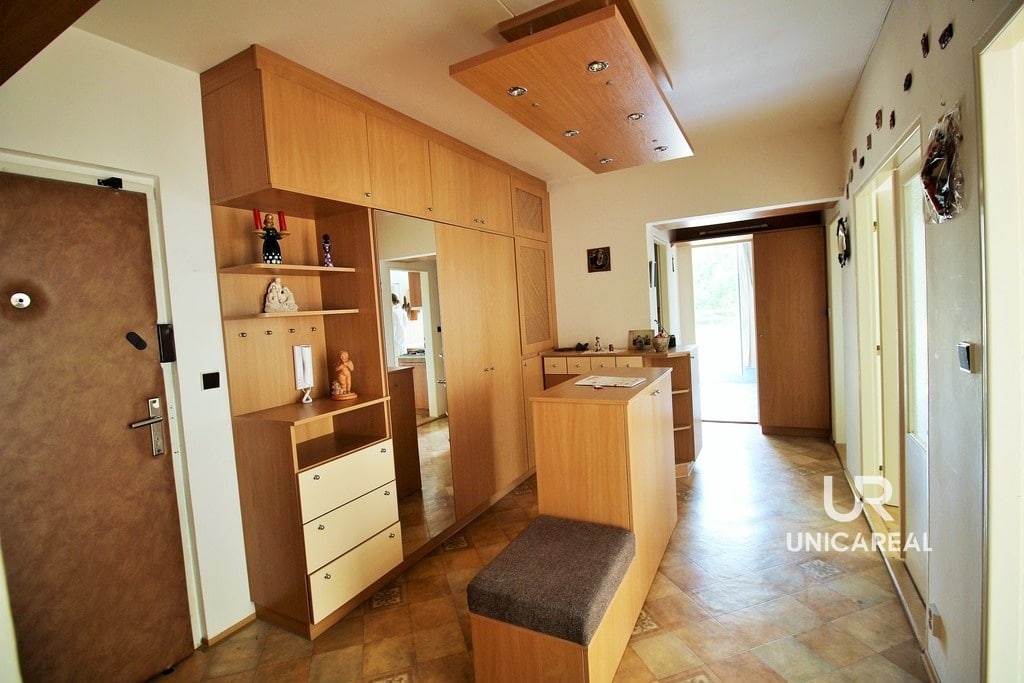 Dispozice bytu: prostorná vstupní hala s vestavěnými skříněmi, šatna, ložnice, obývací pokoj se zasklenou lodžií, kuchyně s kuchyňkou linkou a zabudovanými spotřebiči, prostorná koupelna s vanou, nábytek na míru, vstup na balkon, samostatná toaleta. Pokoje mají samostatné vstupy.