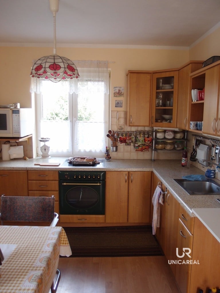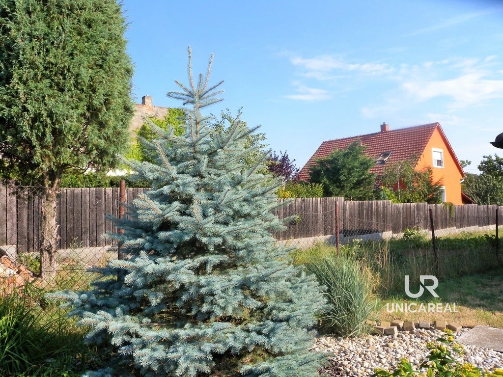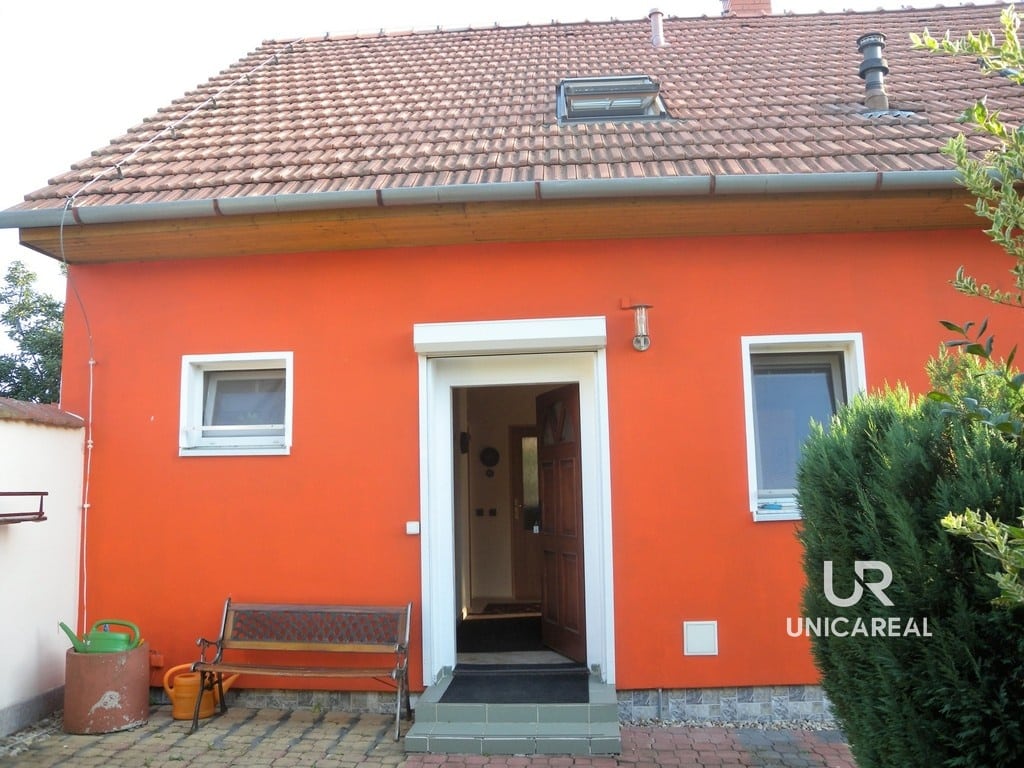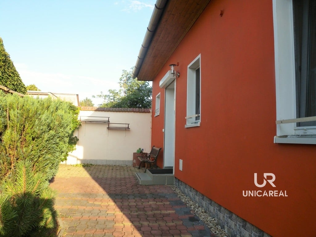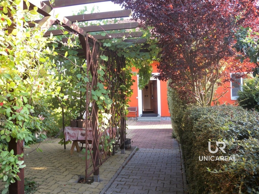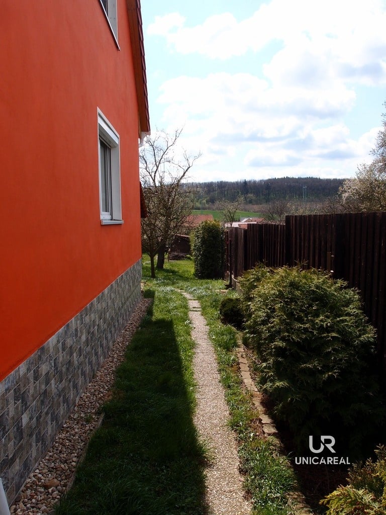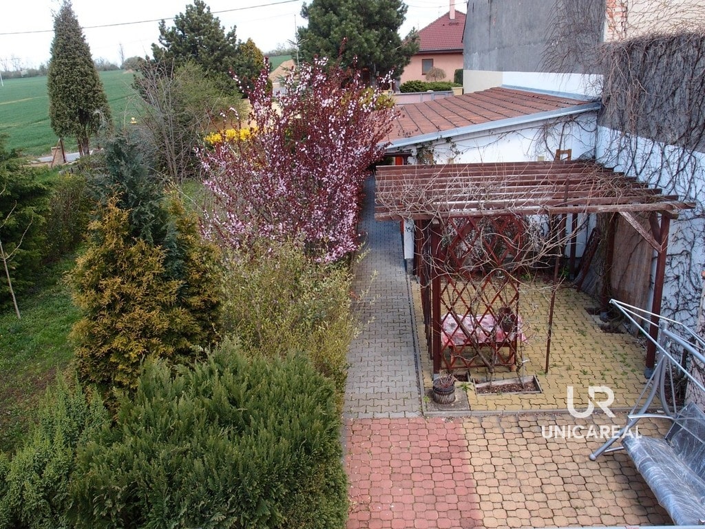 Zahrada je rozdělena na část užitkovou s ovocnými stromy (jablka, meruňky, švestky a ořech) a část okrasnou. K domu náleží zasklená terasa o ploše 24 m2, kterou je možno využít také jako zimní zahradu. Samostatně stojící garáž je využita z poloviny jako dílna. Topení je zajištěno kotlem na plyn nebo krbovými kamny. Odpad je sveden do vlastní čistírny odpadních vod.