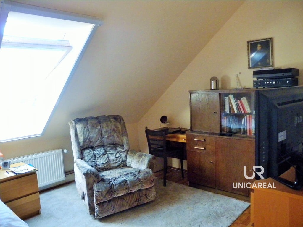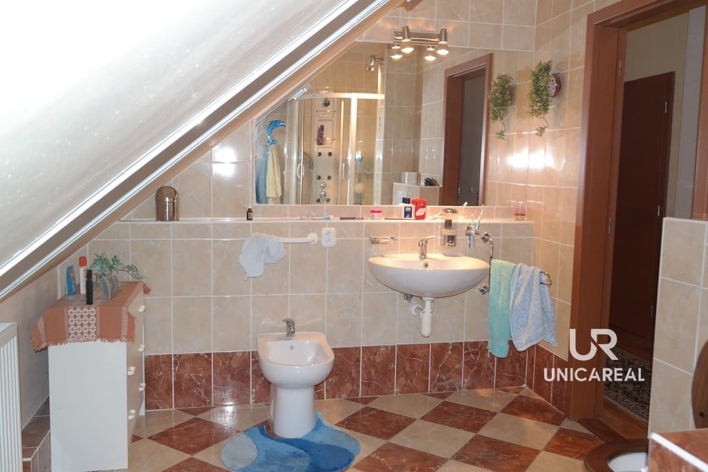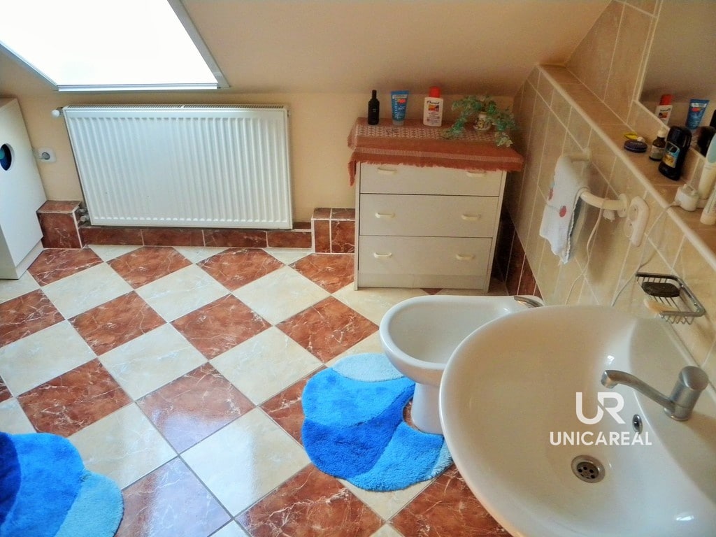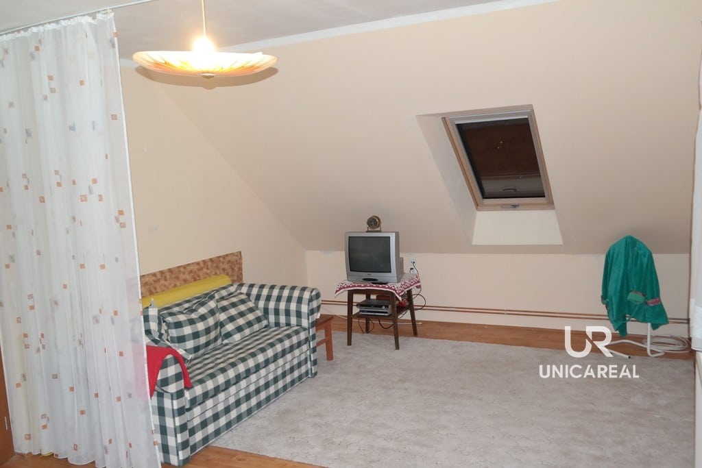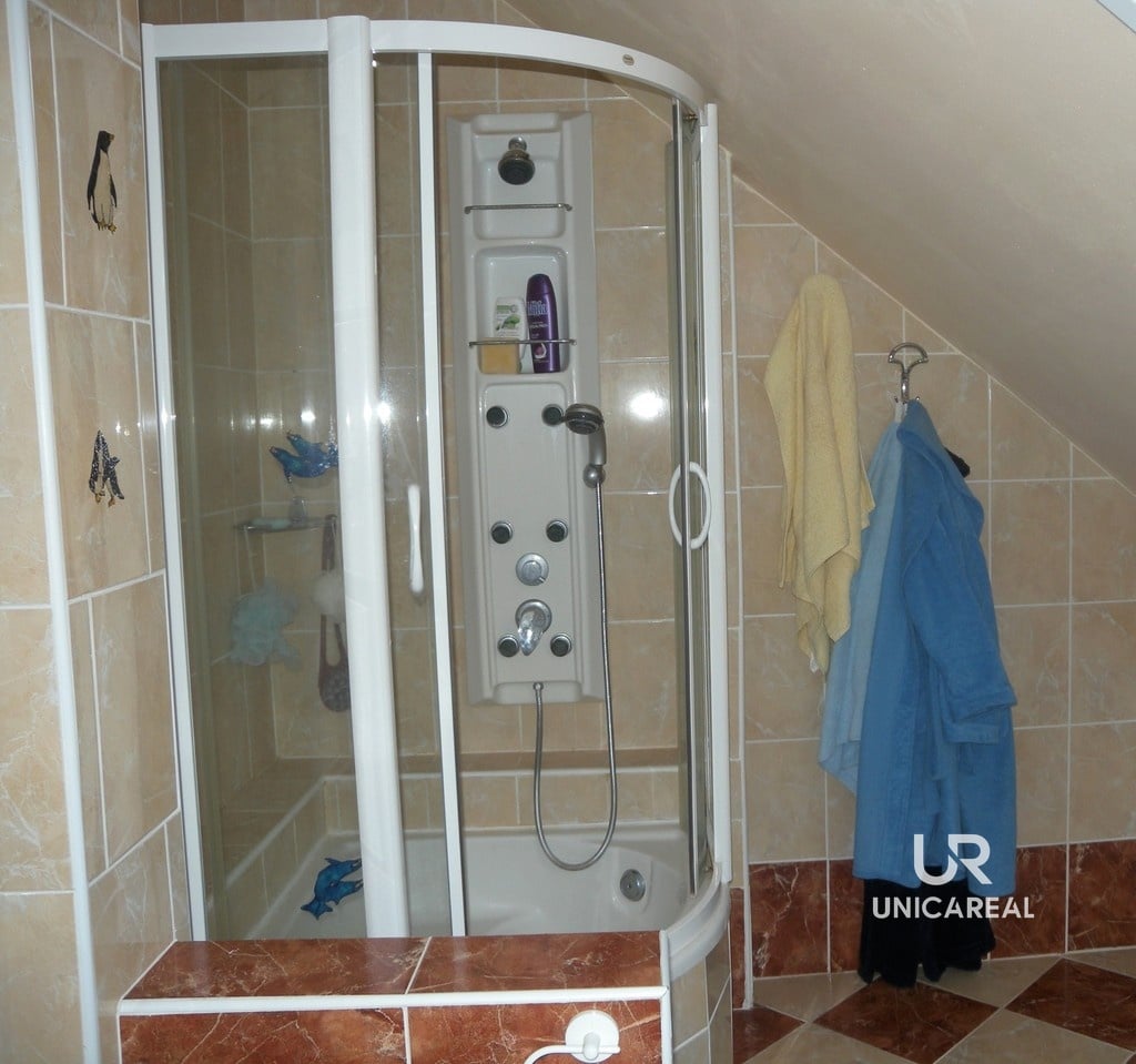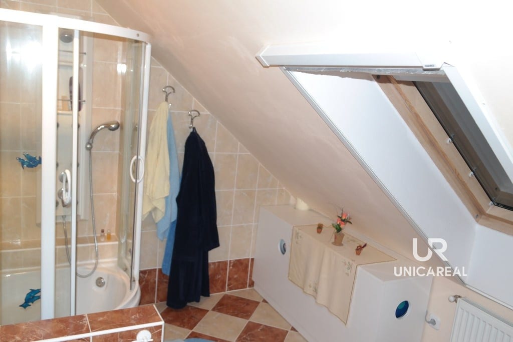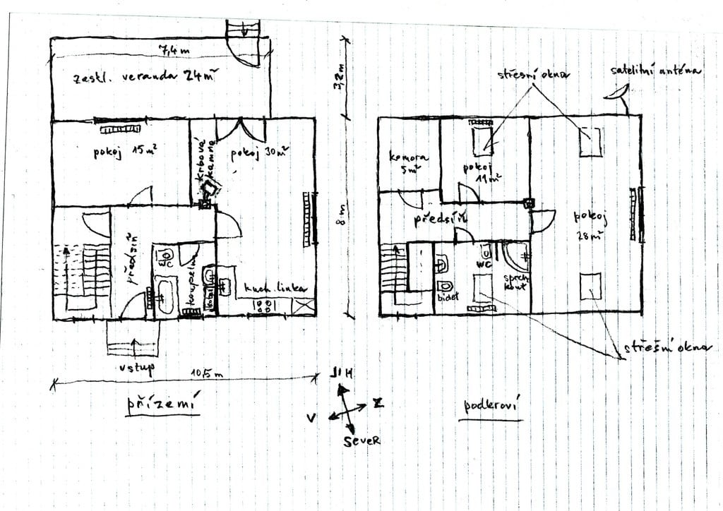 Dispozice domu se dvěma koupelnami: v přízemí domu koupelna s WC, pokoj 15 m2, pokoj s kuchyňskou linkou 30 m2 a zasklená veranda 24 m2. V patře pokoj 28 m2, pokoj 11 m2, komora 5 m2 a koupelna s WC, bidetem a sprchovým koutem (viz. plánek).