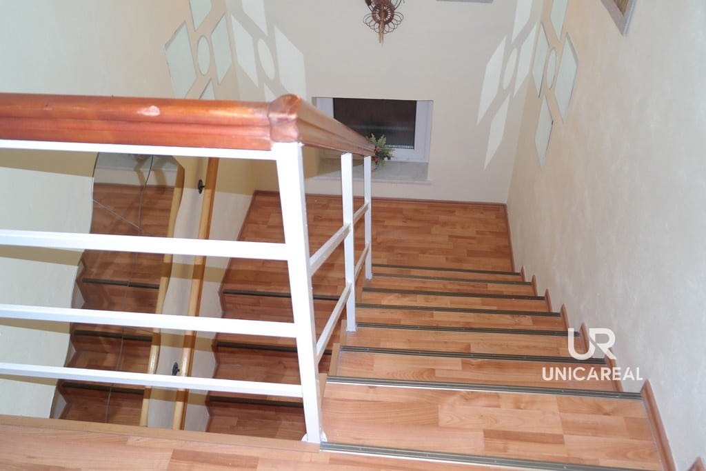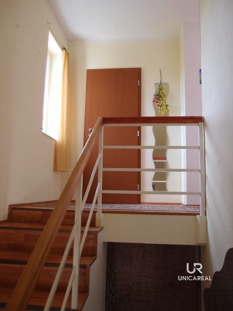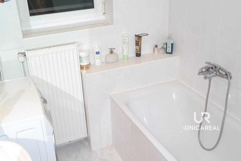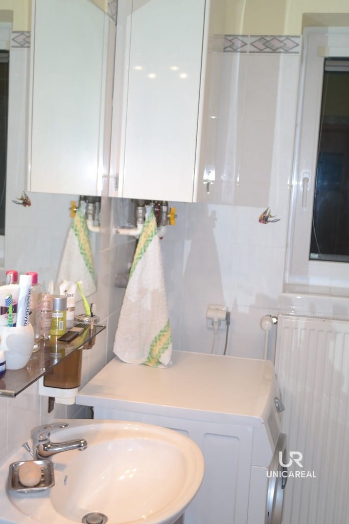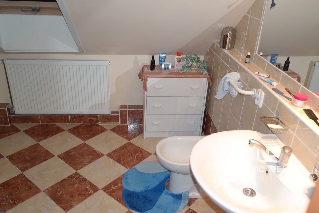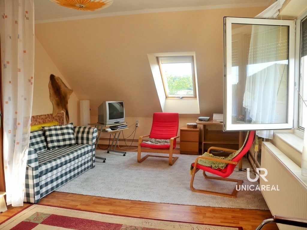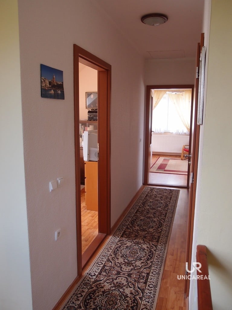 Dispozice domu se dvěma koupelnami: v přízemí domu koupelna s WC, pokoj 15 m2, pokoj s kuchyňskou linkou 30 m2 a zasklená veranda 24 m2. V patře pokoj 28 m2, pokoj 11 m2, komora 5 m2 a koupelna s WC, bidetem a sprchovým koutem (viz. plánek).