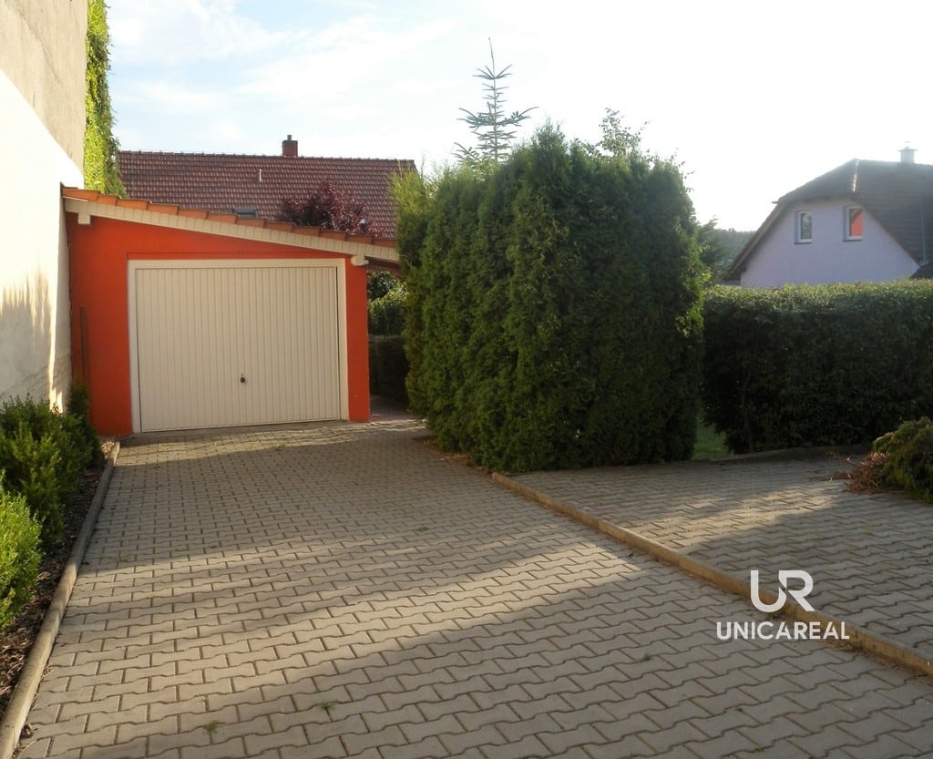 Brána do vjezdu i garážová vrata jsou na dálkové ovládání. Na pozemku je také možnost parkování dalších 2 až 3 aut.