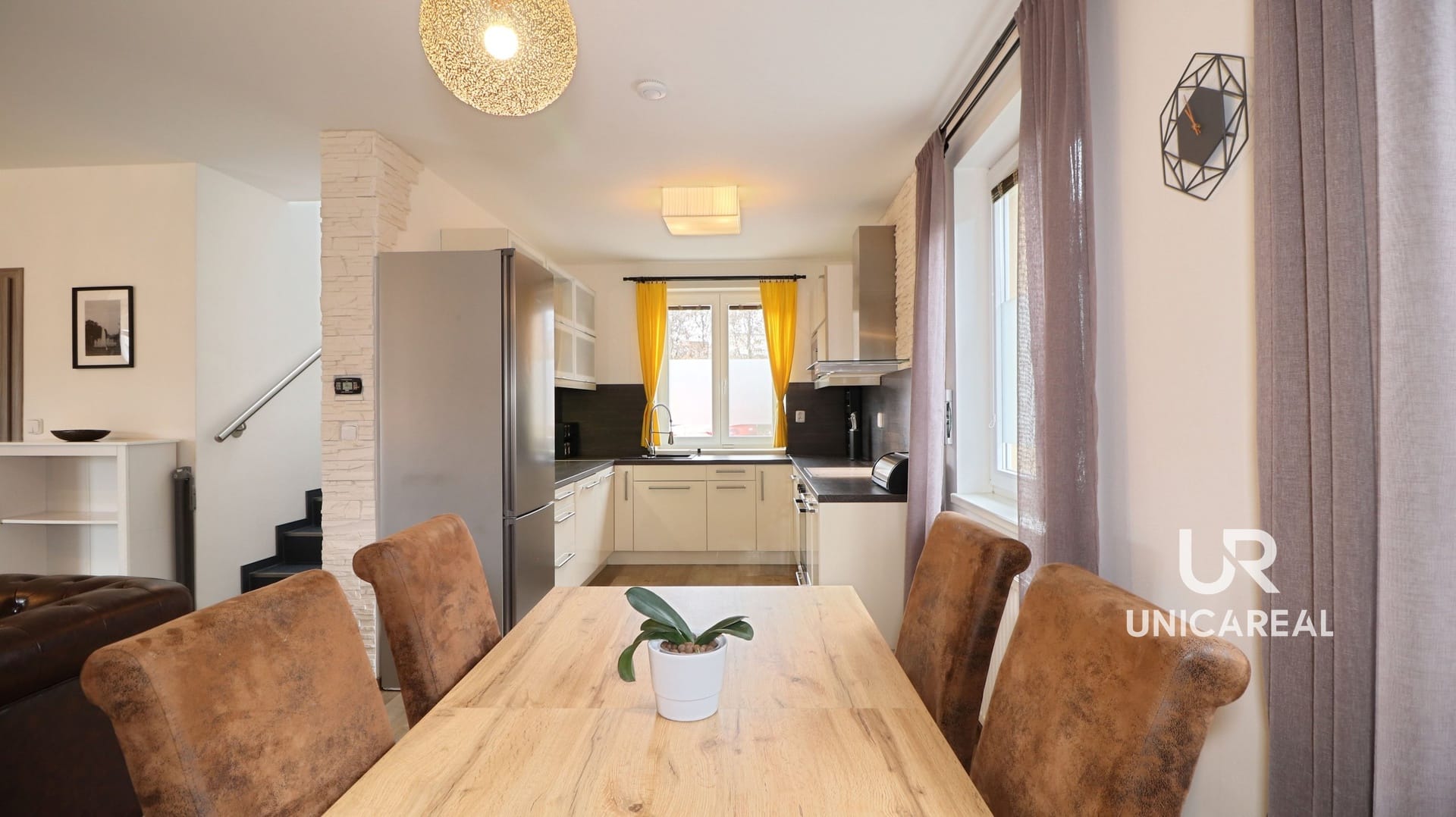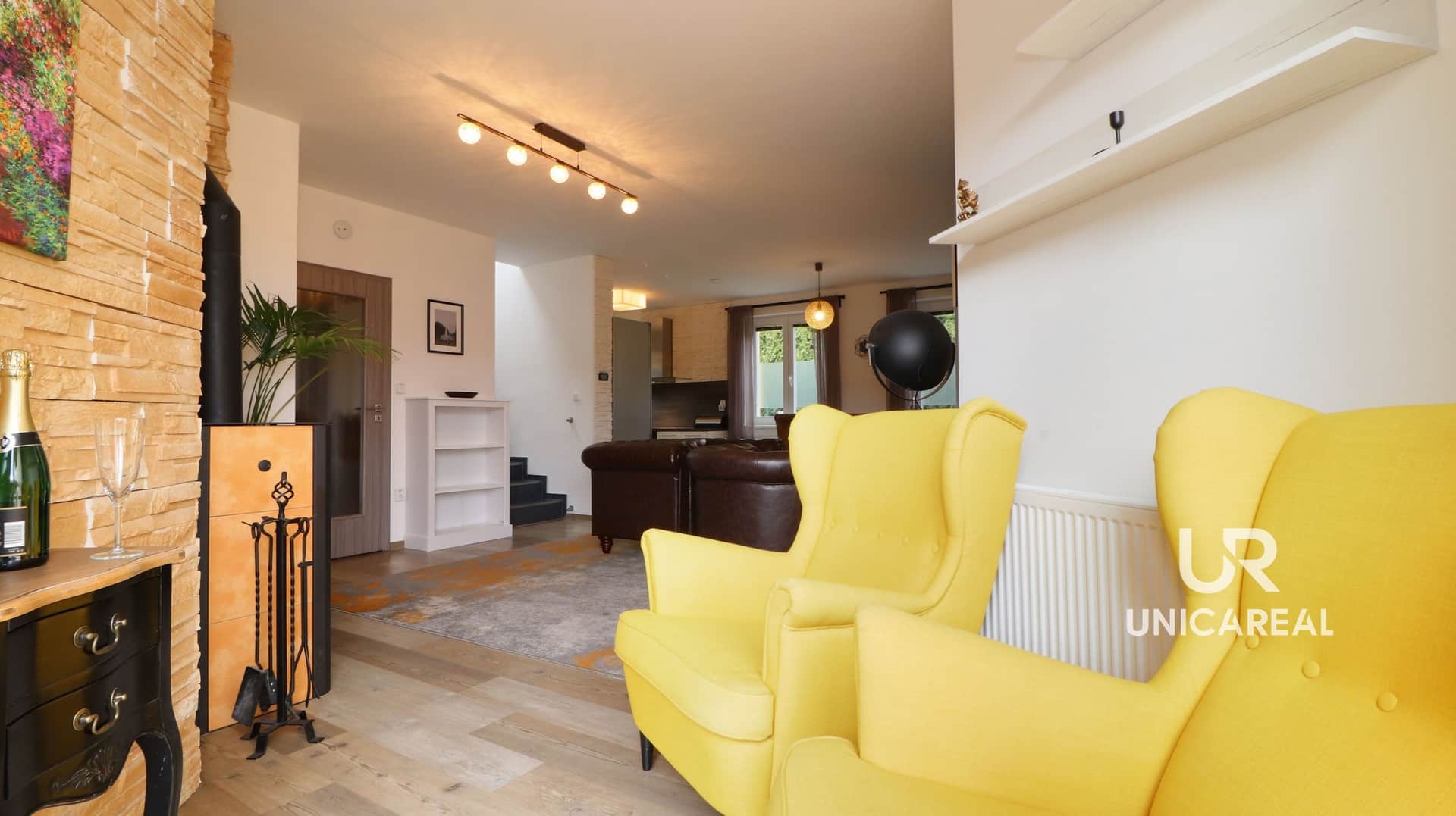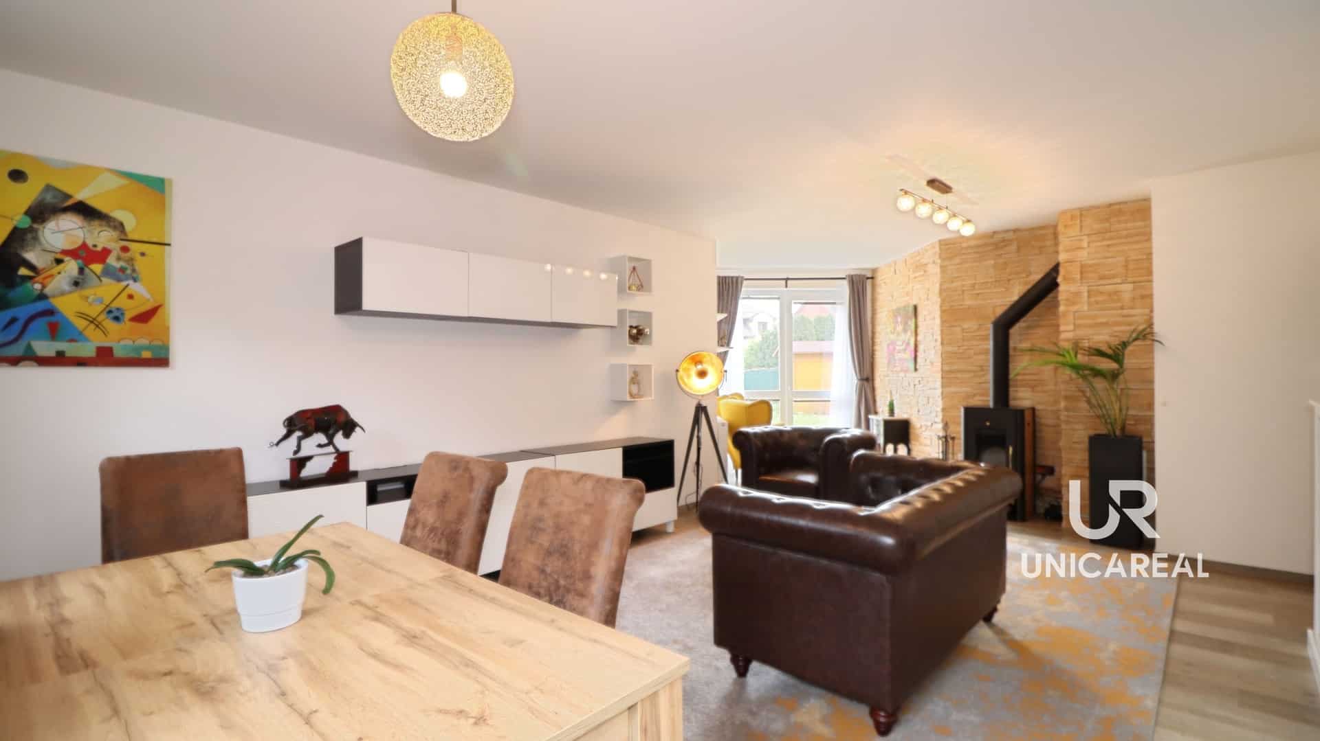 V 1.n.p se nachází dominantní obývací pokoj s kuchyní a jídelní částí. Součástí tohoto prostoru je stylový krb s výměníkem, který krom příjemné atmosféry zajistí i teplo domova. Tento zdroj tepla lze kombinovat s plynovým kotlem, který je kombinovaný i na ohřev vody a nachází se také v 1.n.p. Ve vstupní předsíní je umístěna vestavěná skříň. Na patře je i WC s umyvadlem. Z obývacího pokoje je přímý vstup na terasu a zahradu.