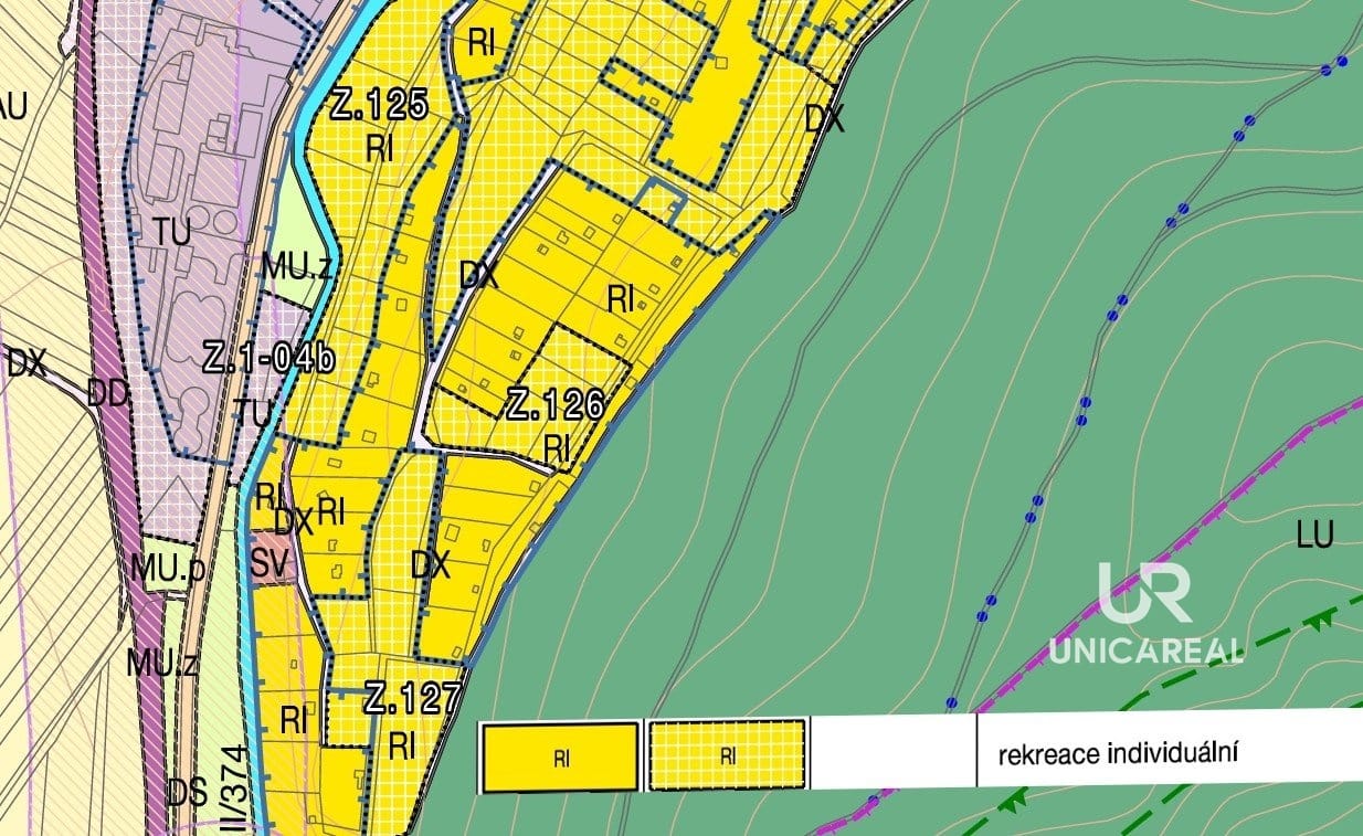 Pozemek je dle územního plánu určen k individuální rekreaci a je zde možnost postavit jednopodlažní rekreační objekt..