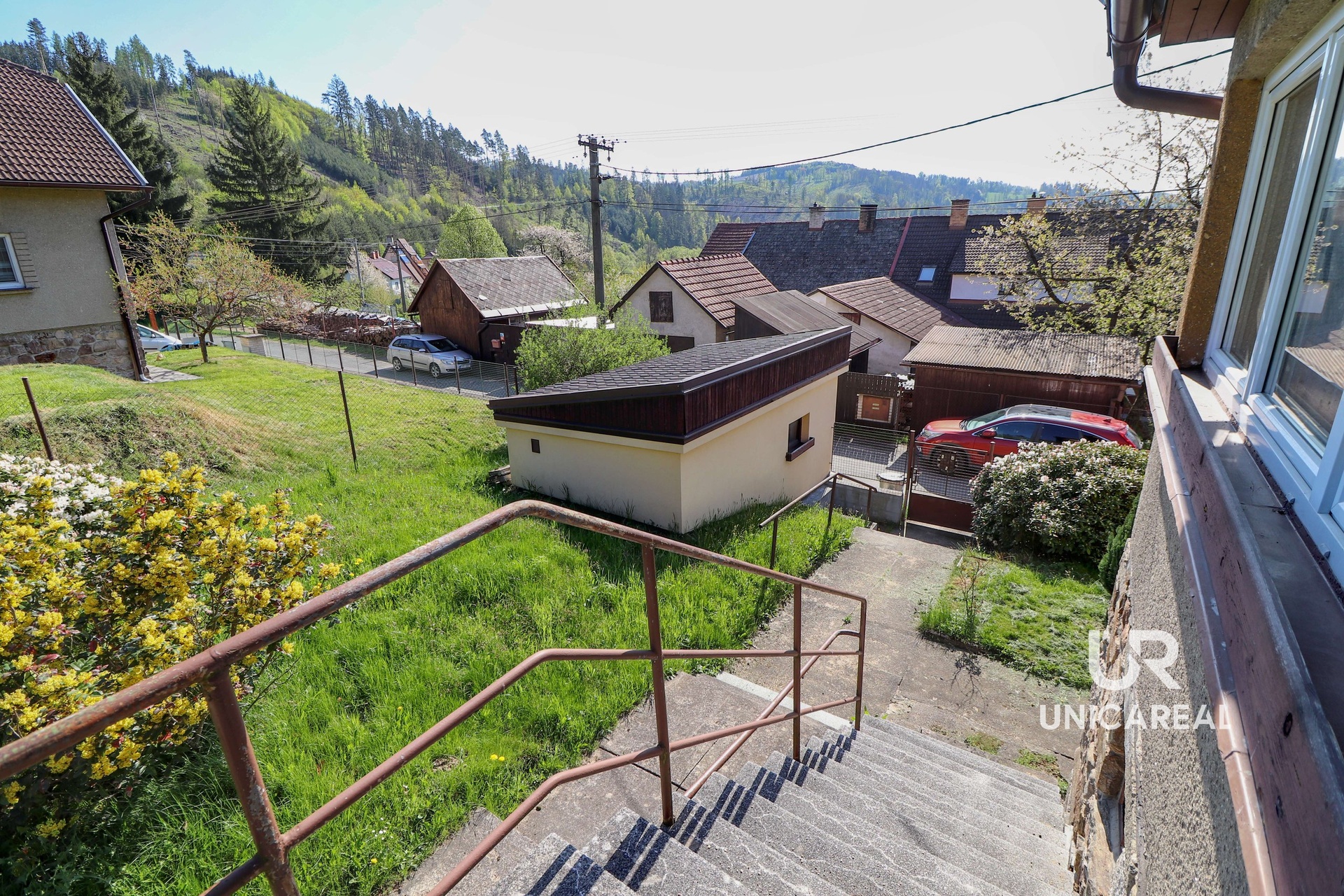 Pozemek o rozměru 1173m2 leží ve svahu a proto jsou zde krásné výhledy do krajiny. Na pozemku se nachází hlavní budova, přístavba a spodní garáž. K přístavbě, kde je horní garáž, se vjíždí horní bránou po nezpevněné cestě. Pro lepší představu o situaci pozemku jsou přiloženy v prezentaci fotografie z dronu.