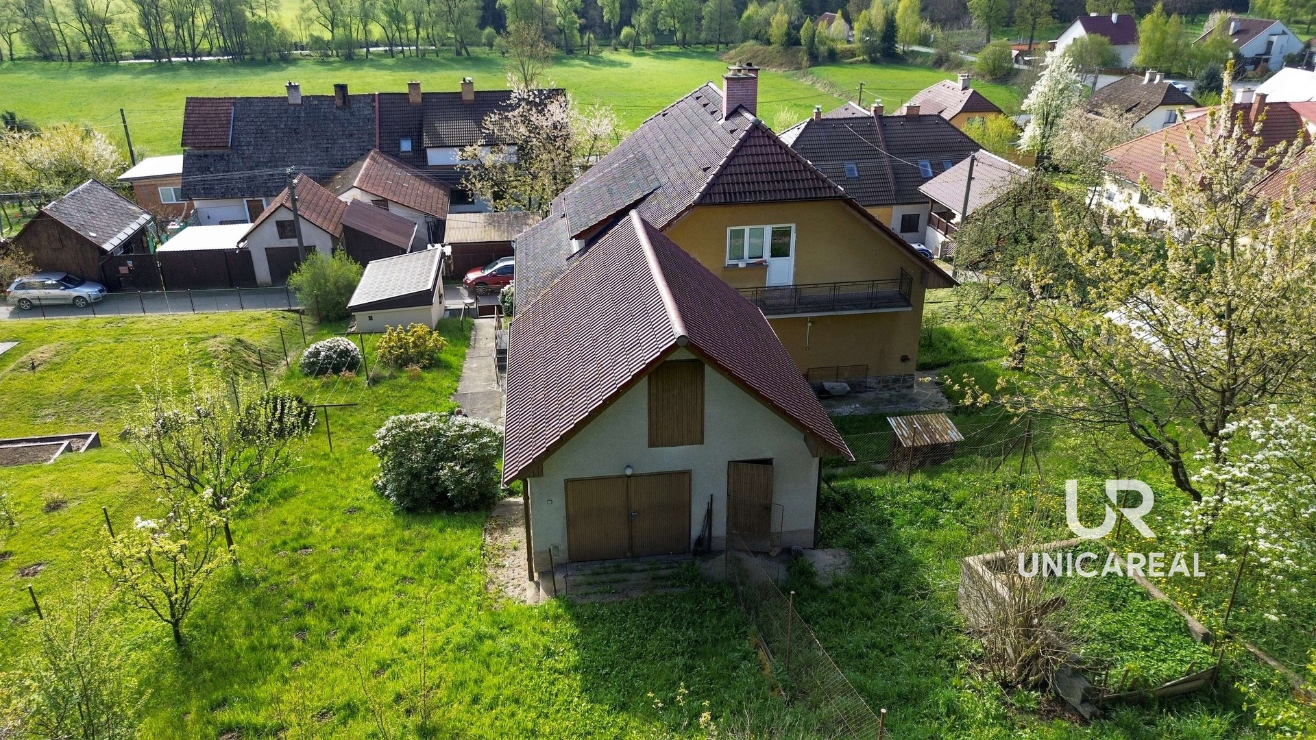 Pozemek o rozměru 1173m2 leží ve svahu a proto jsou zde krásné výhledy do krajiny. Na pozemku se nachází hlavní budova, přístavba a spodní garáž. K přístavbě, kde je horní garáž, se vjíždí horní bránou po nezpevněné cestě. Pro lepší představu o situaci pozemku jsou přiloženy v prezentaci fotografie z dronu.