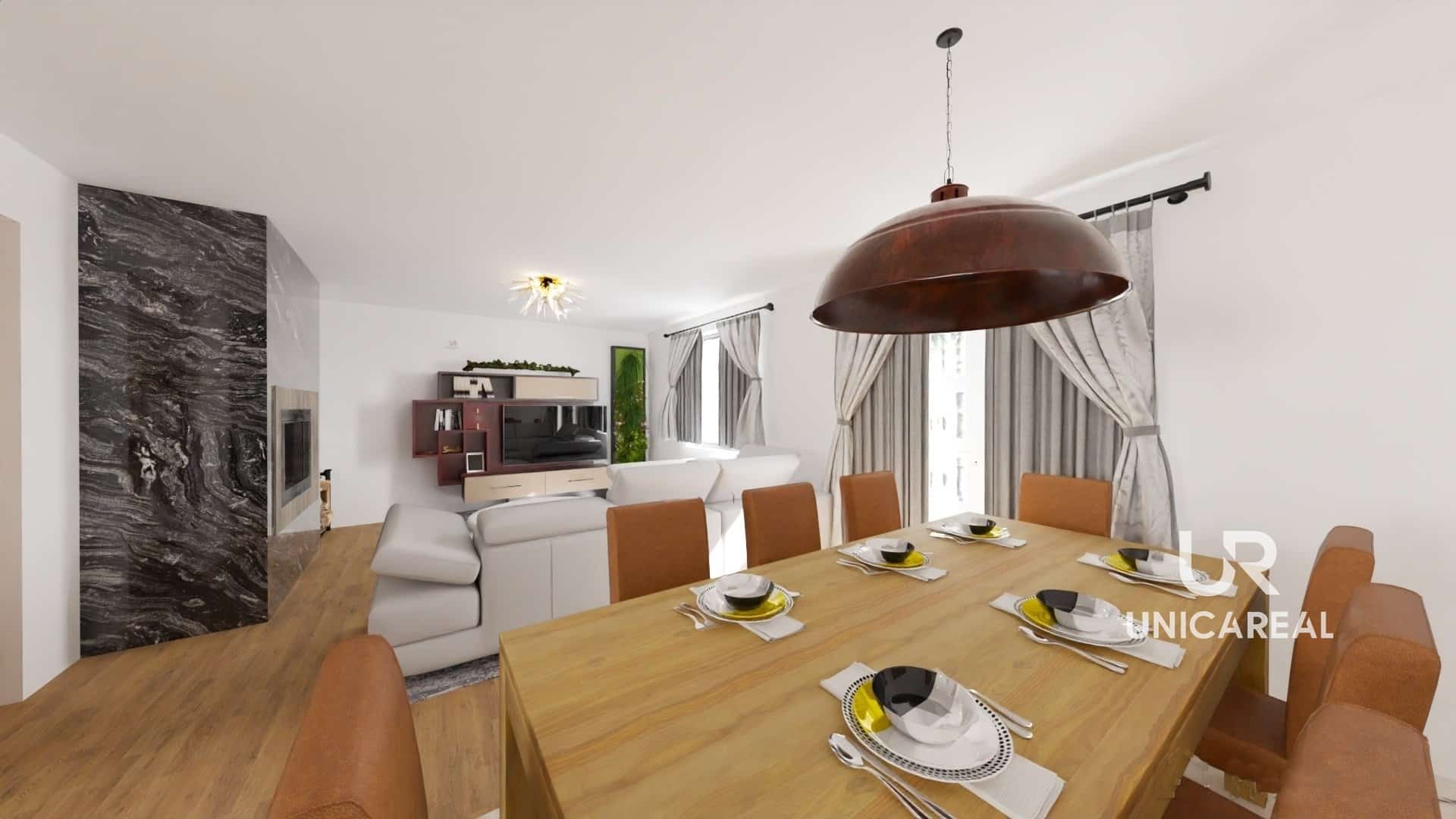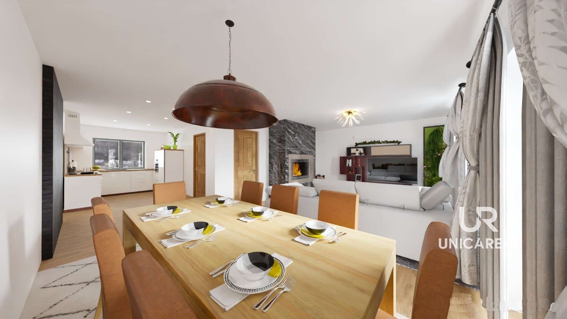 Prostorný obývací pokoj (45 m²) s kuchyní, kde si můžete užít rodinné chvíle a díky francouzskému oknu plynule přejít na zahradu. Navíc s přípravou na krb, který dodá tu správnou atmosféru.
