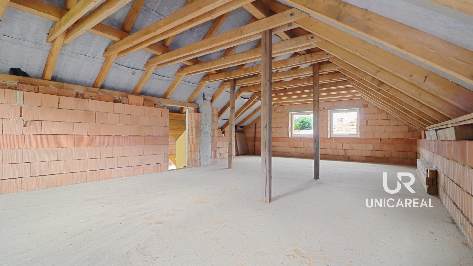 Střecha sedlová s plechovou krytinou Borga (se vzhledem pálené tašky) , možnost vybudování podkrovního bydlení s rozlohou 69 m2.