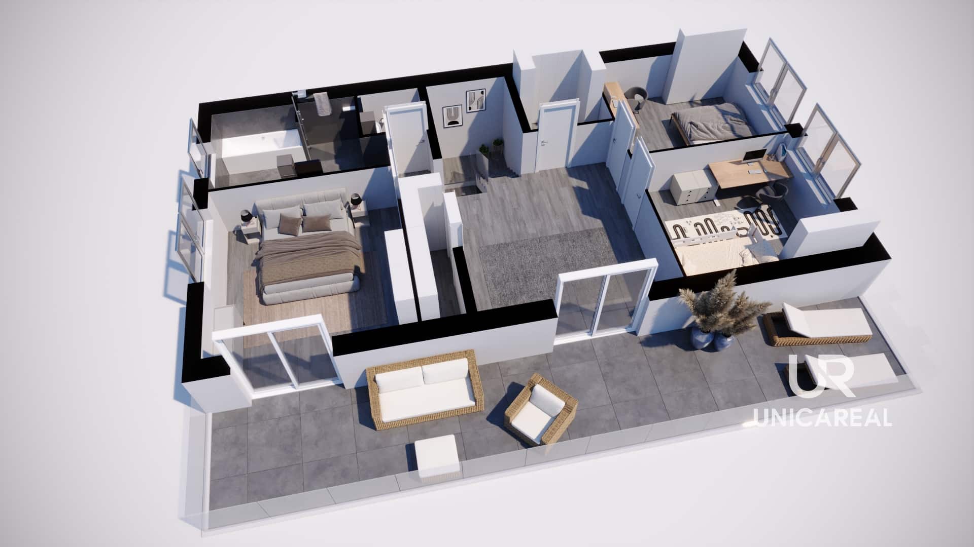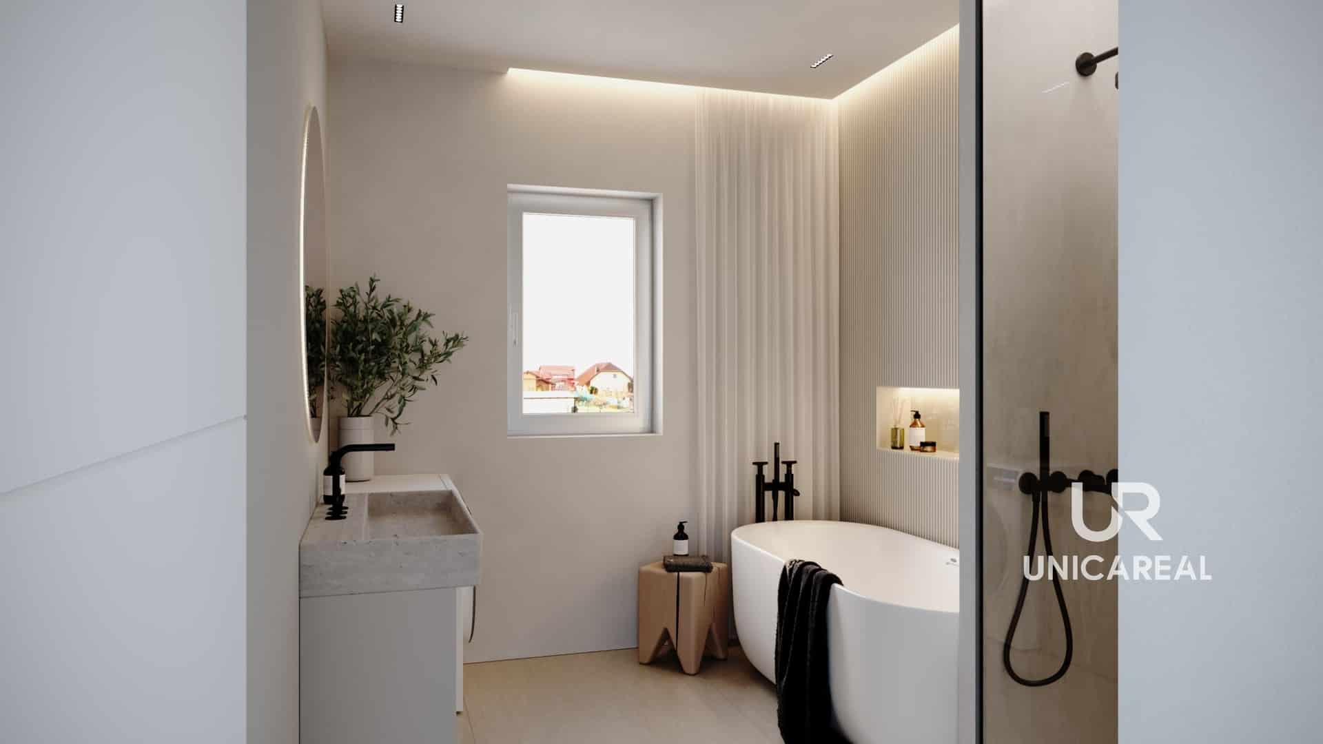 V poschodí je umístěná prostorná koupelna 9,45m² připravená na vanu se sprchovým koutem, samostatná toaleta s bidetem 2,23 m². Z obytné haly 21,66 m² je vstup do tří neprůchozích pokojů 18,85 m², 14,74m² a 13,96 m², nechybí zde ani potřebná šatna 2,56 m².