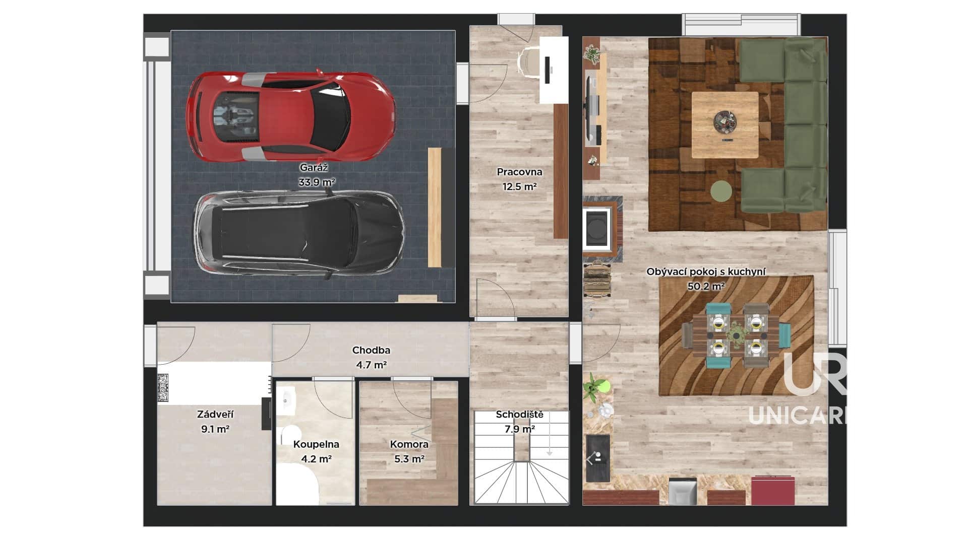Pro maximální pohodlí je součástí přízemí i koupelna s toaletou 4,07 m² a nepostradatelná komora 5,12 m² (technická místnost).