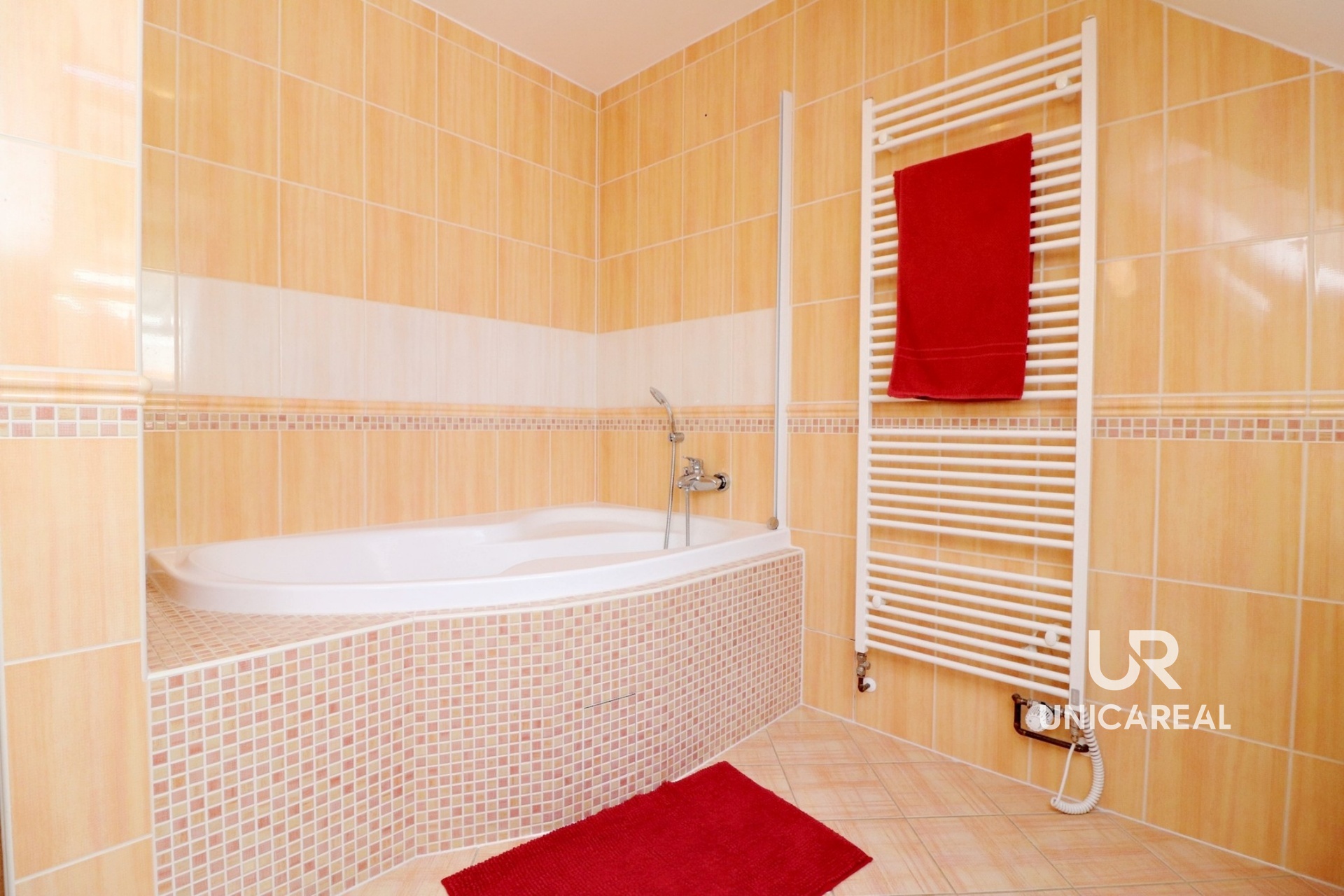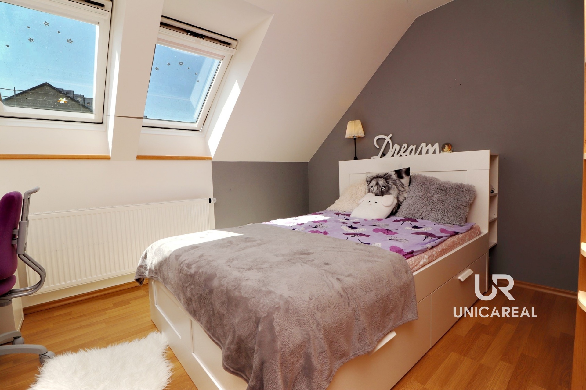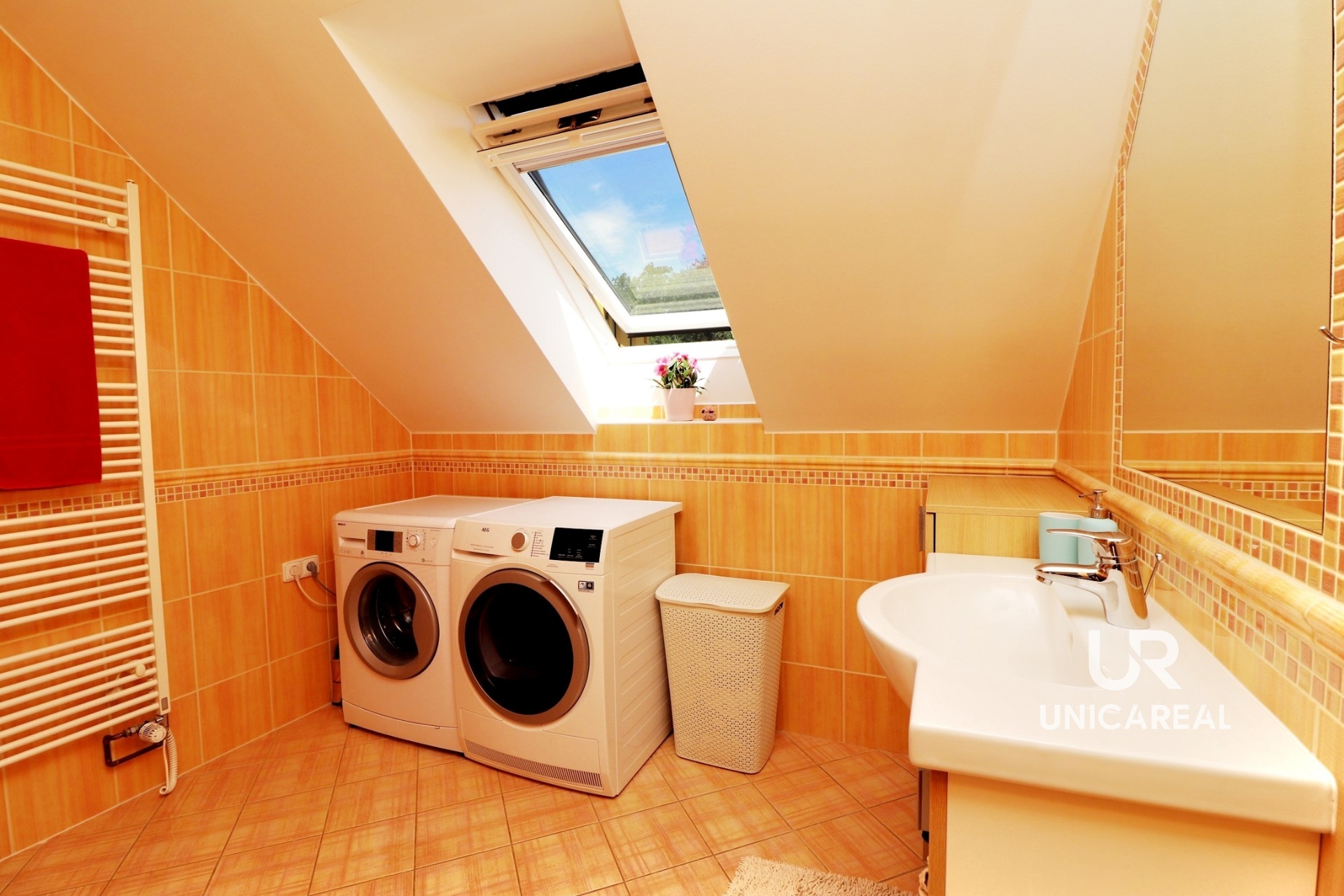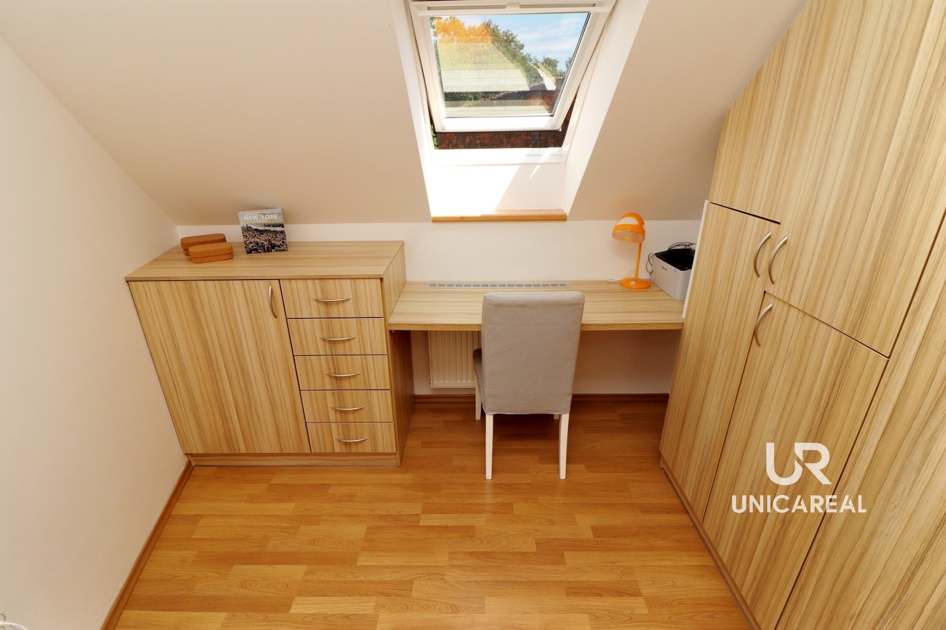 Podkroví: chodba 5,85 m2, prostorná koupelna s vanou 7 m2, samostatná toaleta 3,3 m2, tři samostatné pokoje (ložnice – 14,37 m2 se šatnou 8,20 m2 s možností využití i jako pracovna, dětské pokoje 12 m2 a 11,6 m2). V domě je centrální vysavač.
