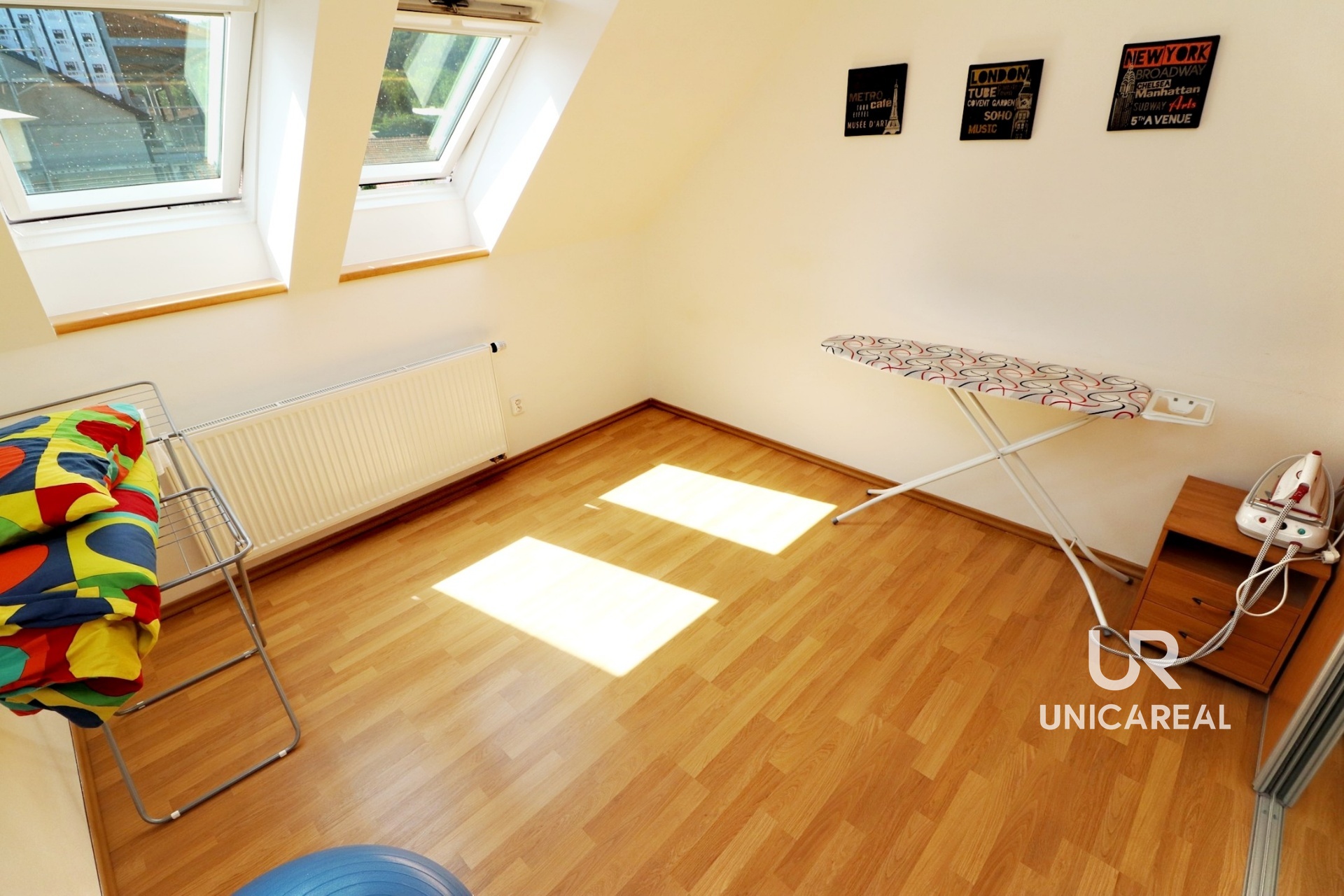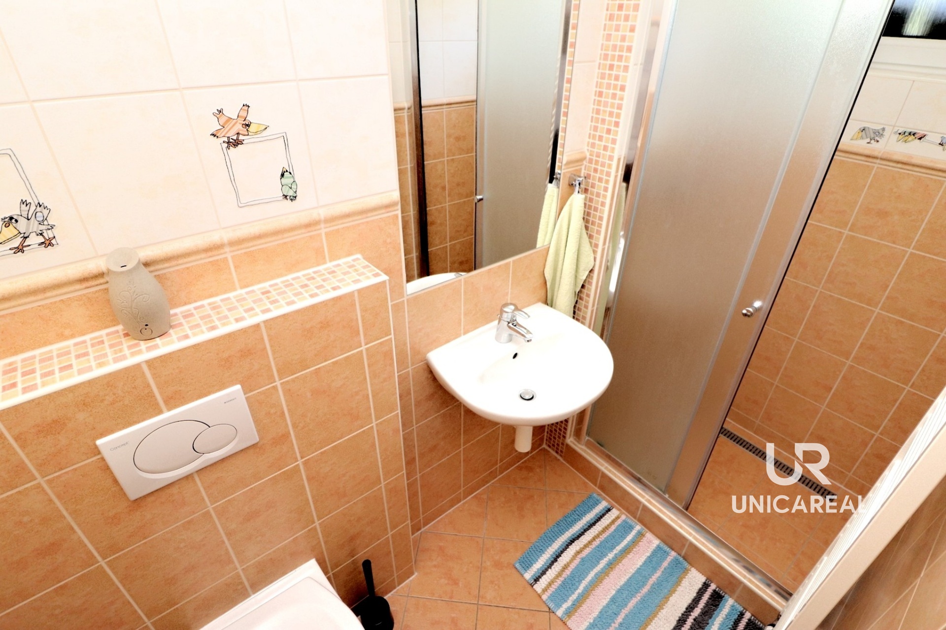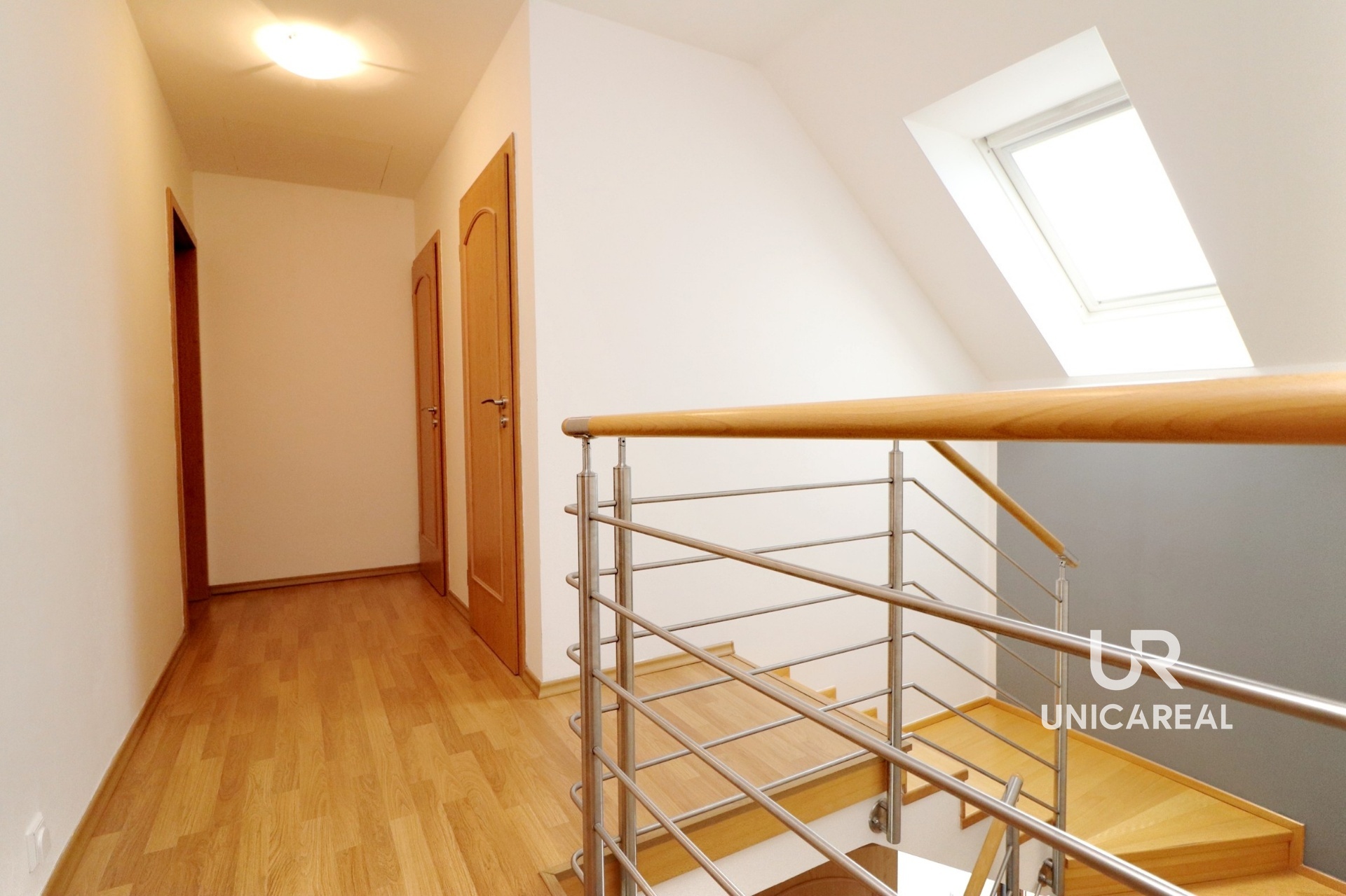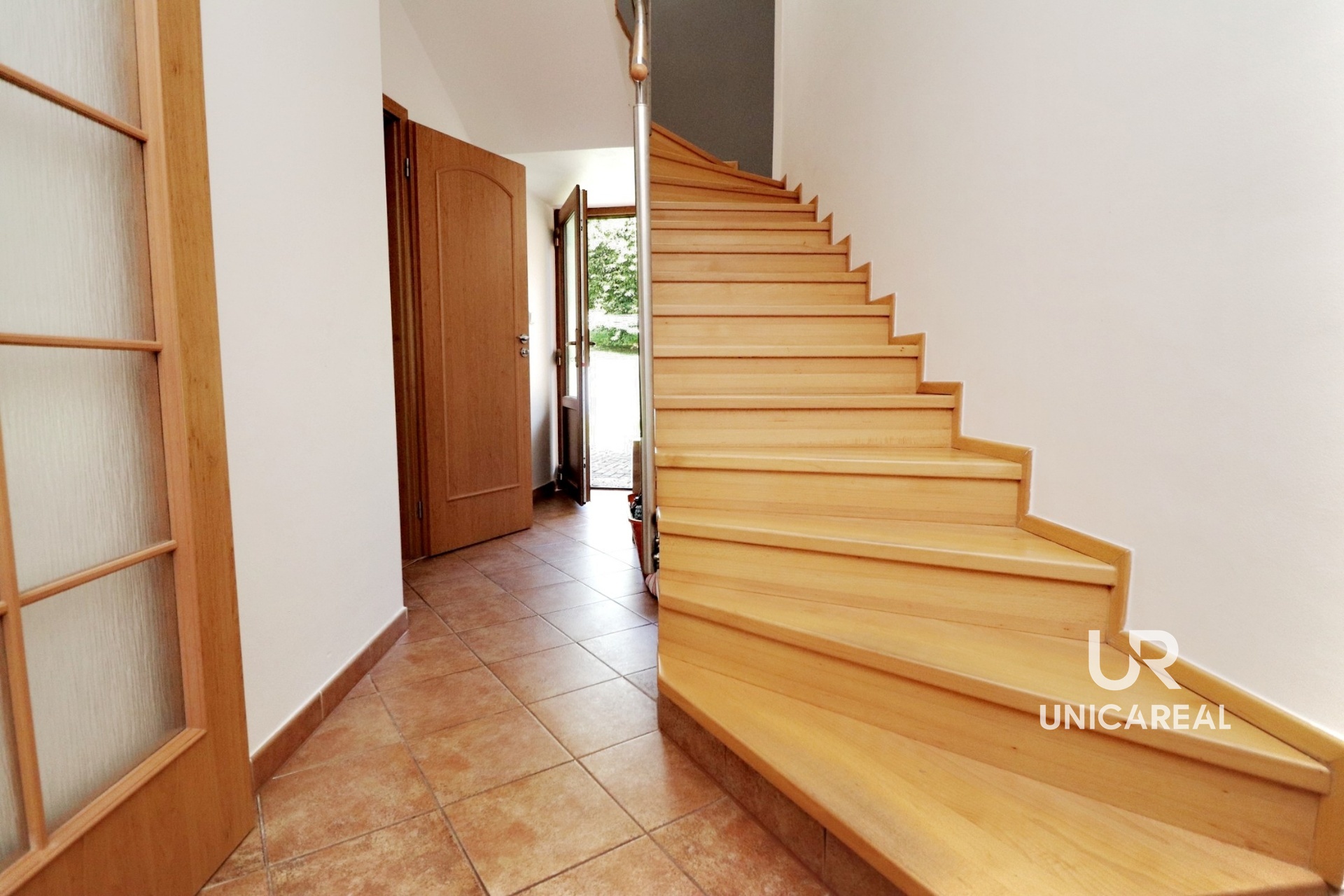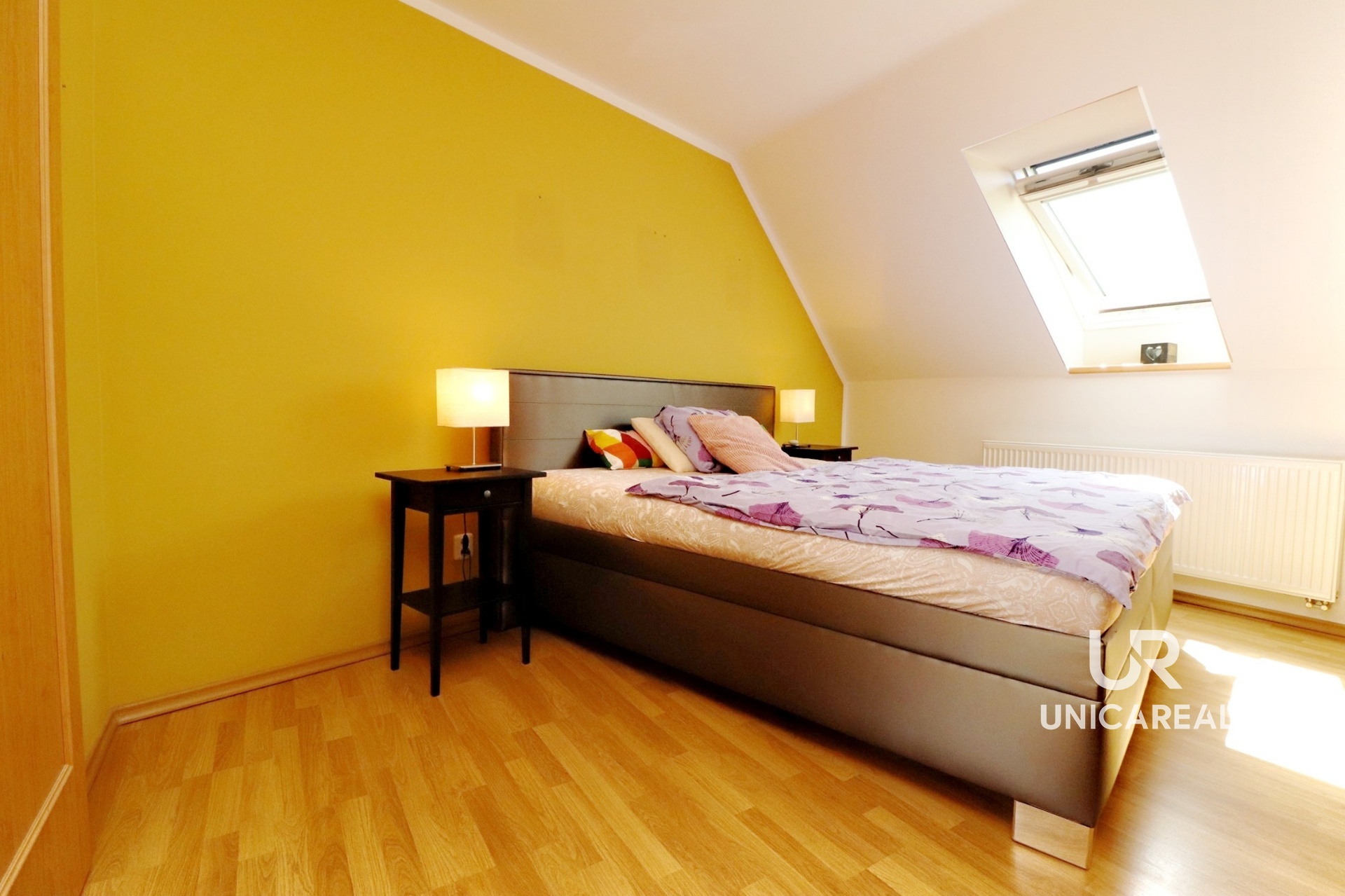Podkroví: chodba 5,85 m2, prostorná koupelna s vanou 7 m2, samostatná toaleta 3,3 m2, tři samostatné pokoje (ložnice – 14,37 m2 se šatnou 8,20 m2 s možností využití i jako pracovna, dětské pokoje 12 m2 a 11,6 m2). V domě je centrální vysavač.
