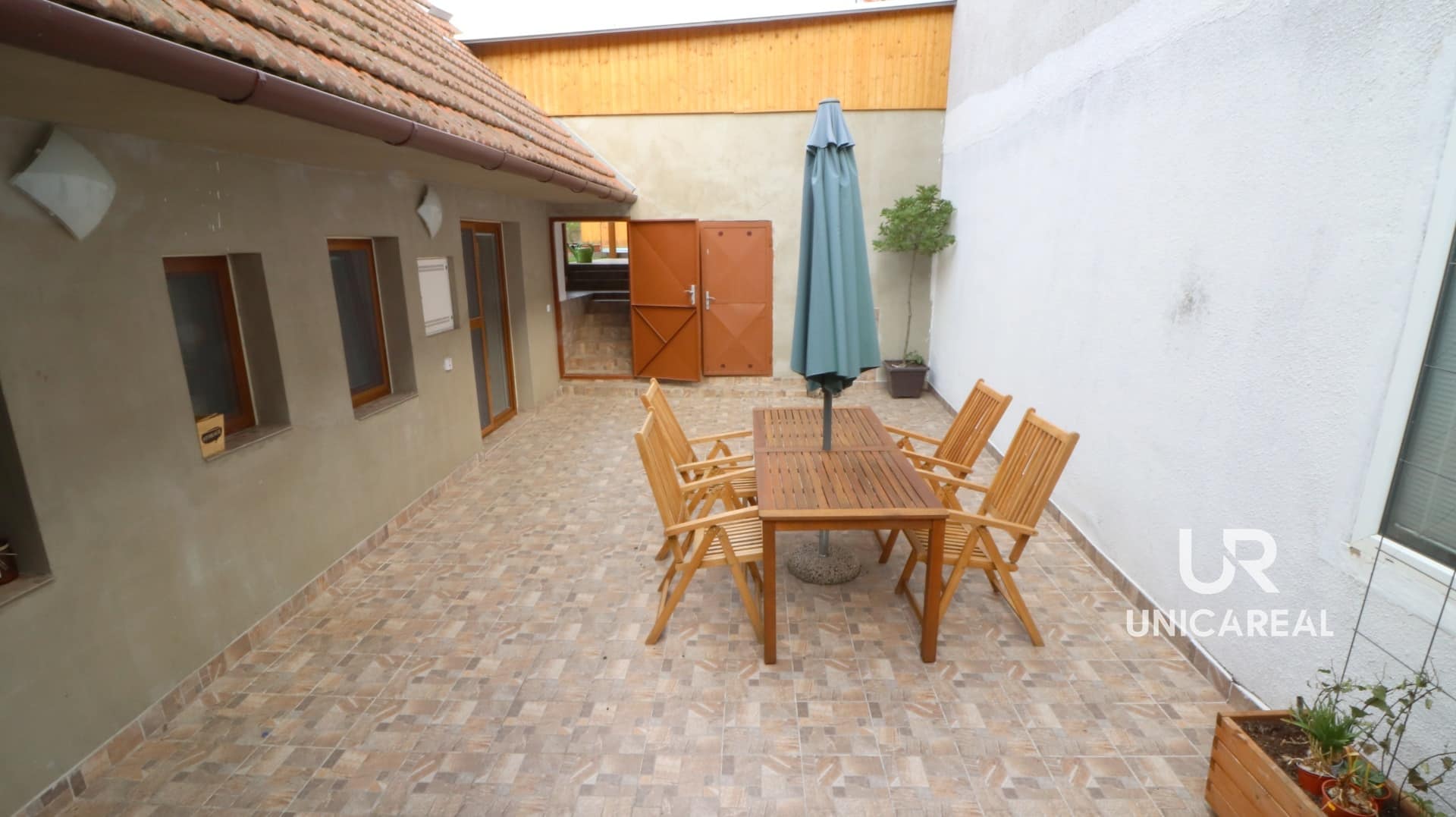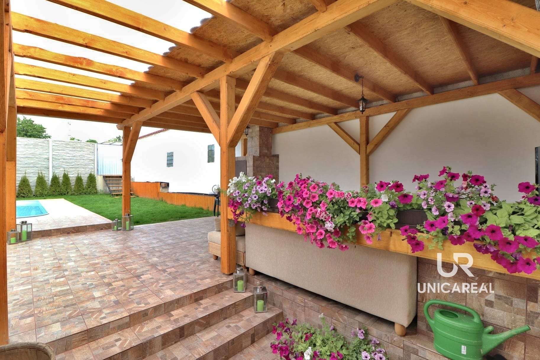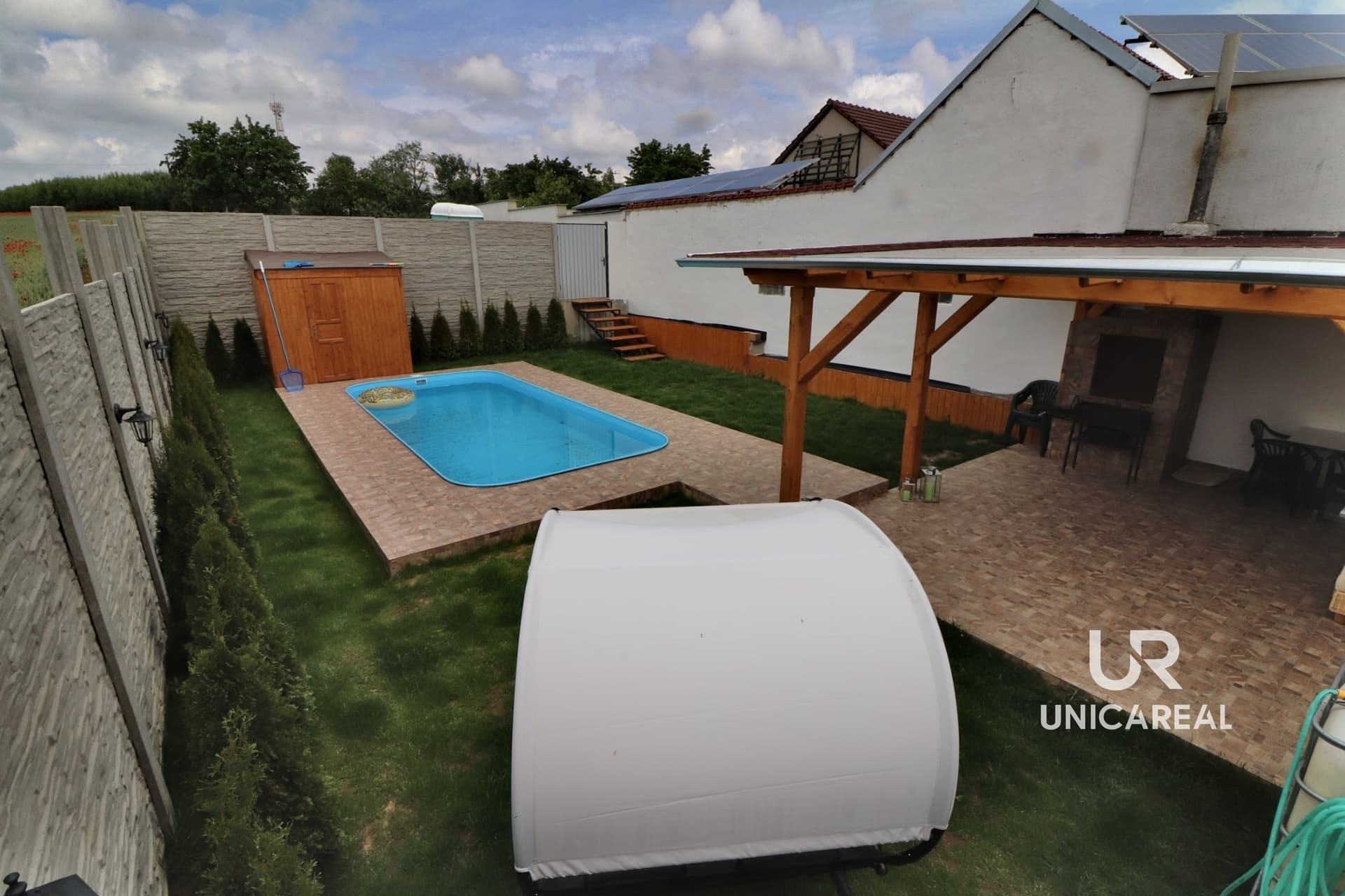 Z obývacího pokoje i ložnice je vstup na uzavřenou část terasy s posezením která navazuje na zahradu s bazénem, dřevěnou pergolou s posezením. Zahrada je nově vysázena okrasnými dřevinami.