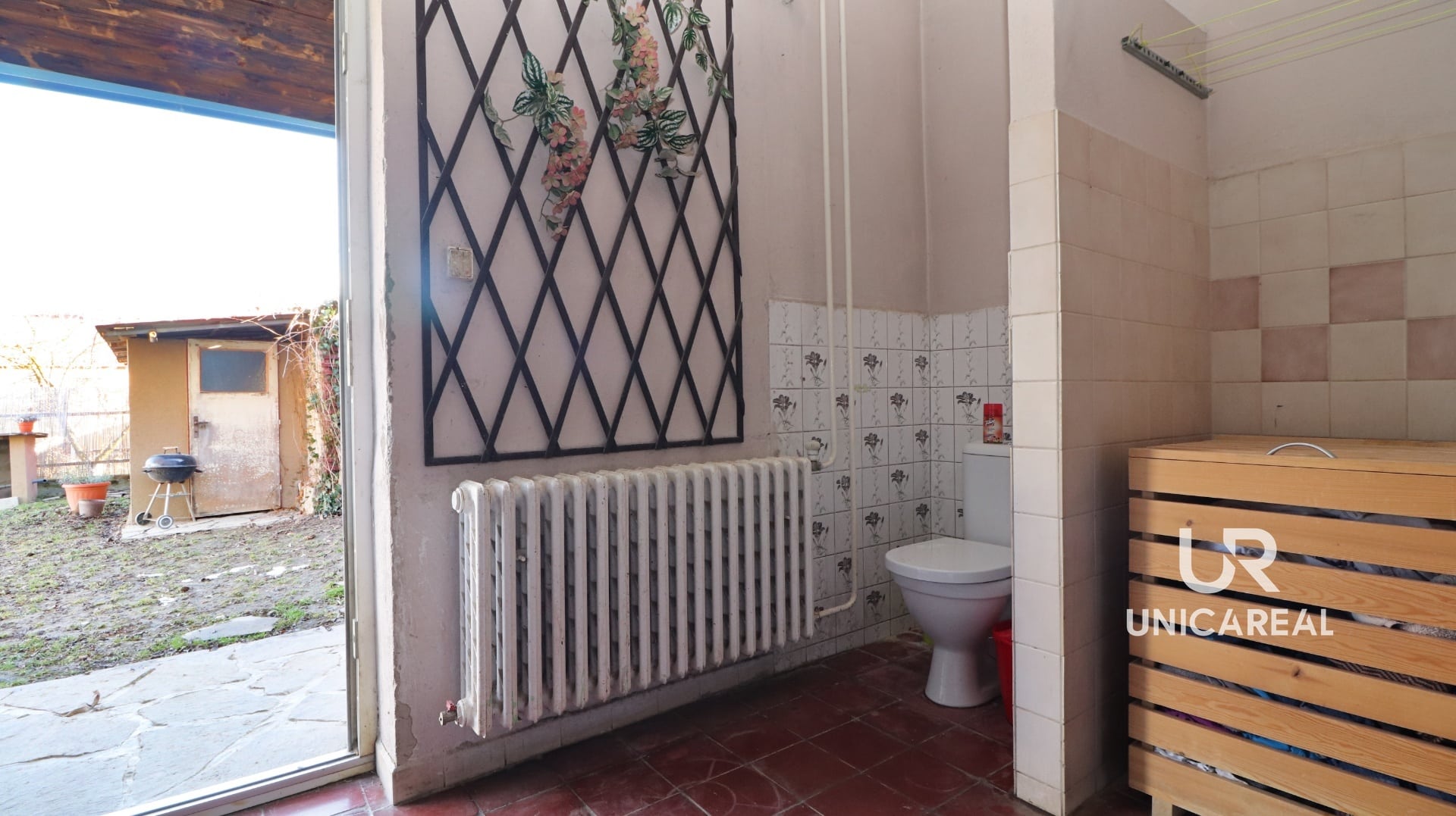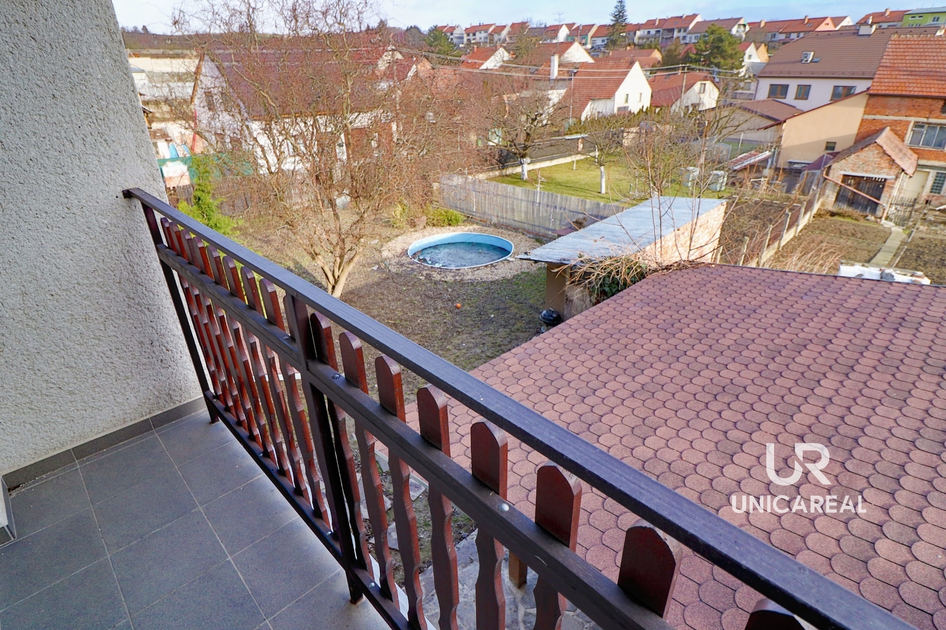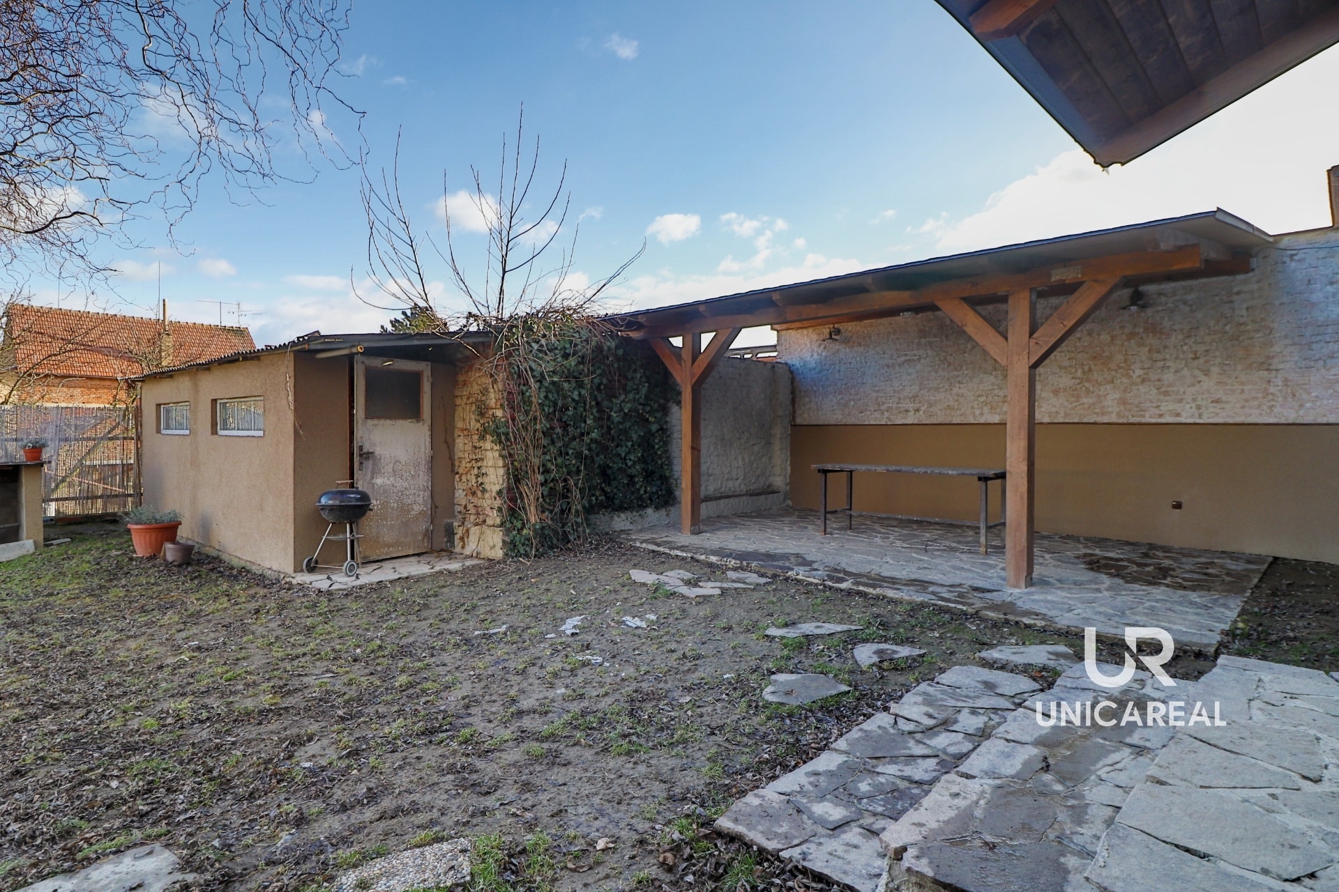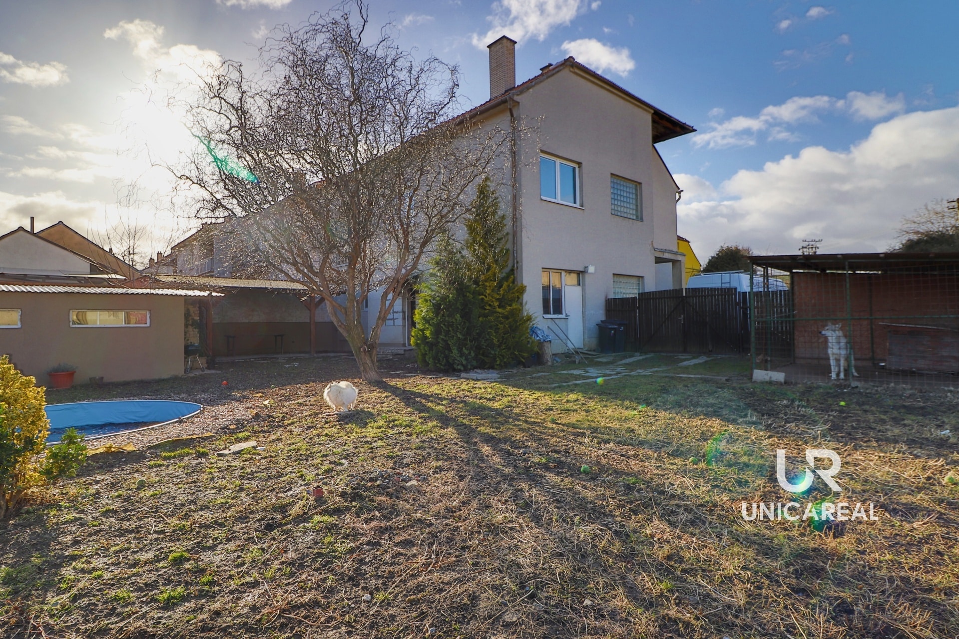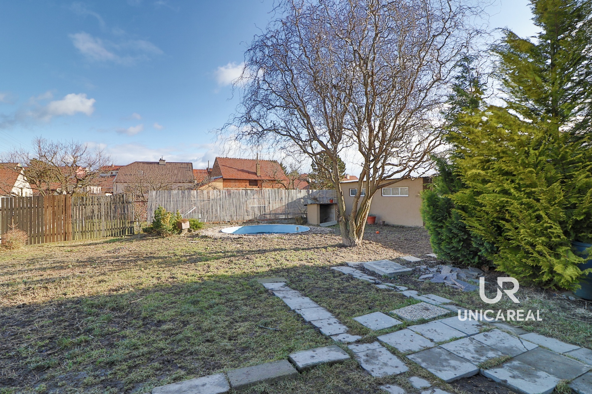 Na zahradě se nachází dřevník , zapuštěný kulatý bazén a nově postavena dřevěná pergola.