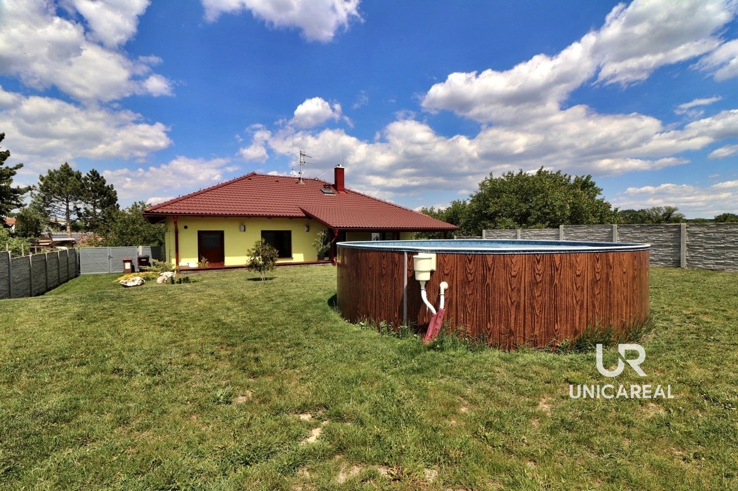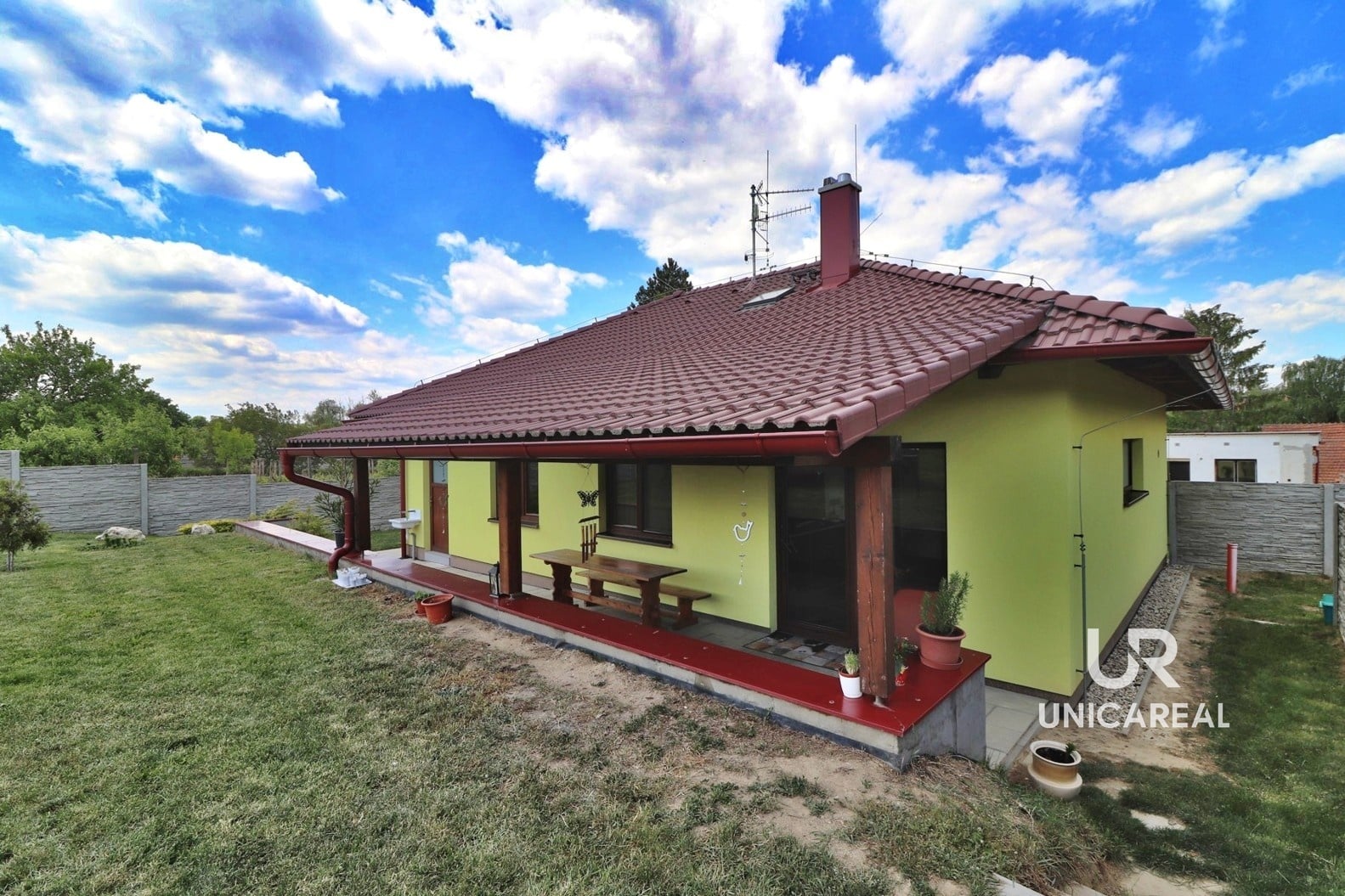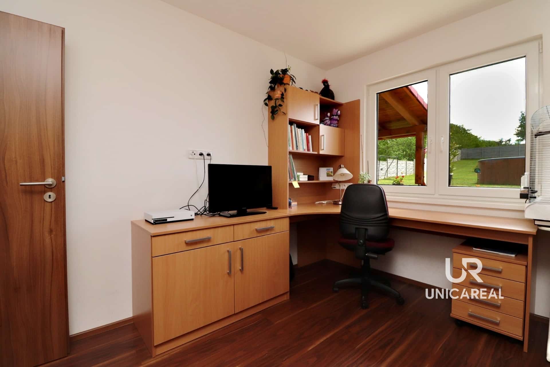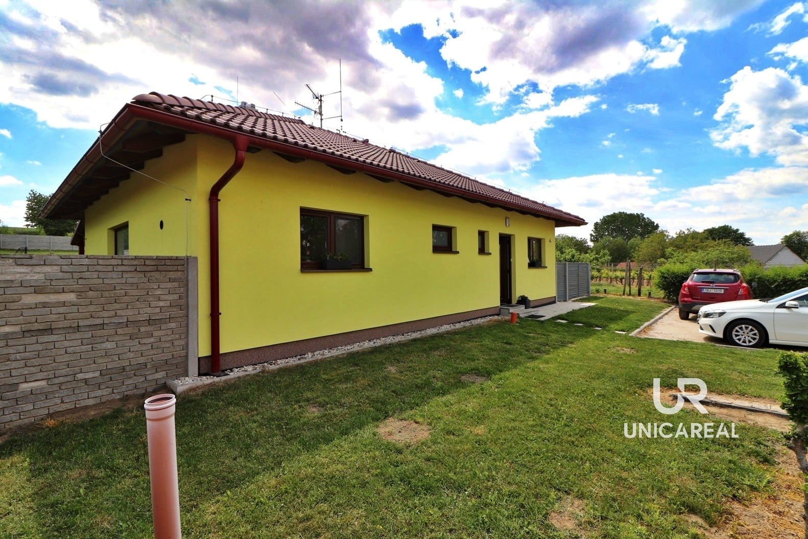 Dispozičně je dům řešen obývacím pokojem s kuchyňským koutem 25,40 m2, útulnou ložnicí s šatní skříní 10 m2, dvěma dětskými pokoji 11,65 m2 a 8,40 m2, dále koupelnou 8,50 m2 včetně vany a sprchového koutu, samostatným WC 2 m2, zádveřím 5 m2 a chodbou 7,20 m2. V tomto moderním bydlení je myšleno i na nepostradatelnou praktickou část jako je šatna a skladová místnost se vstupem ze zahrady. Z obývacího pokoje je vstup francouzským oknem na zastřešenou terasu s výhledem do zahrady s bazénem. Výhodou u domu je funkční studna s dostatkem užitkové vody.