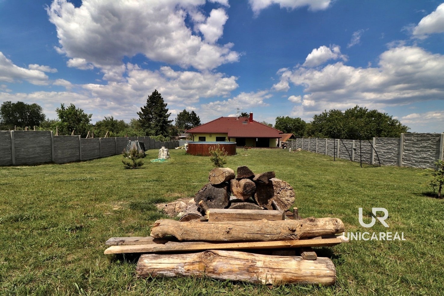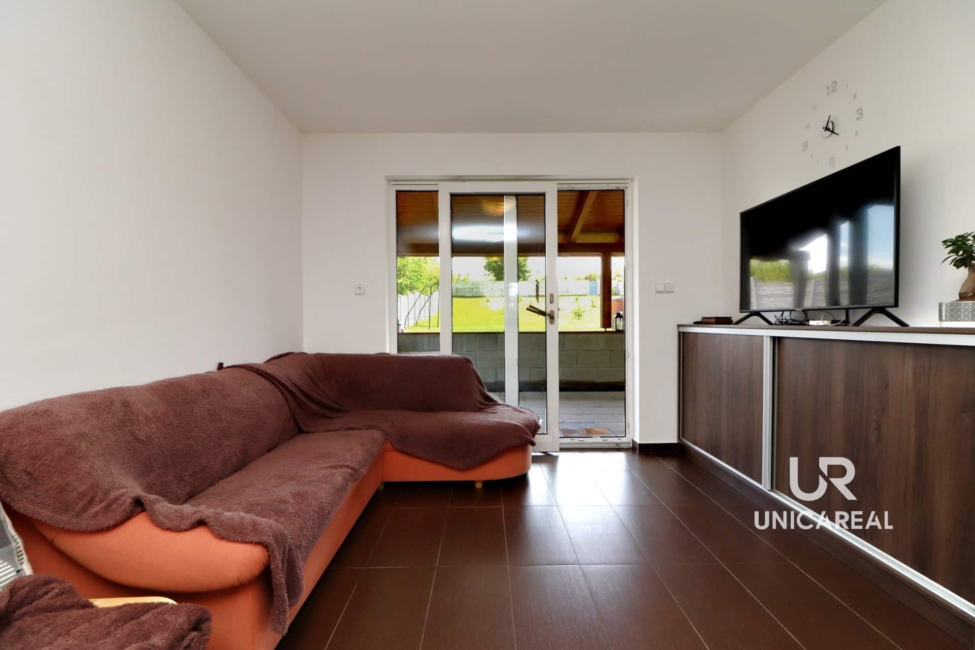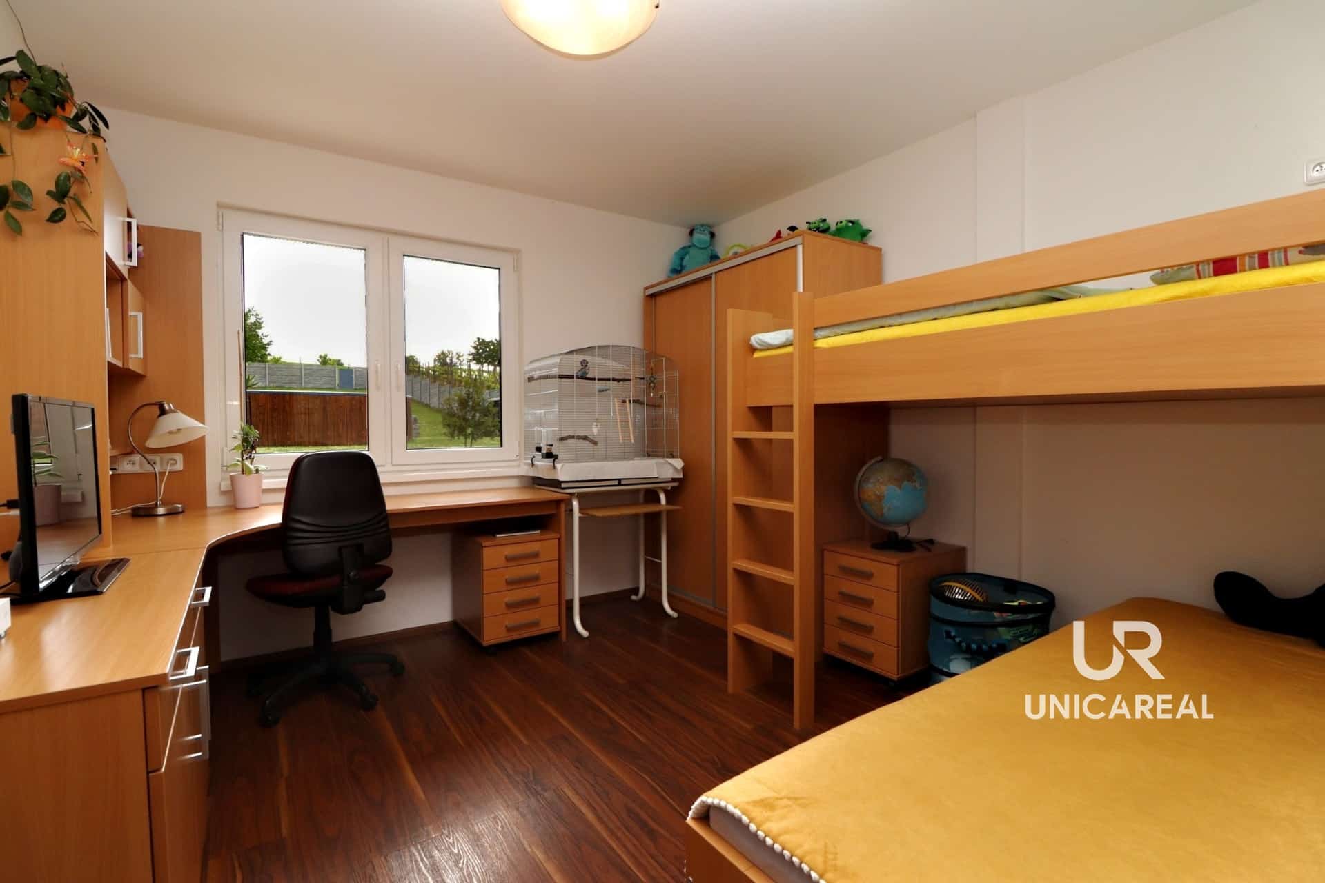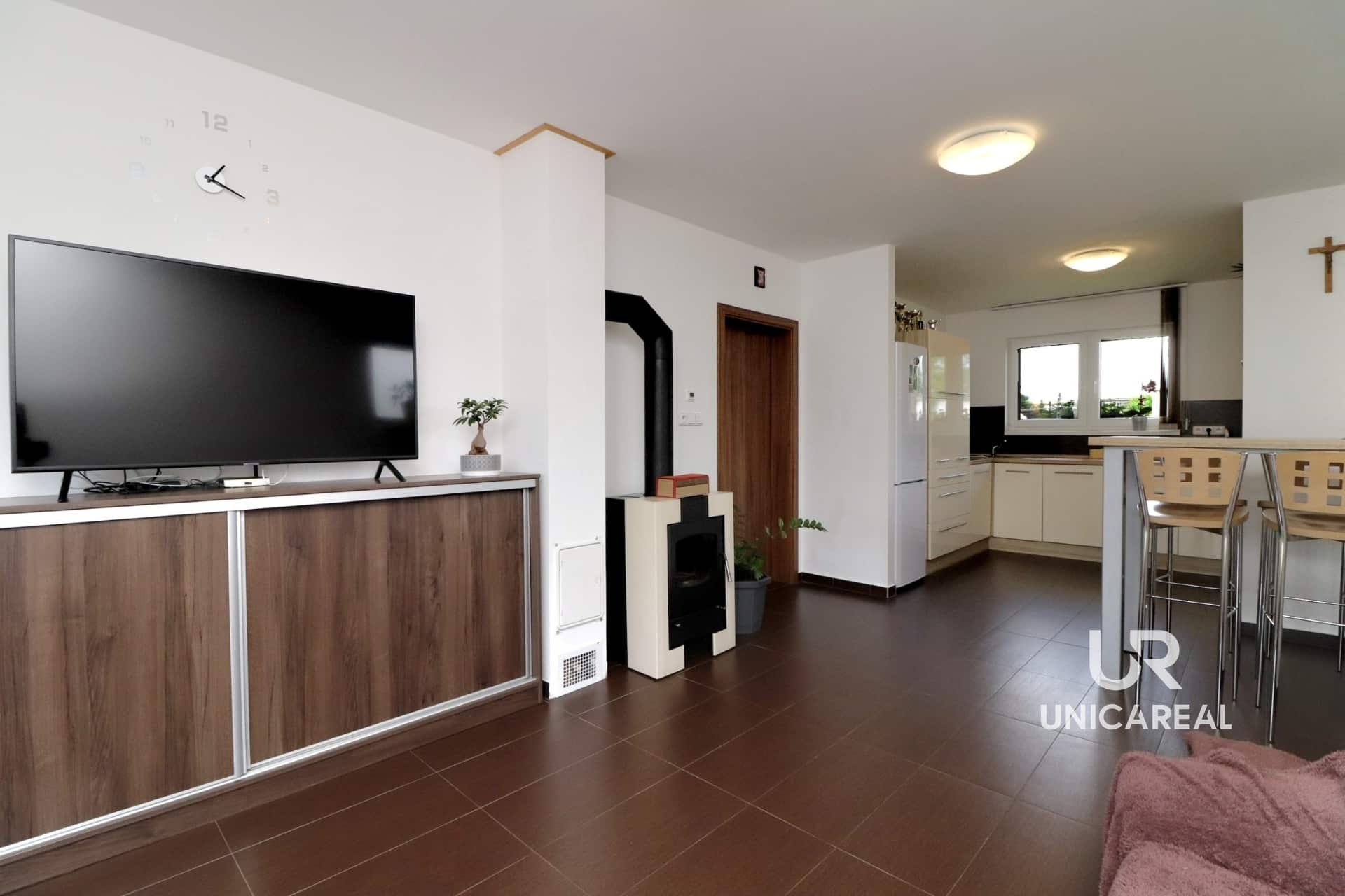 Dispozičně je dům řešen obývacím pokojem s kuchyňským koutem 25,40 m2, útulnou ložnicí s šatní skříní 10 m2, dvěma dětskými pokoji 11,65 m2 a 8,40 m2, dále koupelnou 8,50 m2 včetně vany a sprchového koutu, samostatným WC 2 m2, zádveřím 5 m2 a chodbou 7,20 m2. V tomto moderním bydlení je myšleno i na nepostradatelnou praktickou část jako je šatna a skladová místnost se vstupem ze zahrady. Z obývacího pokoje je vstup francouzským oknem na zastřešenou terasu s výhledem do zahrady s bazénem. Výhodou u domu je funkční studna s dostatkem užitkové vody.