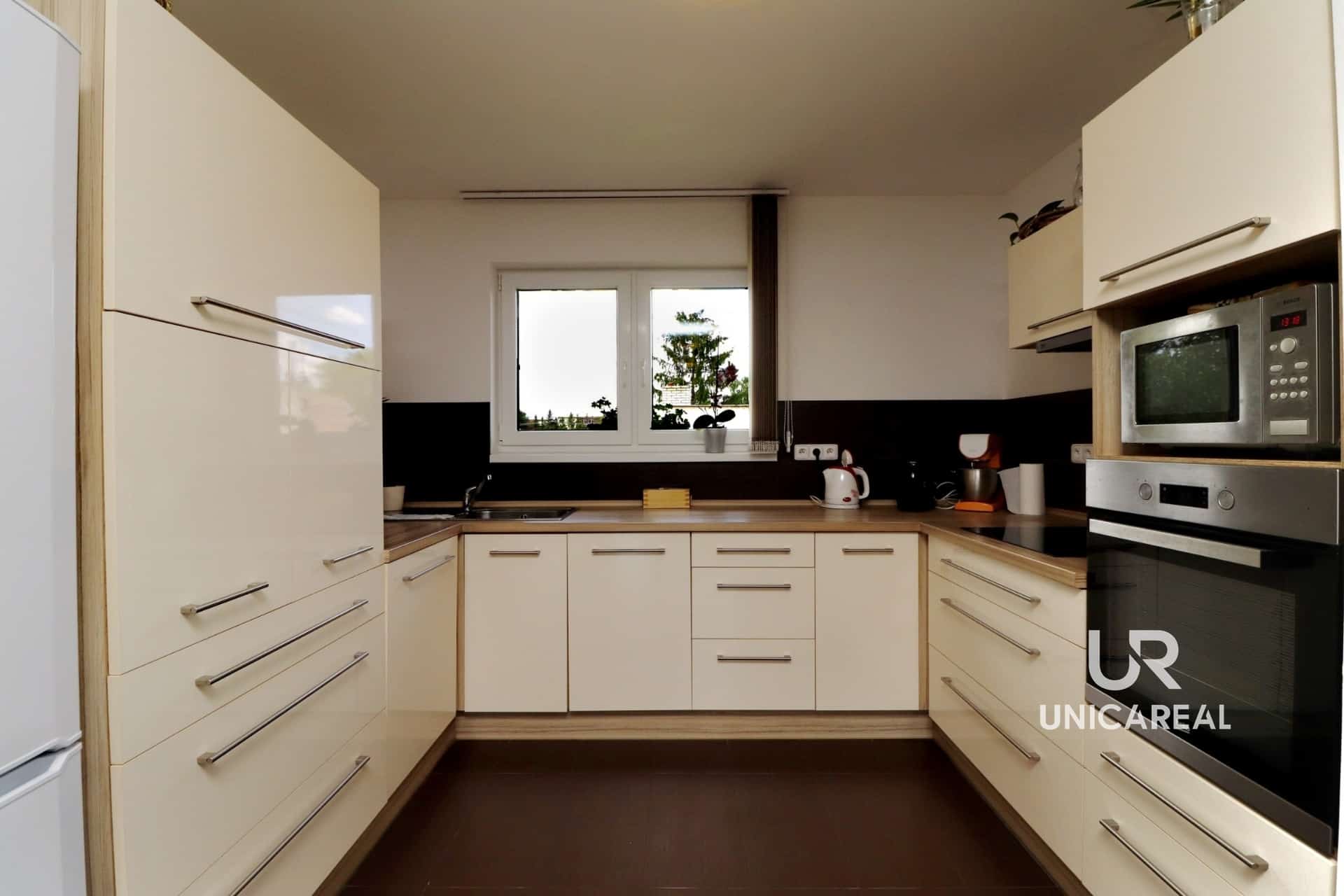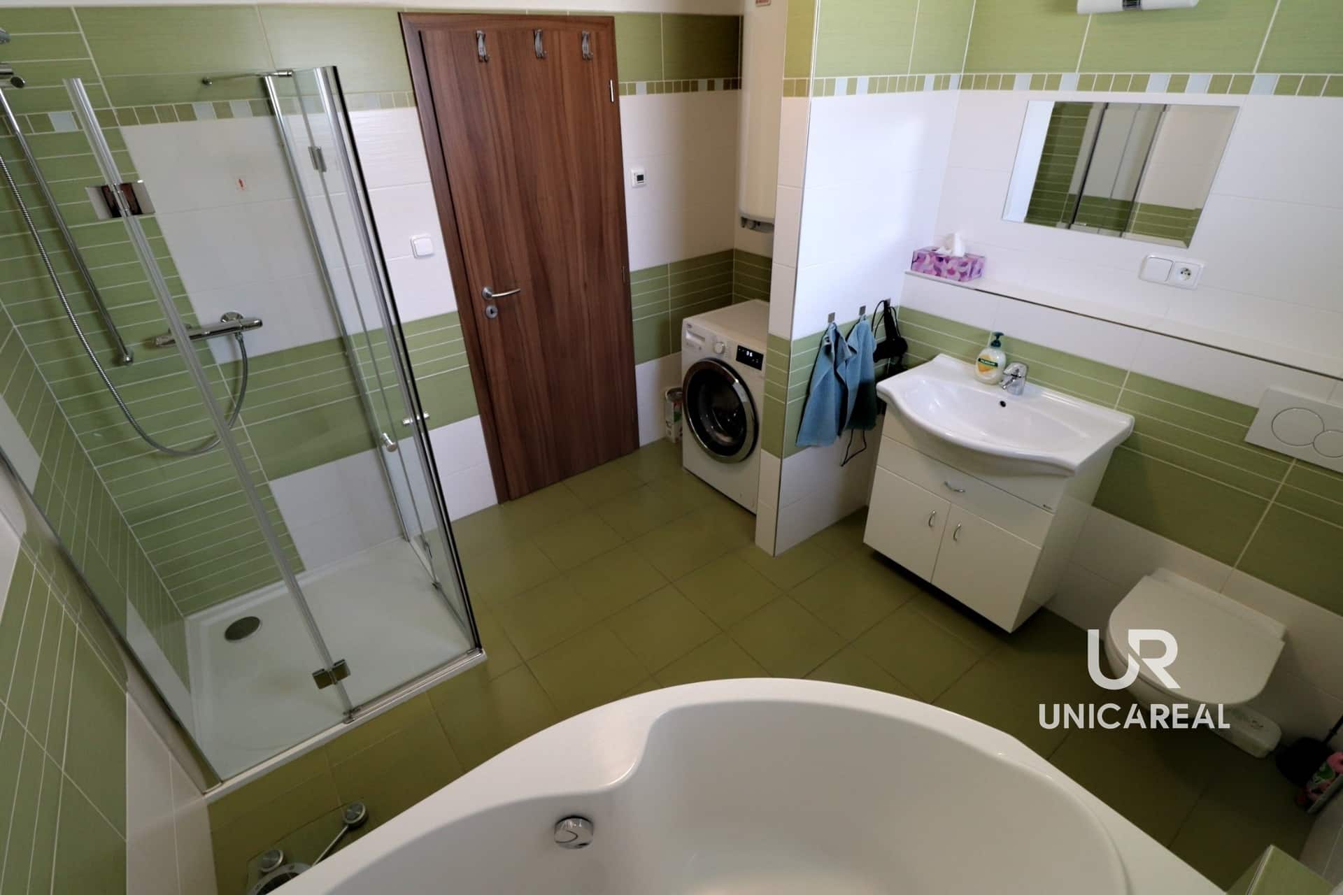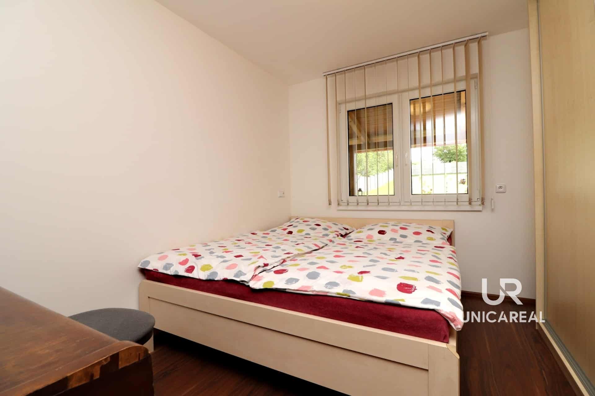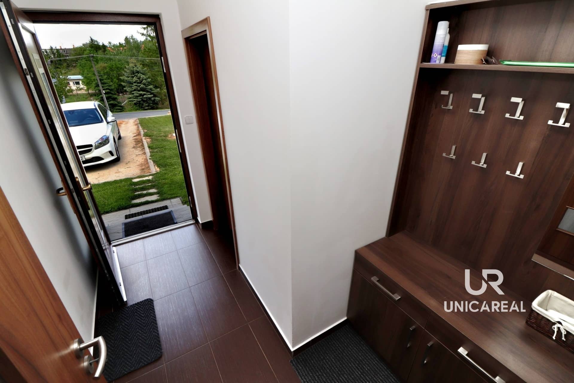 Dispozičně je dům řešen obývacím pokojem s kuchyňským koutem 25,40 m2, útulnou ložnicí s šatní skříní 10 m2, dvěma dětskými pokoji 11,65 m2 a 8,40 m2, dále koupelnou 8,50 m2 včetně vany a sprchového koutu, samostatným WC 2 m2, zádveřím 5 m2 a chodbou 7,20 m2. V tomto moderním bydlení je myšleno i na nepostradatelnou praktickou část jako je šatna a skladová místnost se vstupem ze zahrady. Z obývacího pokoje je vstup francouzským oknem na zastřešenou terasu s výhledem do zahrady s bazénem. Výhodou u domu je funkční studna s dostatkem užitkové vody.