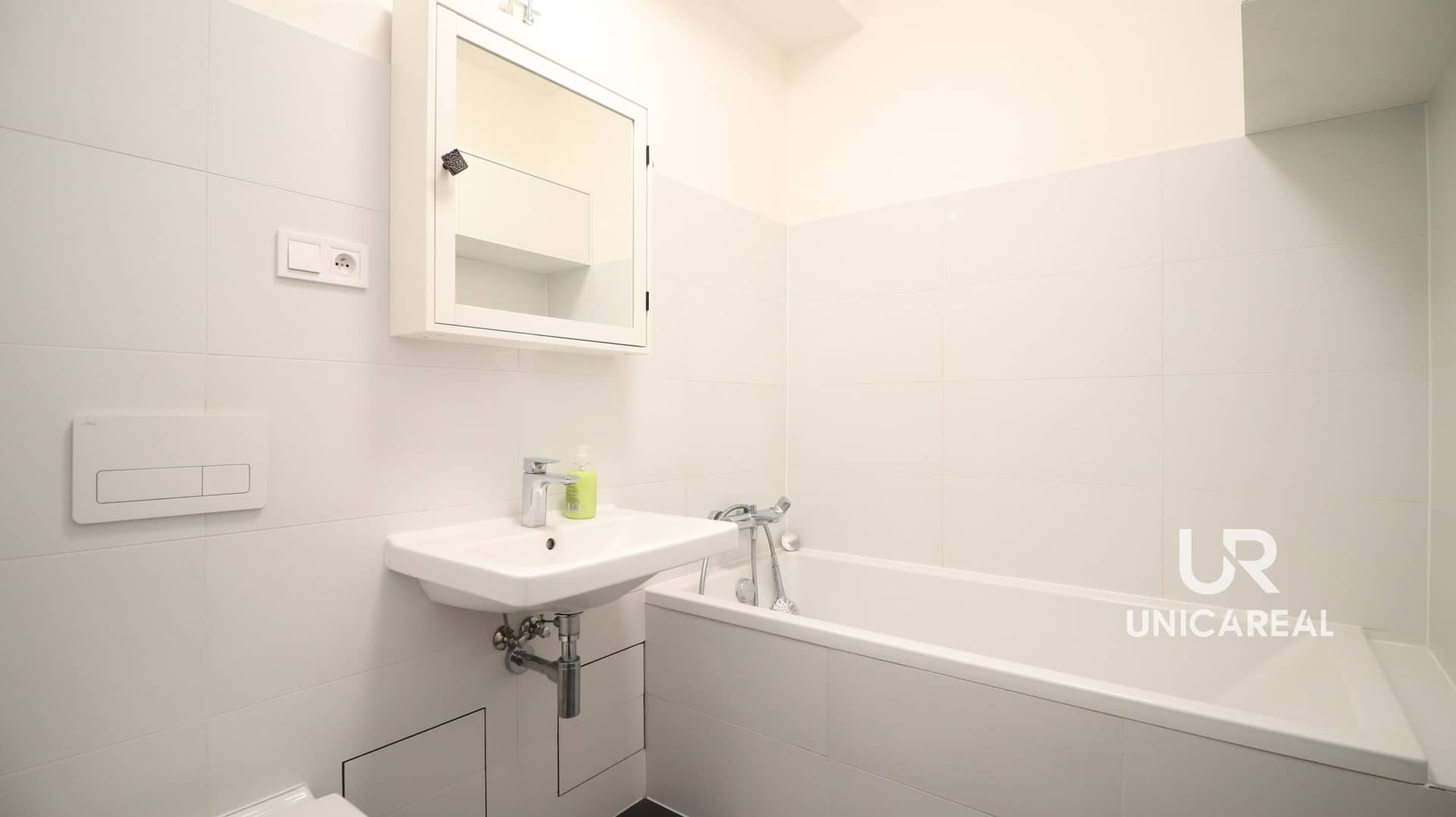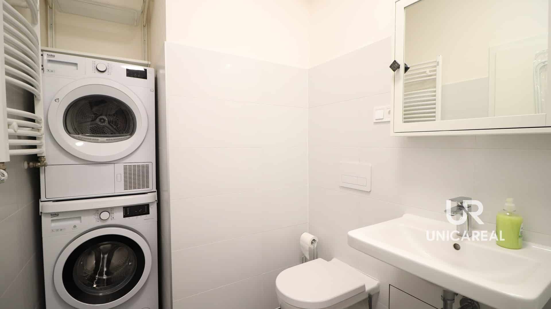 Prostorná koupelna zaujme vanou , umyvadlem, toaletou i nainstalovanou pračkou a sušičkou.