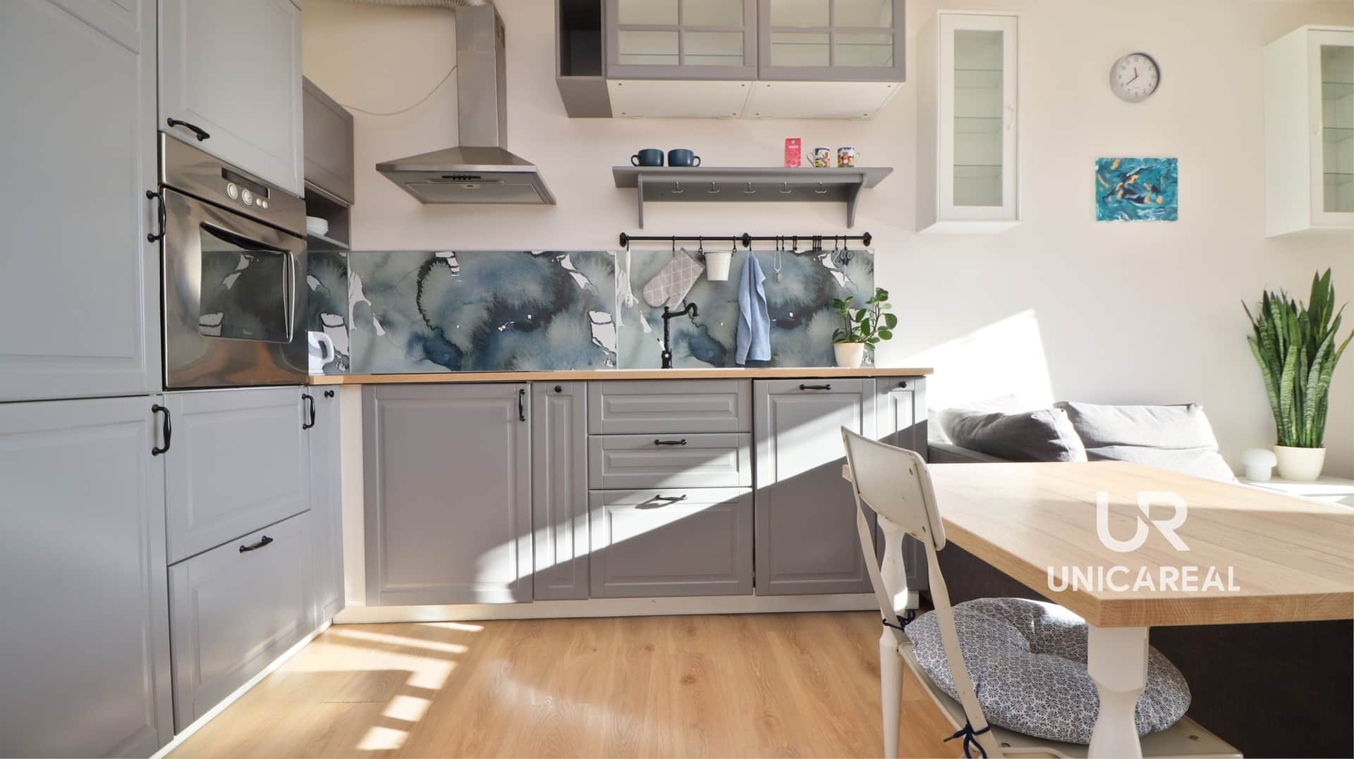 Plně vybavena kuchyňská linka s vestavěnými spotřebiči (myčka, varná deska, digestoř, trouba, lednice s mrazákem), jídelním stolem a židlemi.