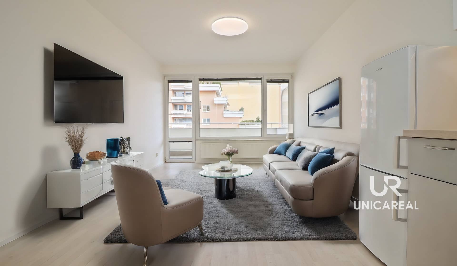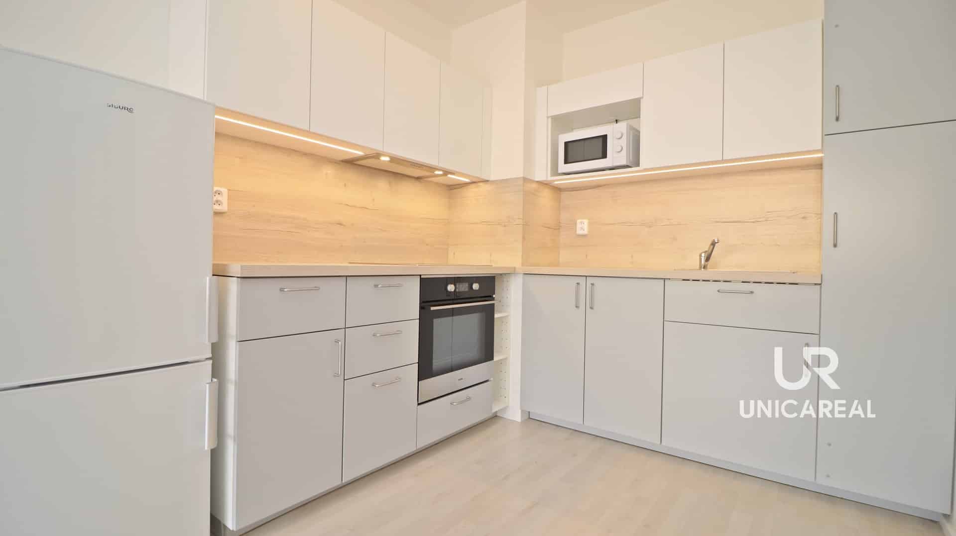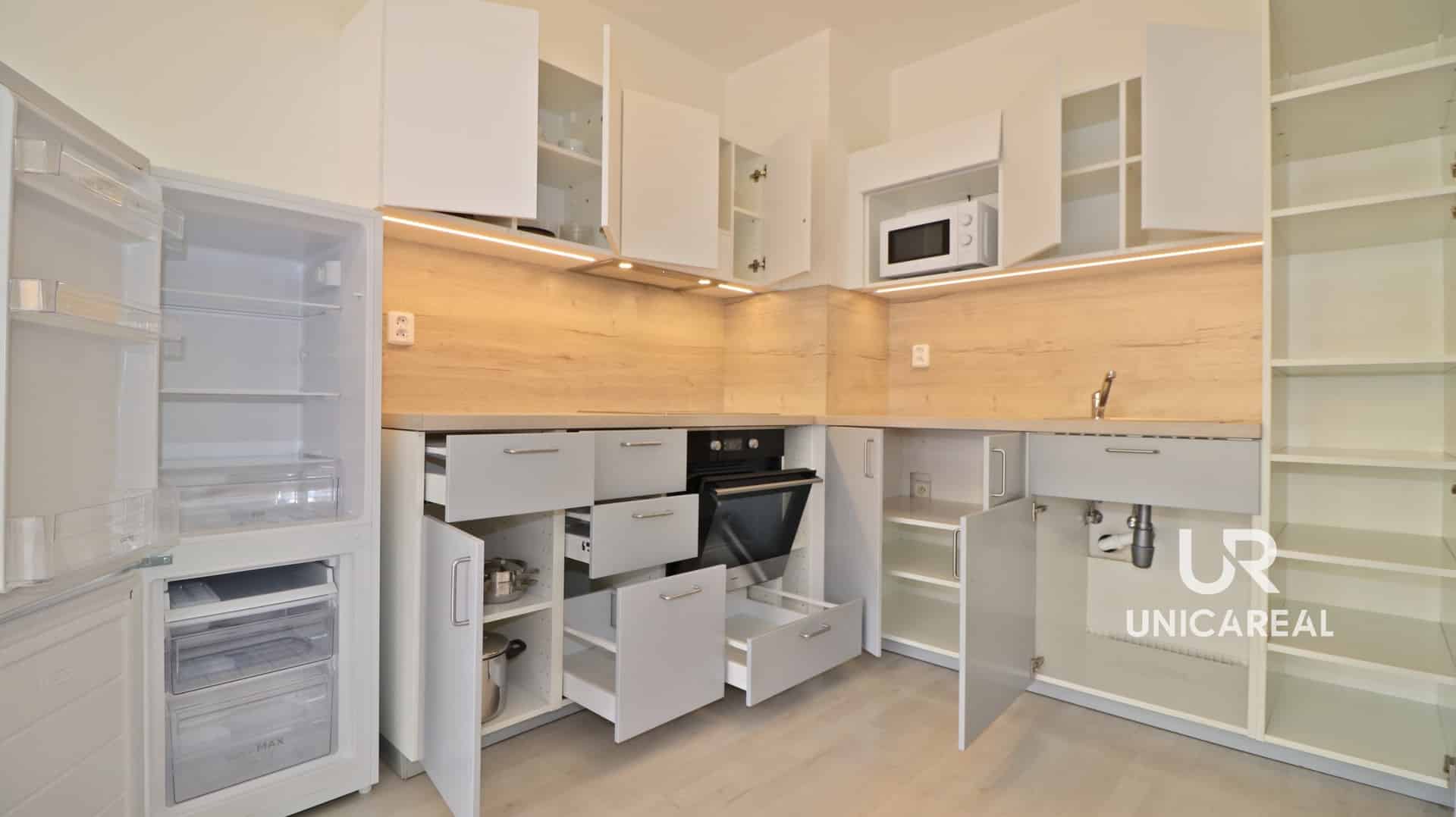 Dominantní místností je obývací pokoj 20 m2 s uživatelsky přívětivou novou kuchyní, která je plně vybavena spotřebiči, včetně trouby, lednice, mikrovlnné trouby, varné desky s digestoří i nádobím, a s přímým vstupem na terasu.